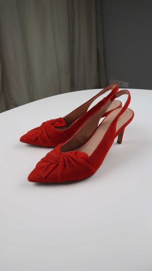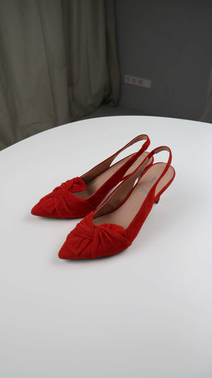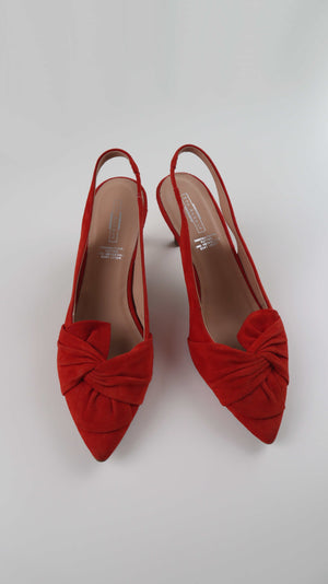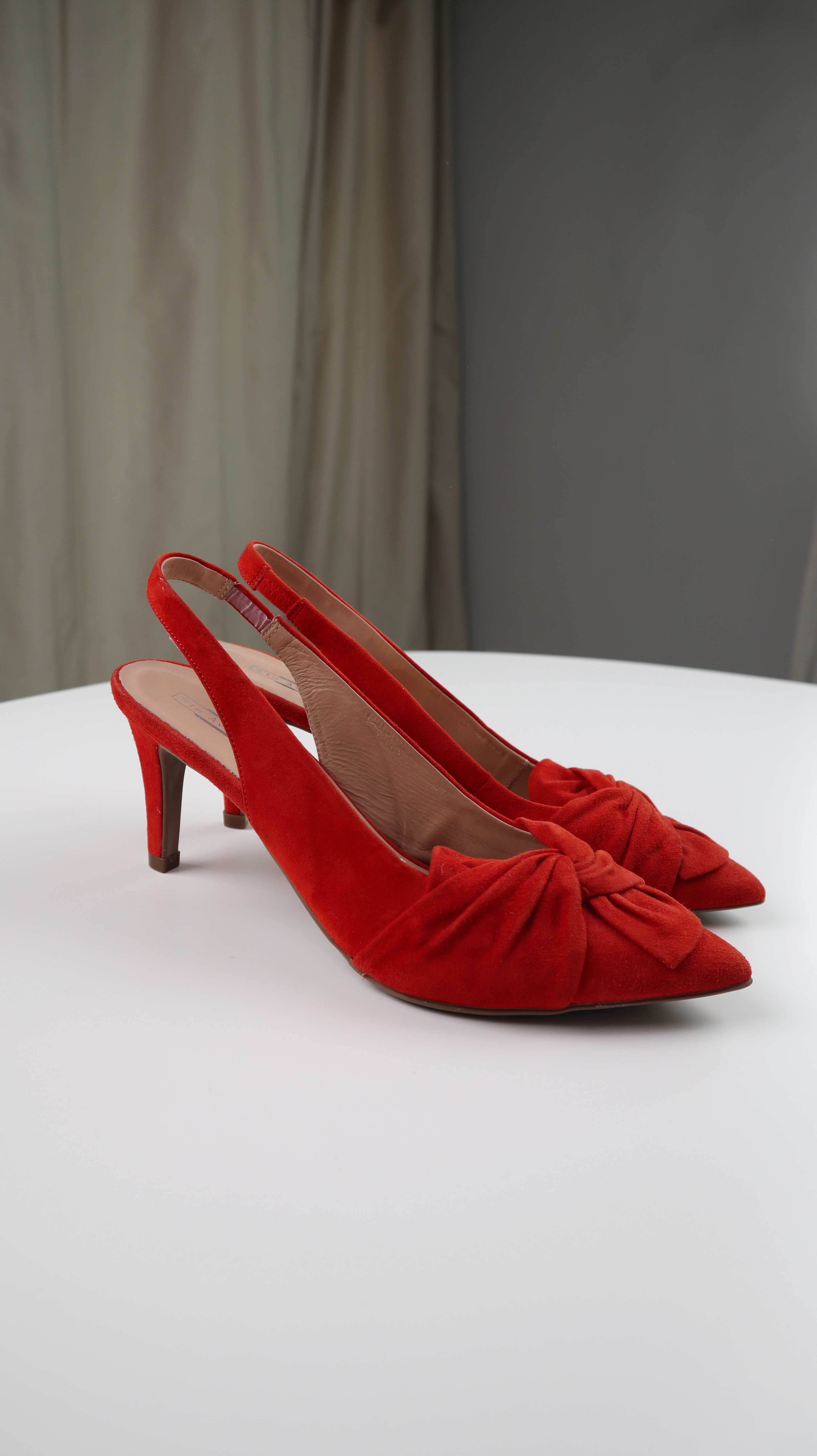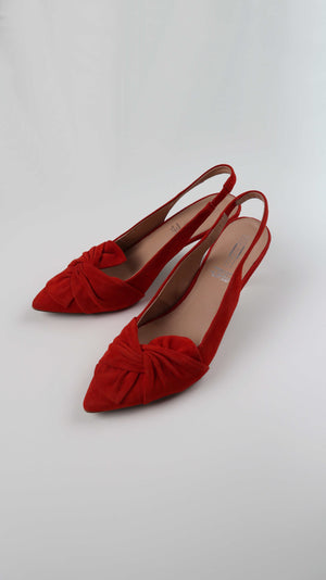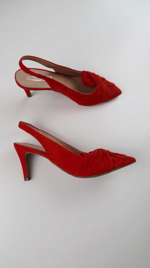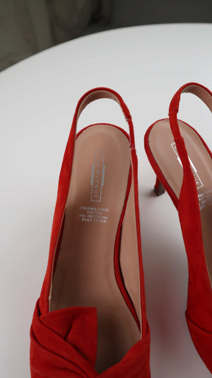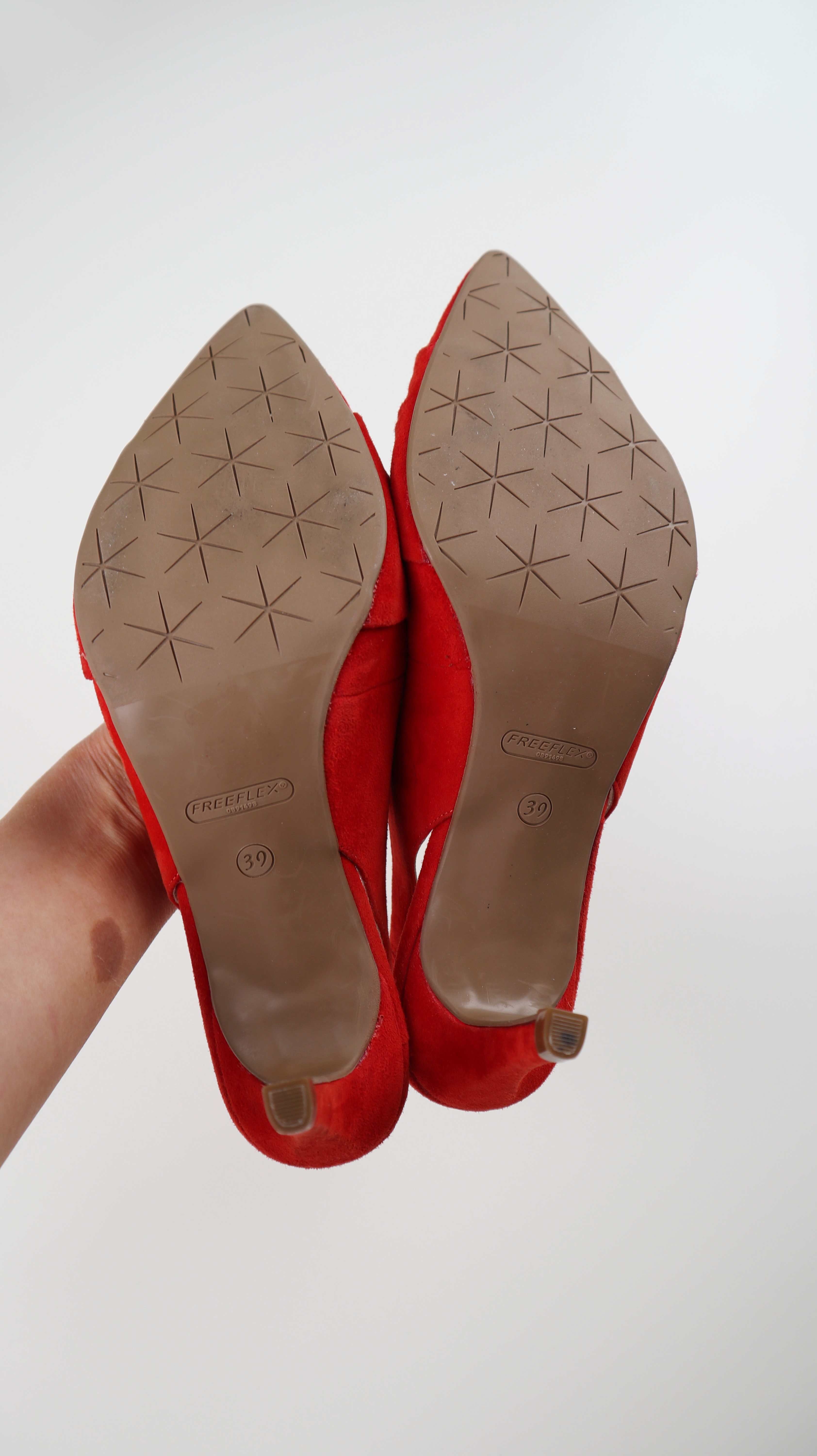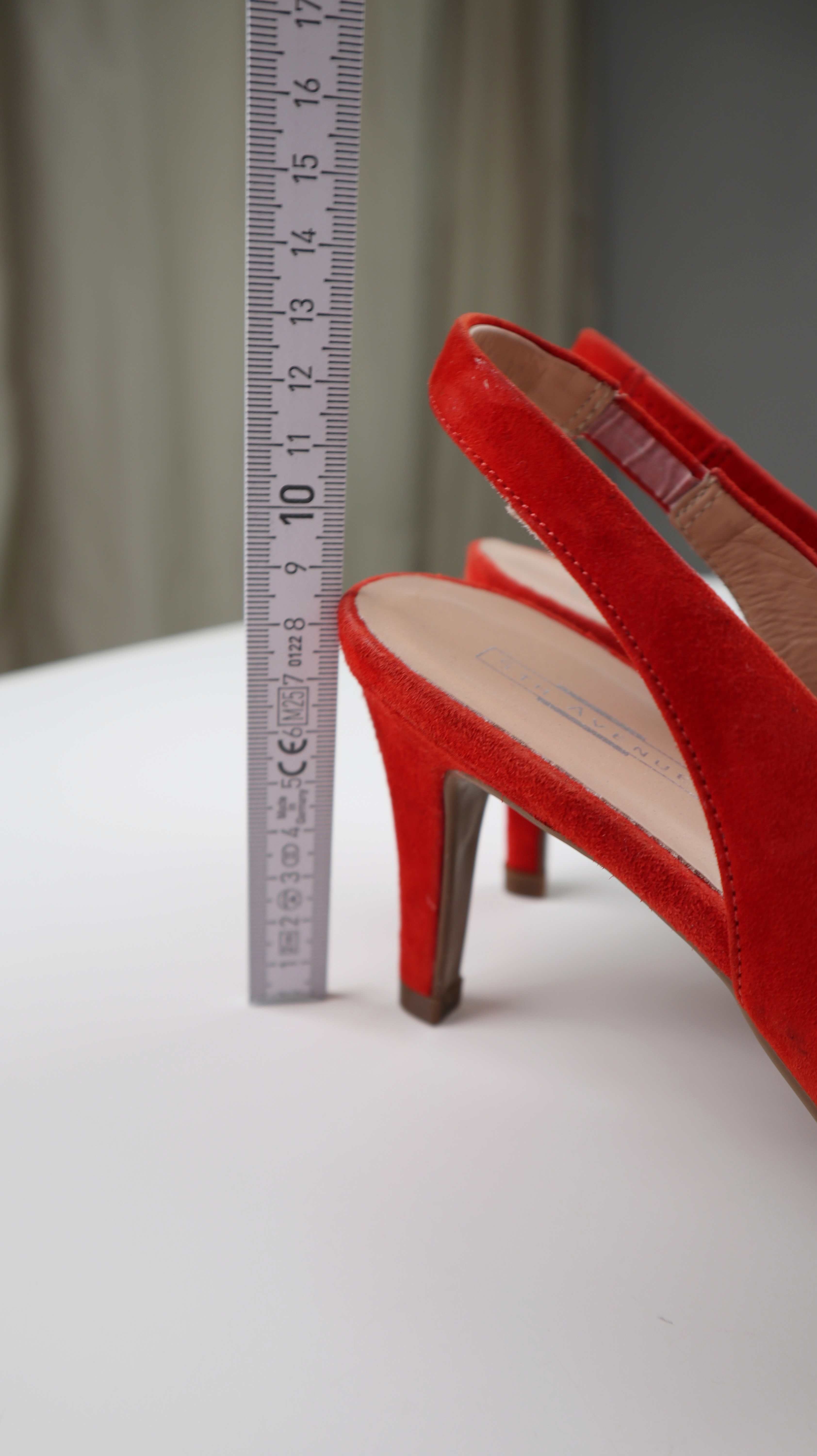 Rote Wildlederheels in einer 39. Der Absatz ist mittelhoch und sie sind sling back. Plus Versand