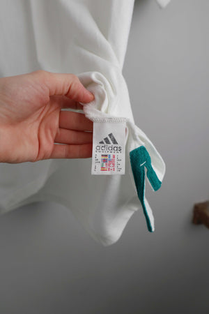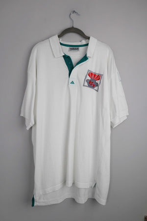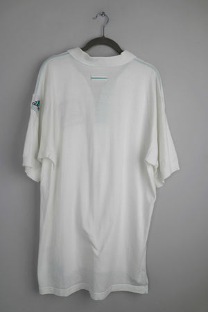 Weißes Poloshirt von Adidas. Es ist true Vintage, die Größenangabe ist etwas verwaschen. Es passt einer L. 58 cm Achselweite und 74 cm Länge. Plus Versand