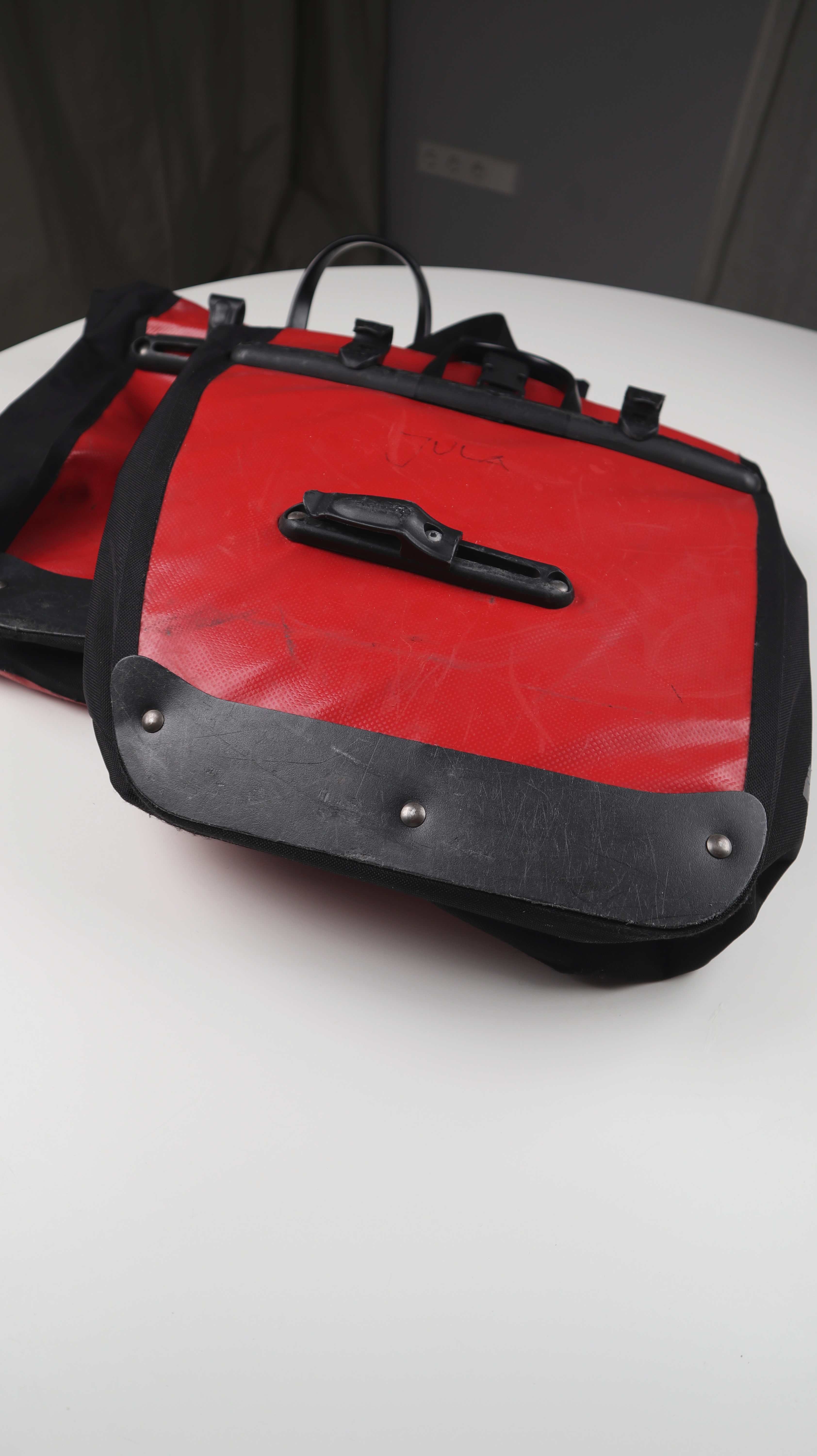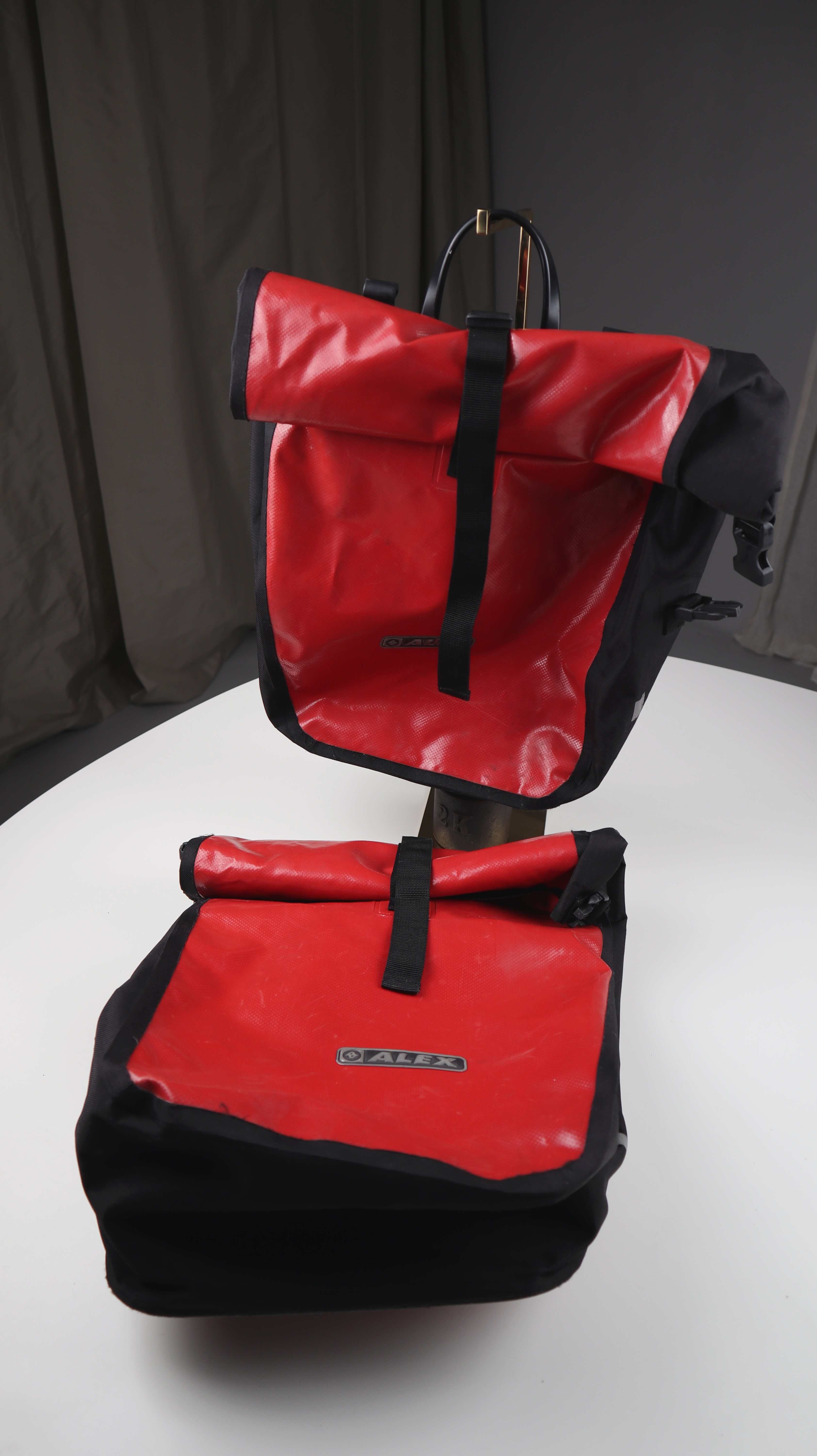 Set von zwei Satteltaschen von Alex. Normal genutzt, bei beiden steht auf der Rückseite ein Name. Innen die Plastikverschaltung ist leicht gebrochen, dennoch tadellos nutzbar und klammbar an ein Fahrrad. Plus Versand