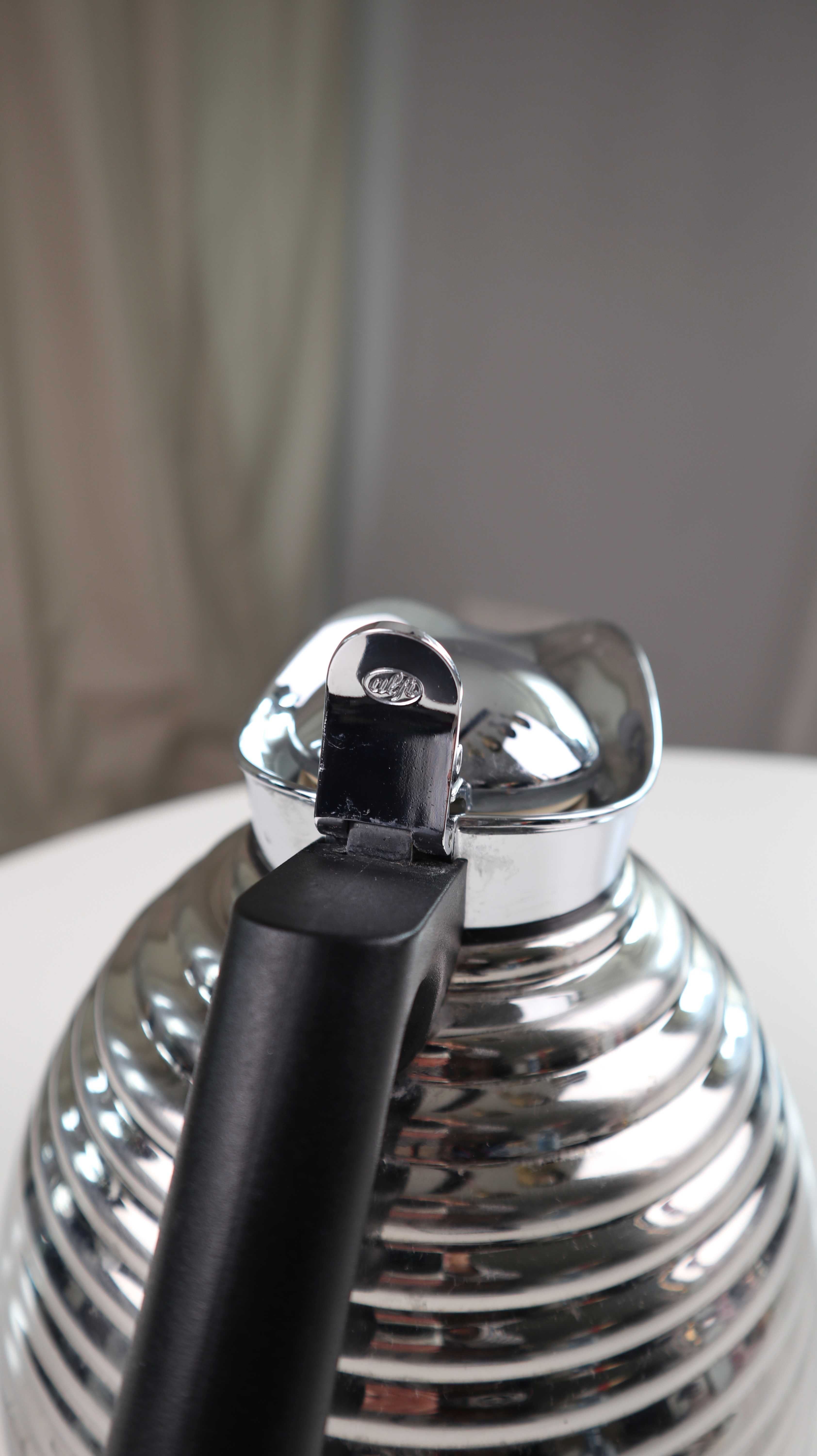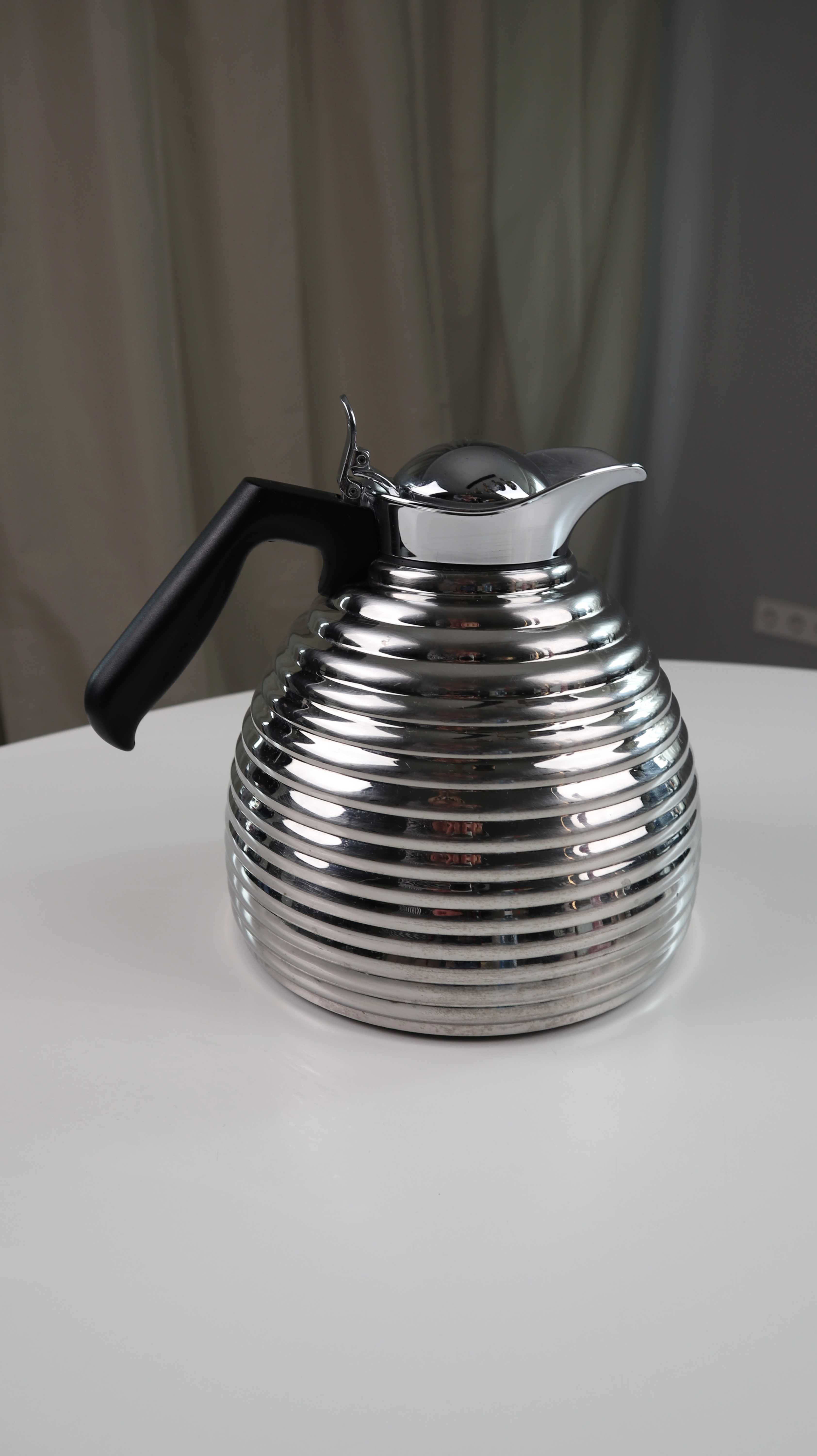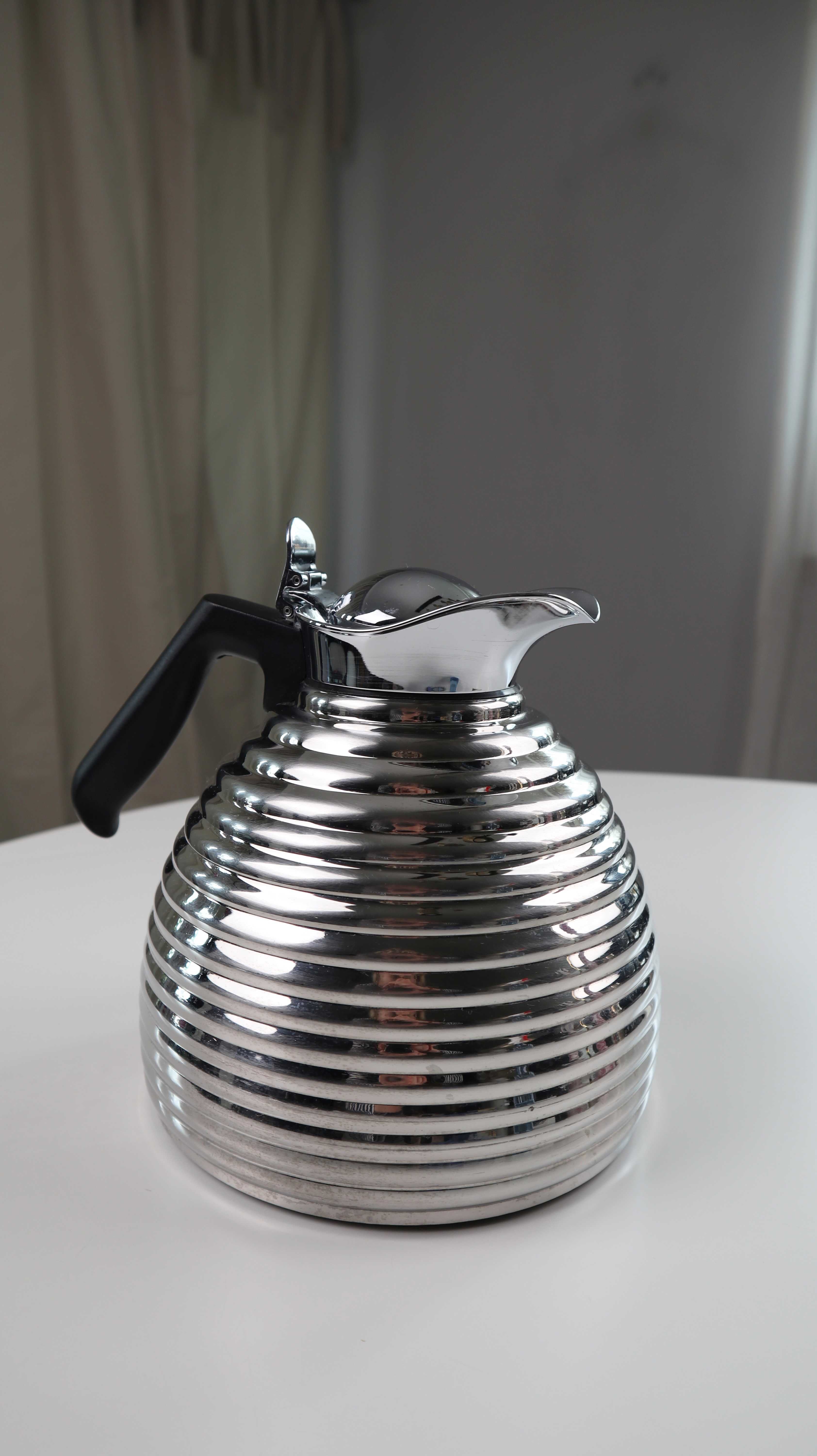 Silberne Teekanne von Alfi. Sie funktioniert tadellos - durch schwarzen Tee ist die Gummierung an der Dichtung oben verfärbt, siehe Fotos.