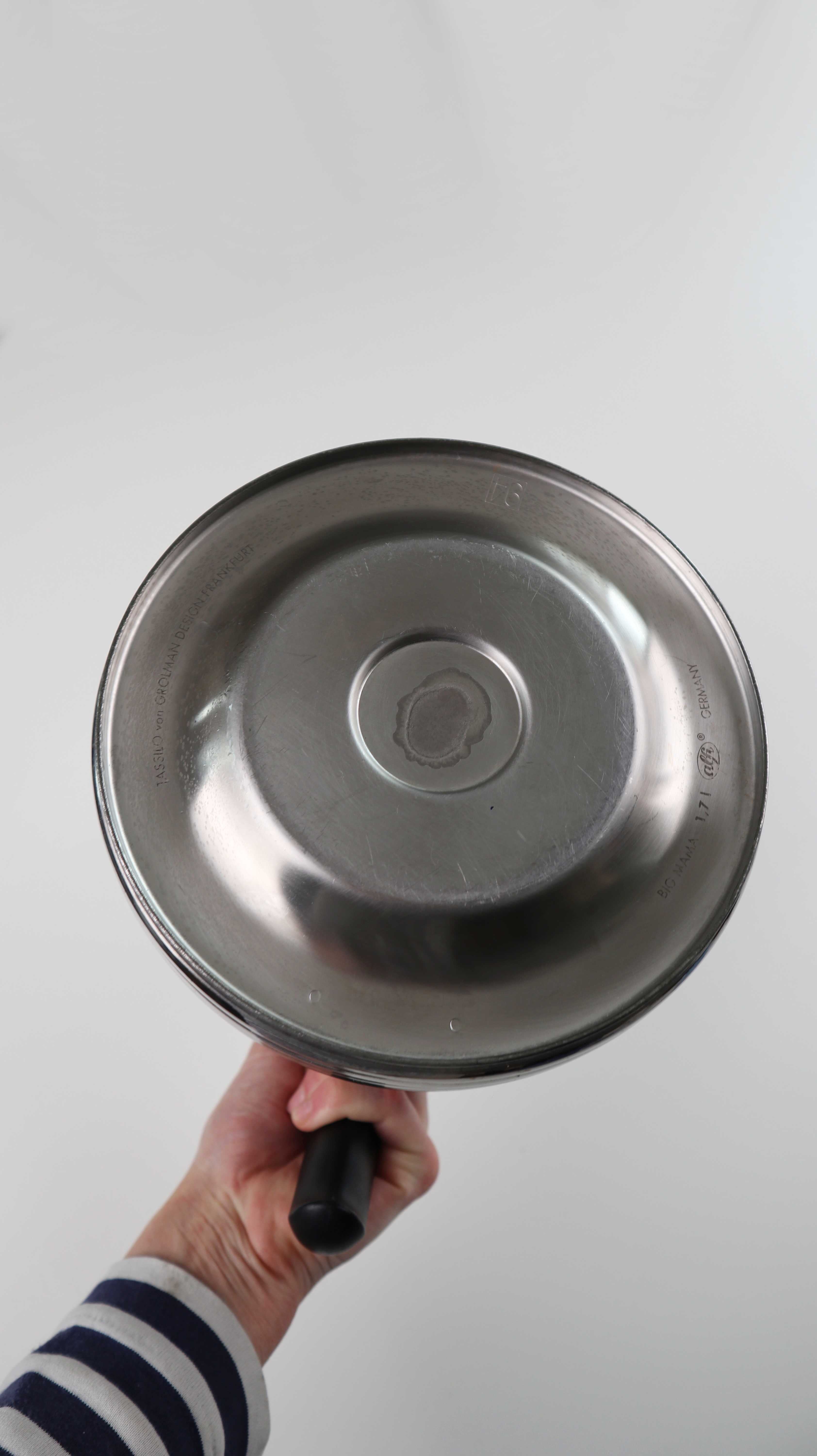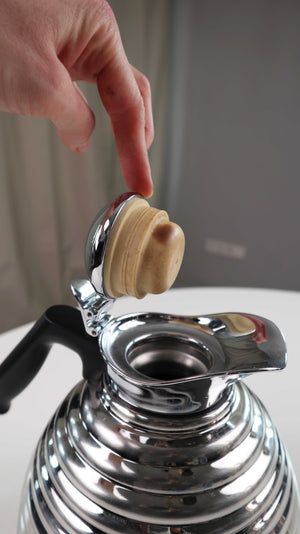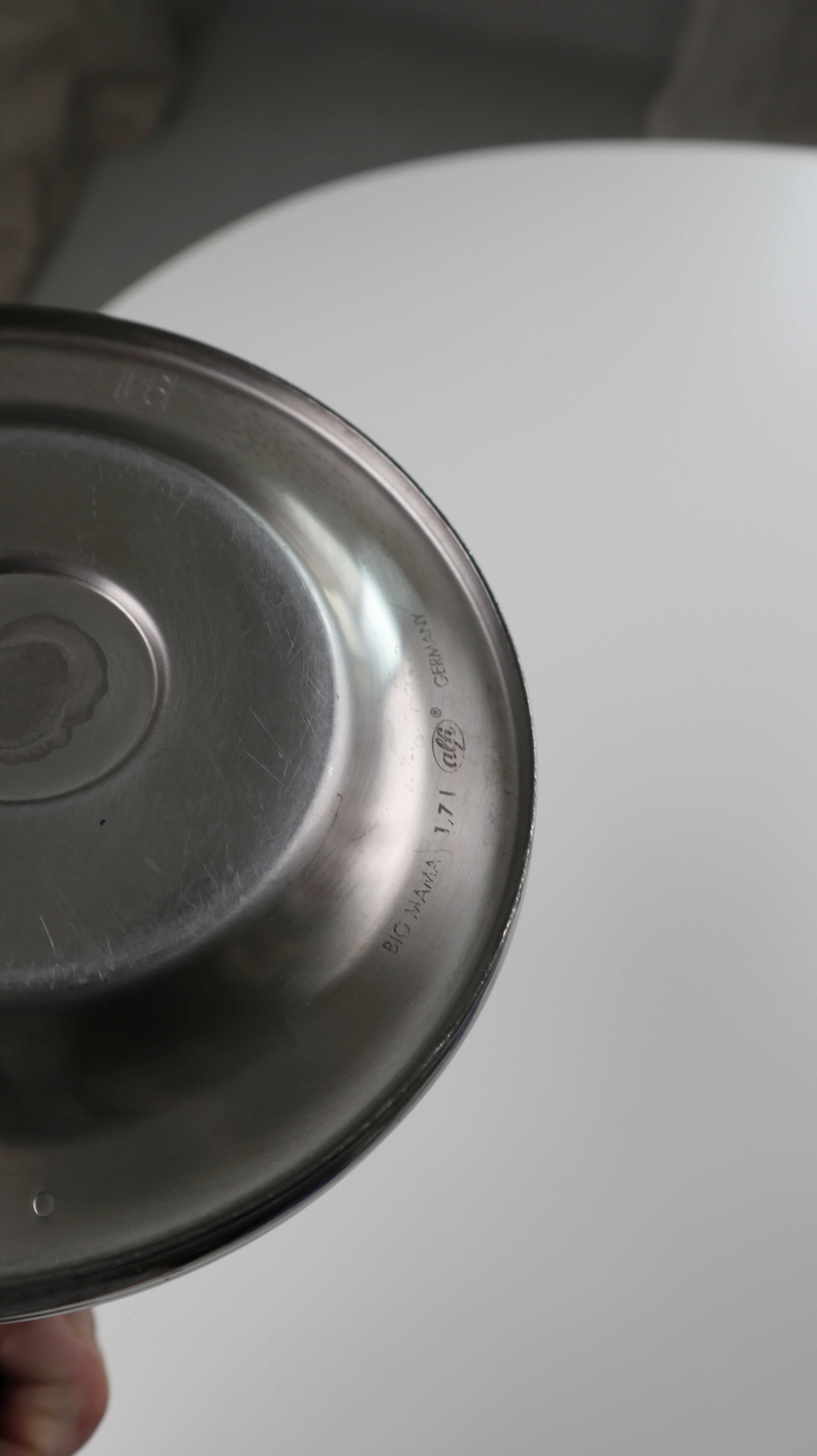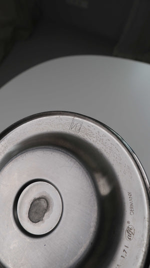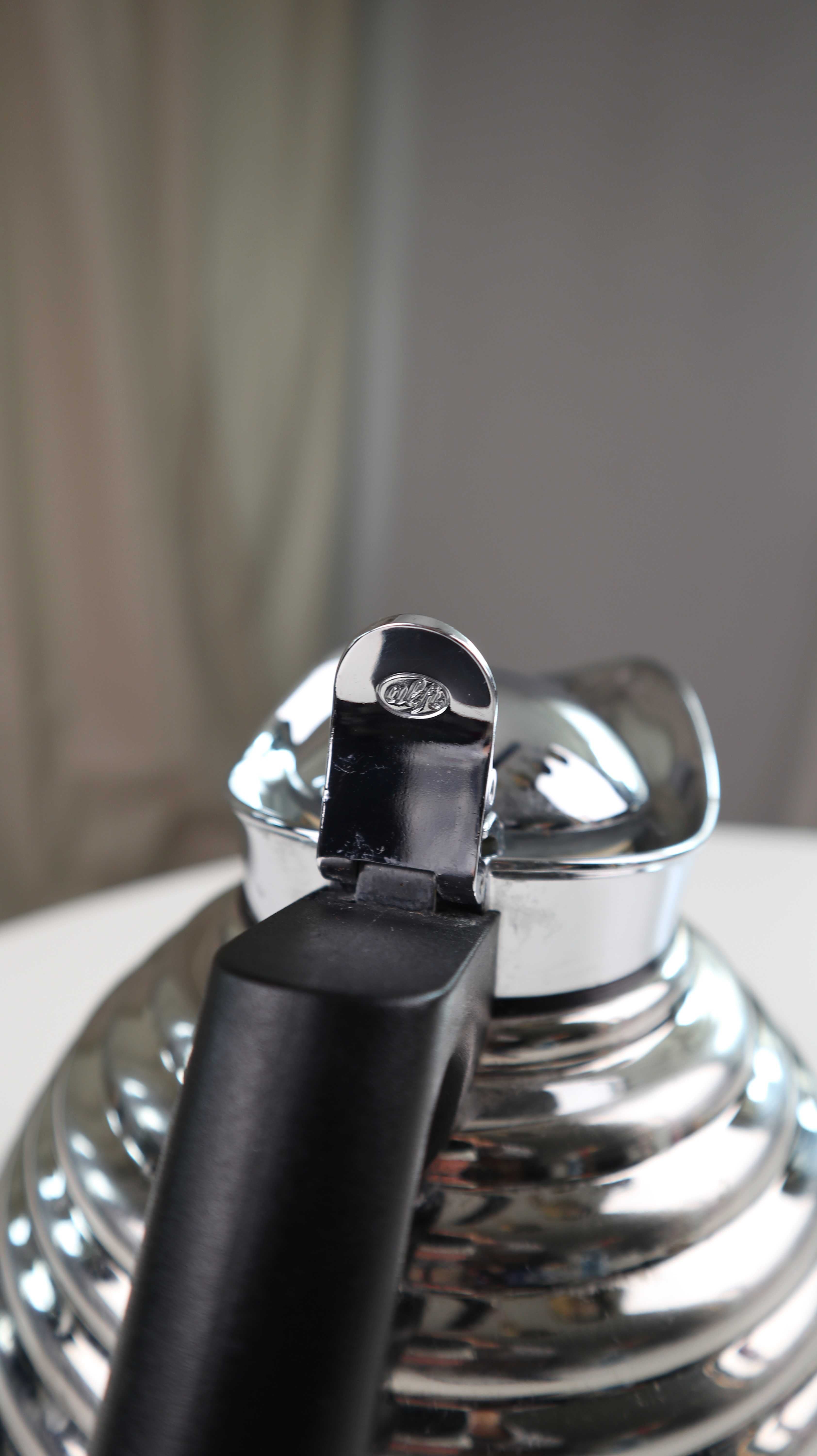 Silberne Teekanne von Alfi. Sie funktioniert tadellos - durch schwarzen Tee ist die Gummierung an der Dichtung oben verfärbt, siehe Fotos.