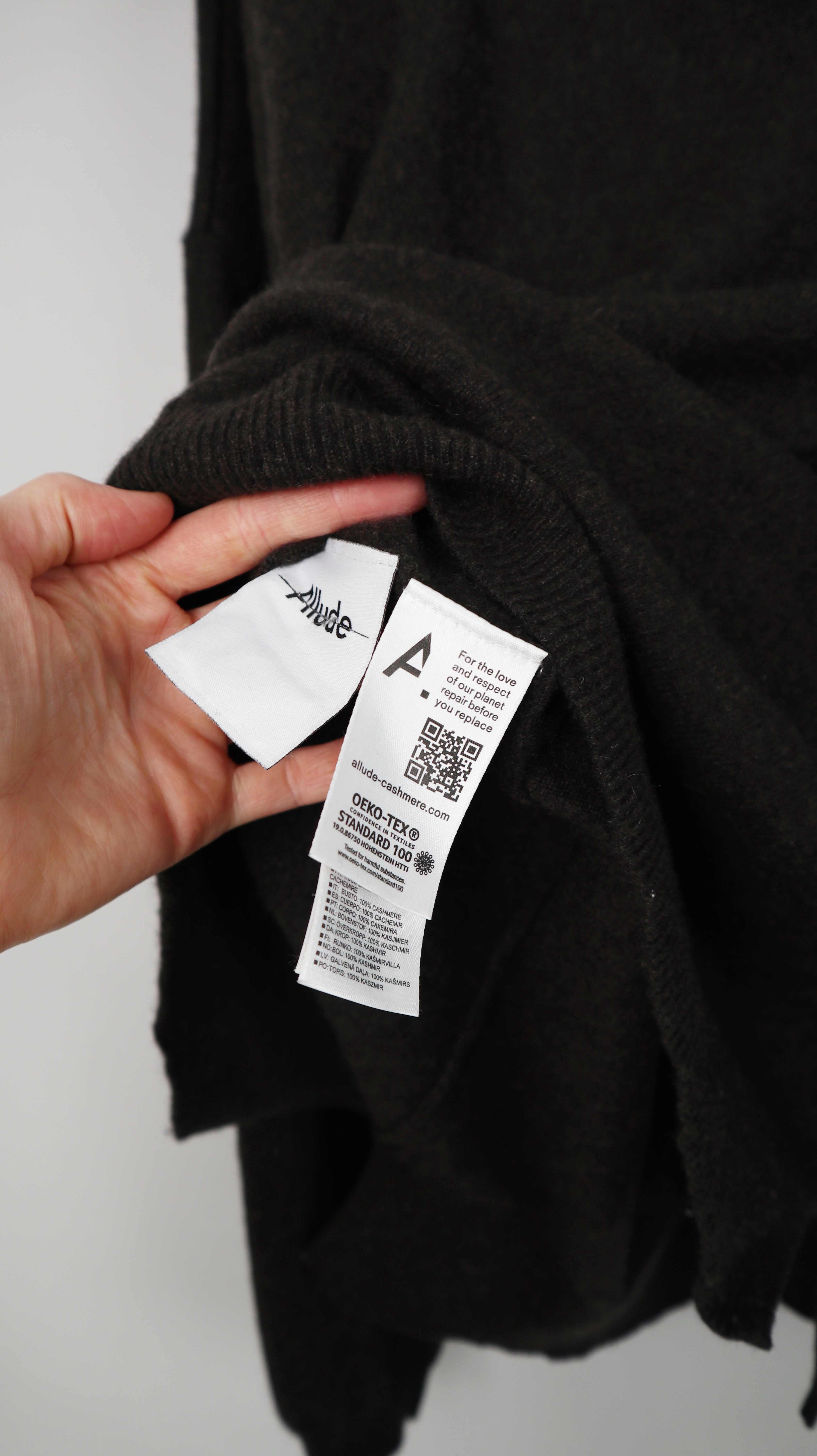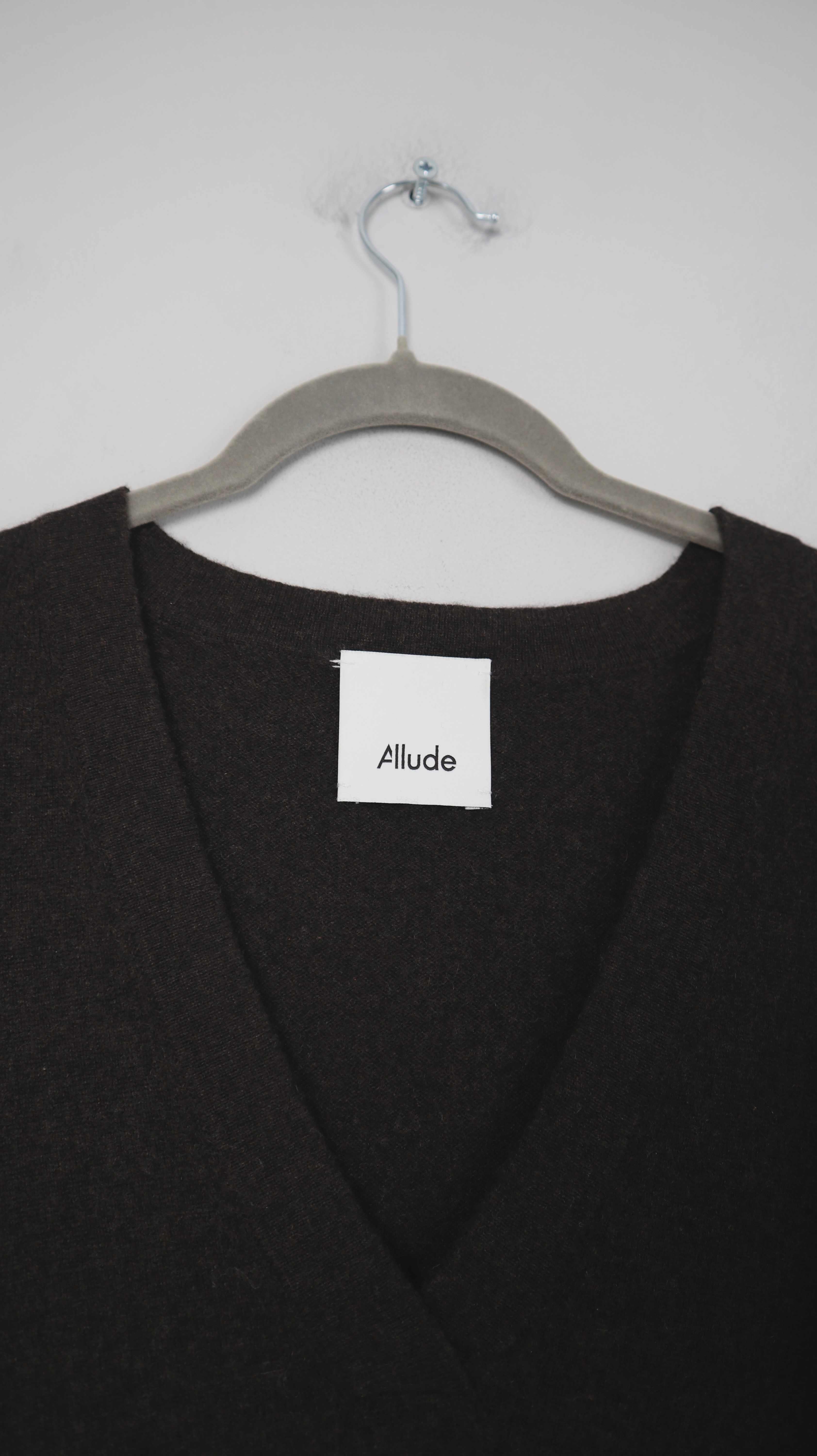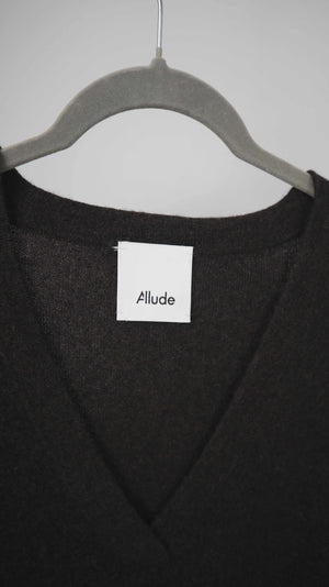 Brauner Pullover in einem neuwertigen Zustand von Allude. Er ist Schokobraun und aus 100 Prozent Cashmere. Er passt einer 40 L. 65 cm Achselweite und 61 cm Länge. Plus Versand