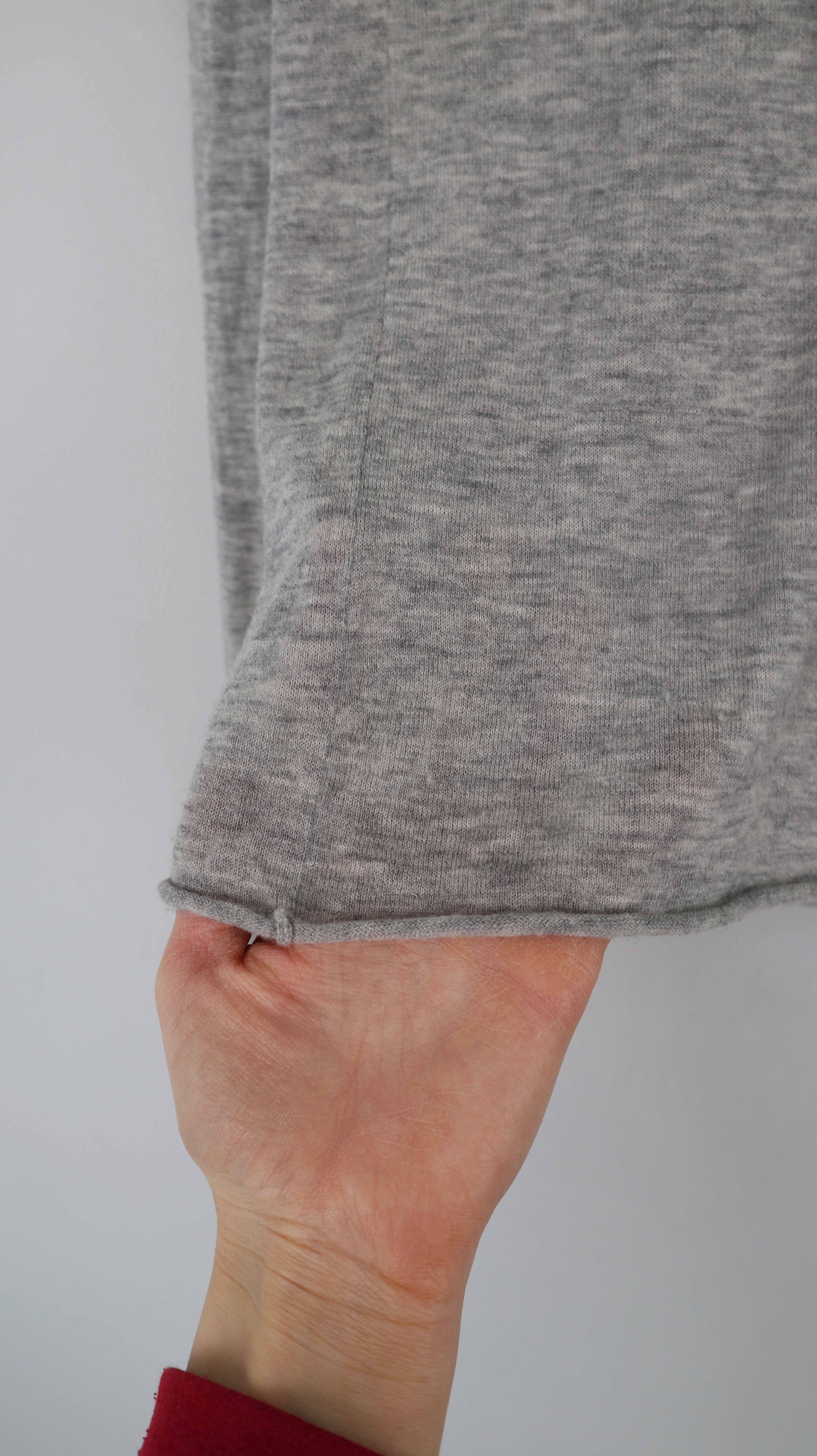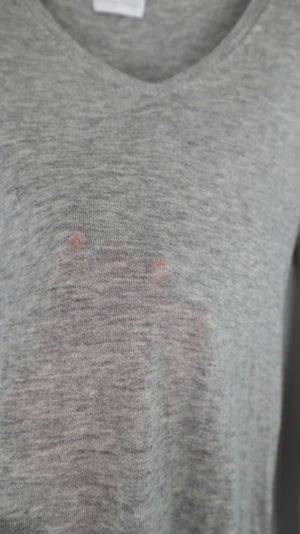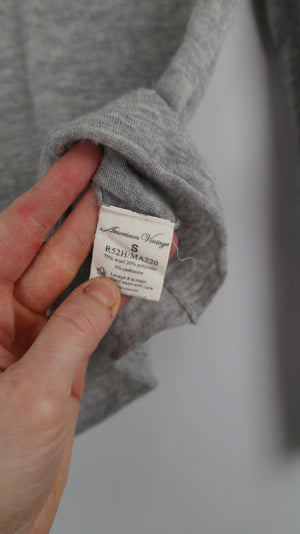 Hellgrauer Pullover von American Vintage in S. Er hat vorne zwei kleine Löcher. Anteilig ist er mit Wolle und Cashmere. 44 cm Achselweite, 51 cm Länge. Plus Versand