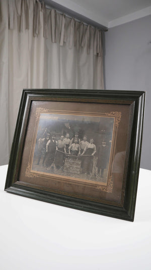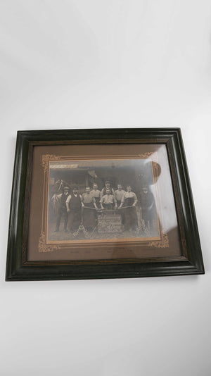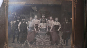 Antike Fotografie, gerahmt. Sie zeigt eine Gruppe bei der Hufschmiedeschule. Plus Versand