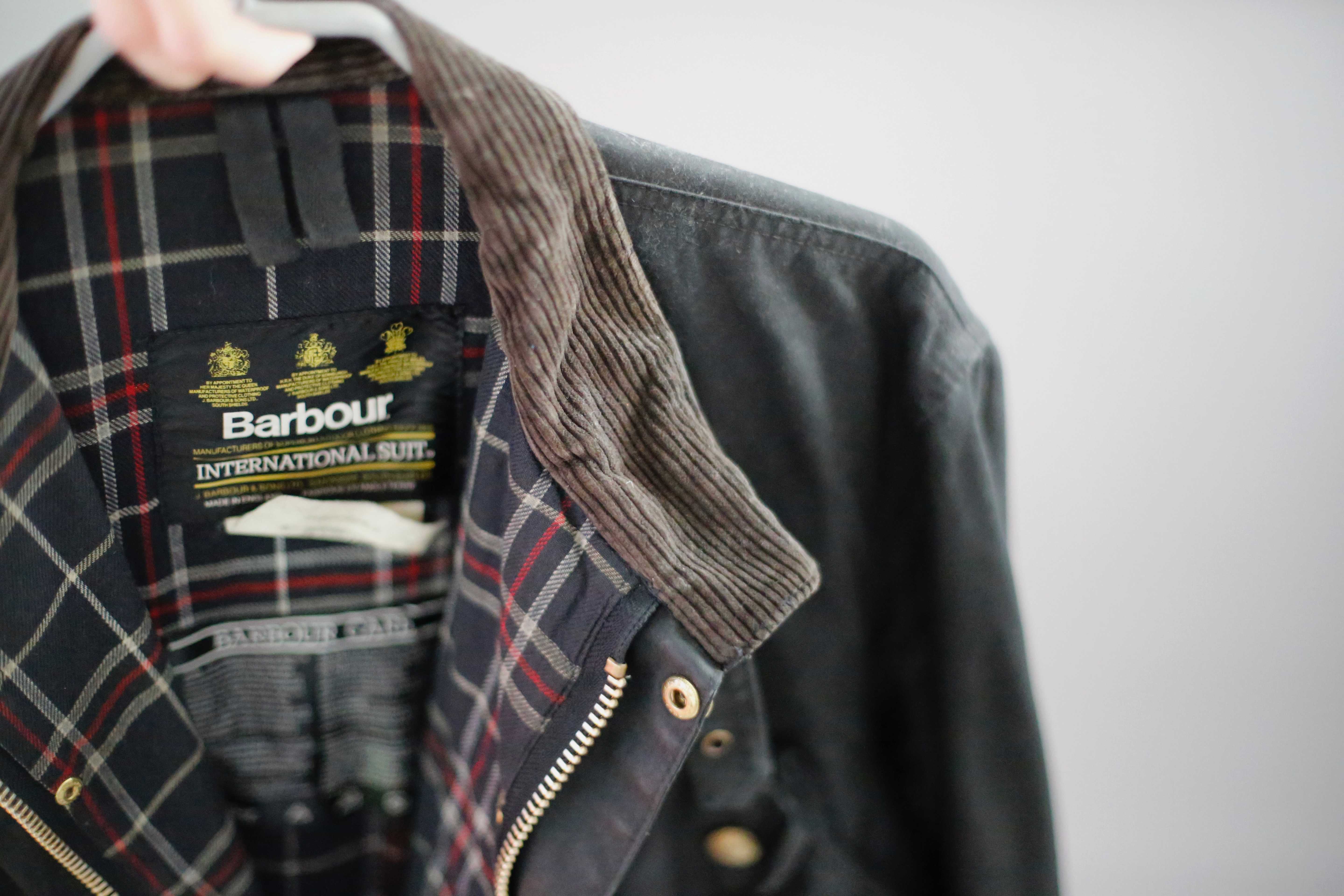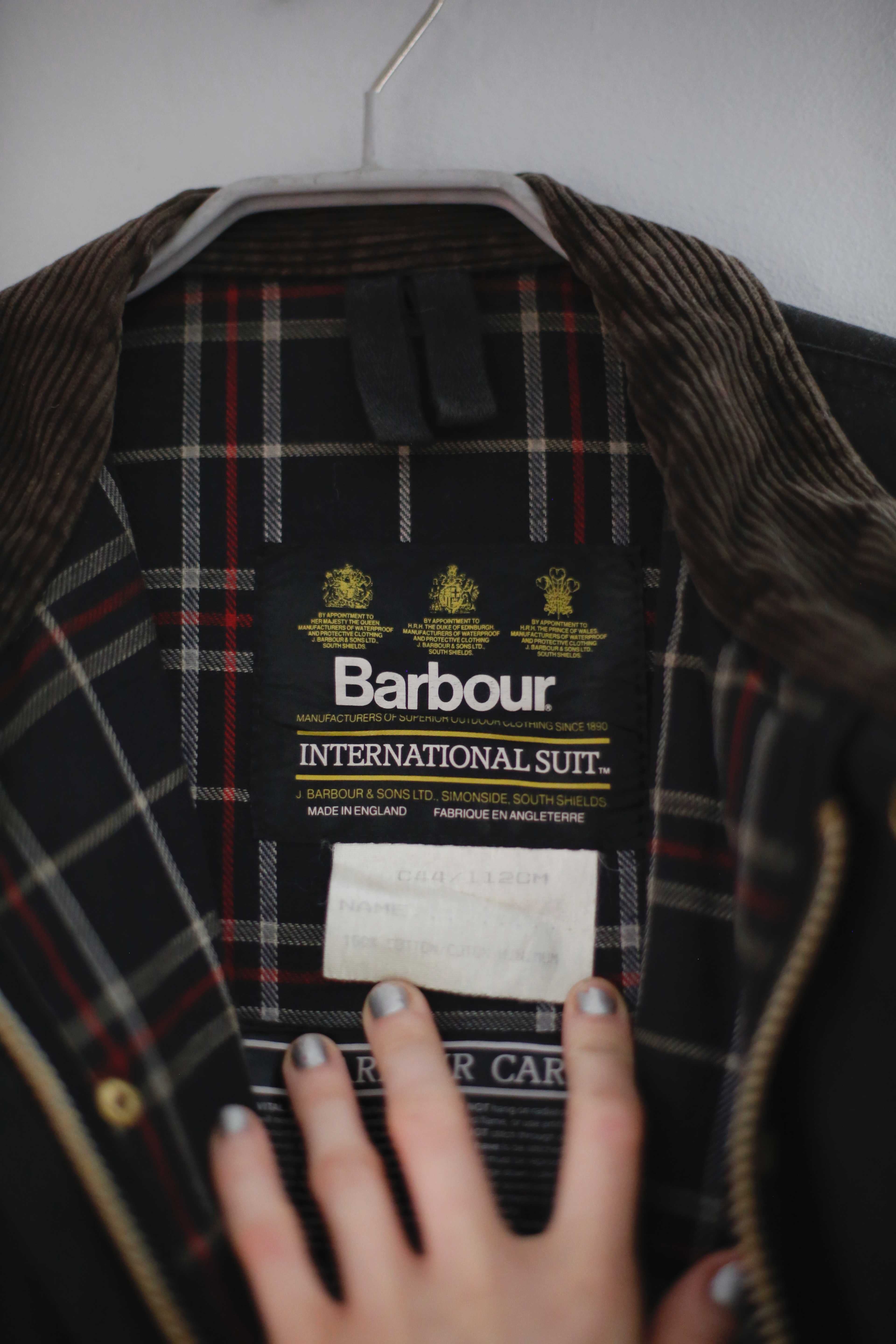 Neuwertige Barbourjacke. Das Modell ist gewachst, mit Gurt und heisst Barbour International. Die Größe ist C58, C44 / 112 CM ist die Angaben von der Oberseite vom Etikett. Sehr guter Zustand, innen kariert, Kragen wirklich top. Sie passt einer Größe 40 L. 56 cm Achselweite, 78 cm Länge. Plus Versand