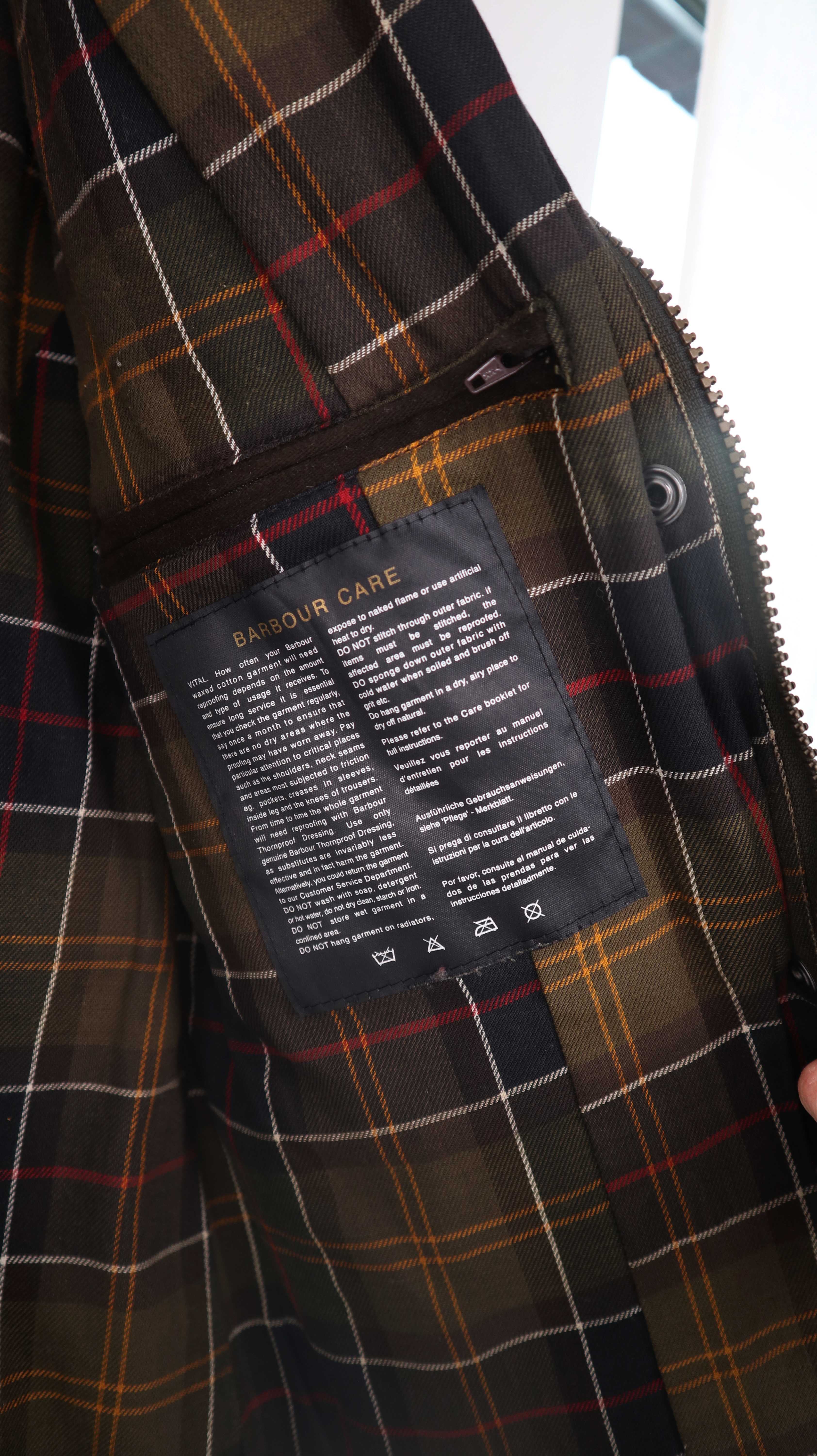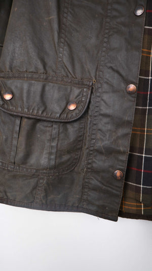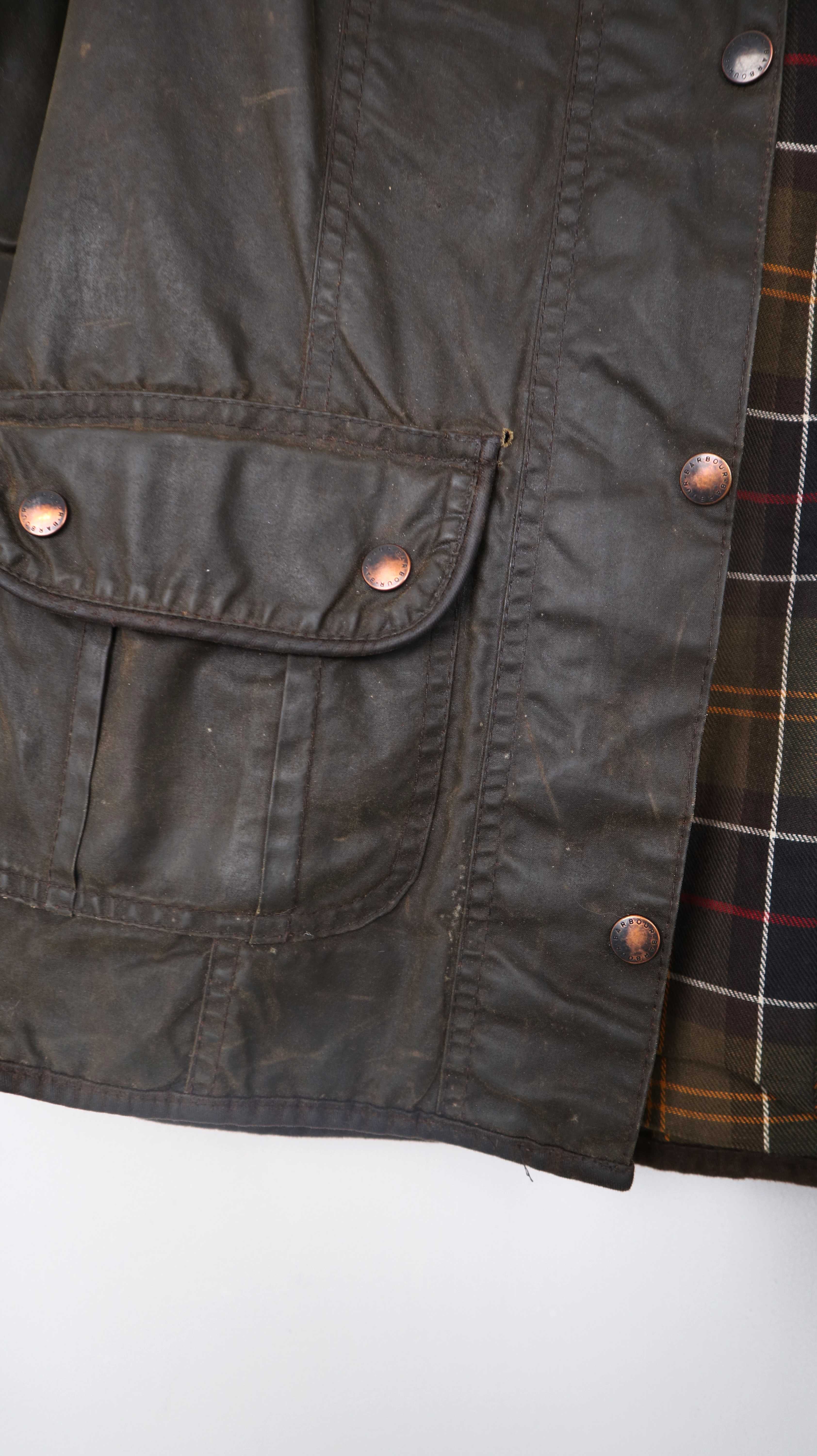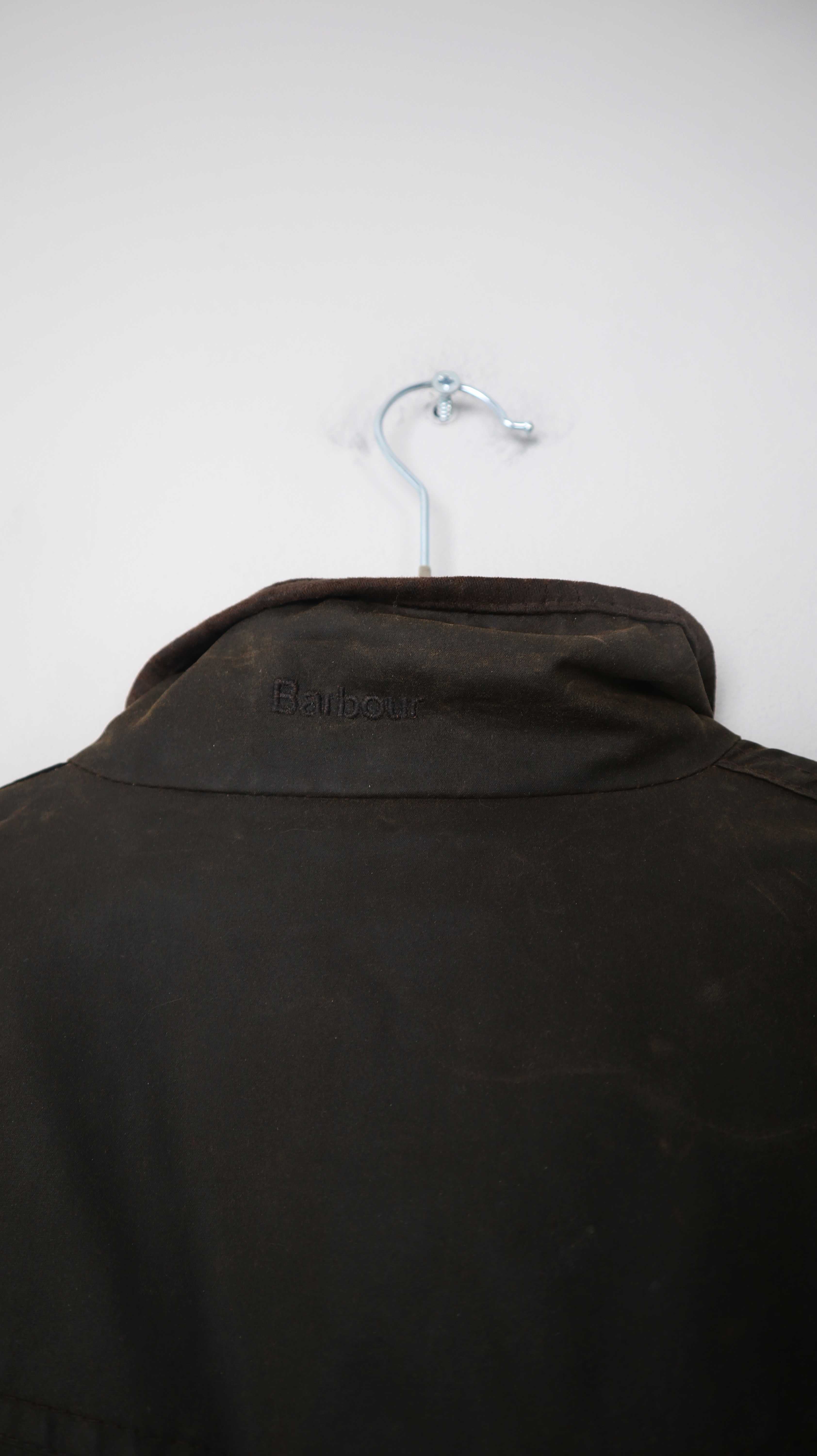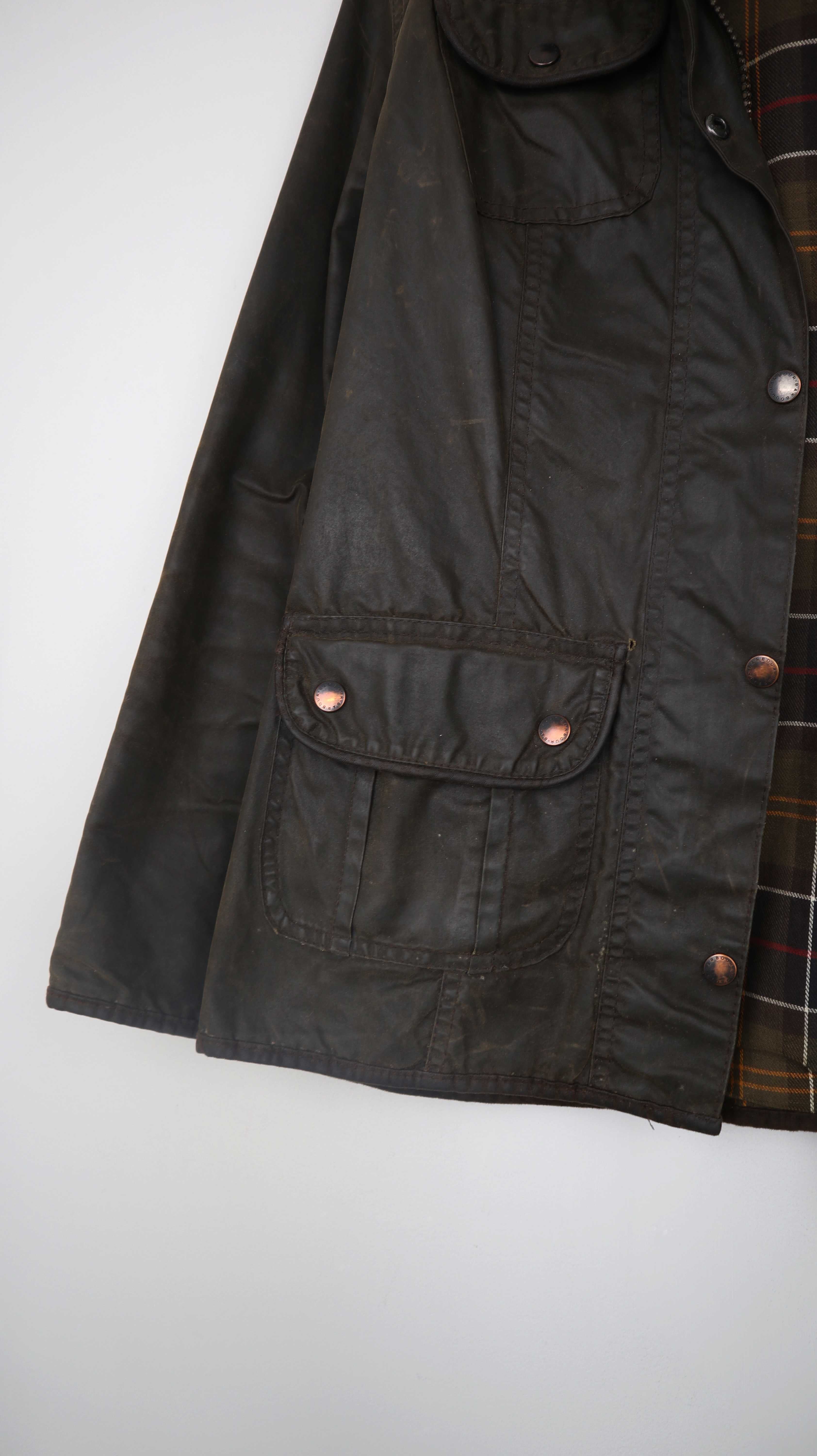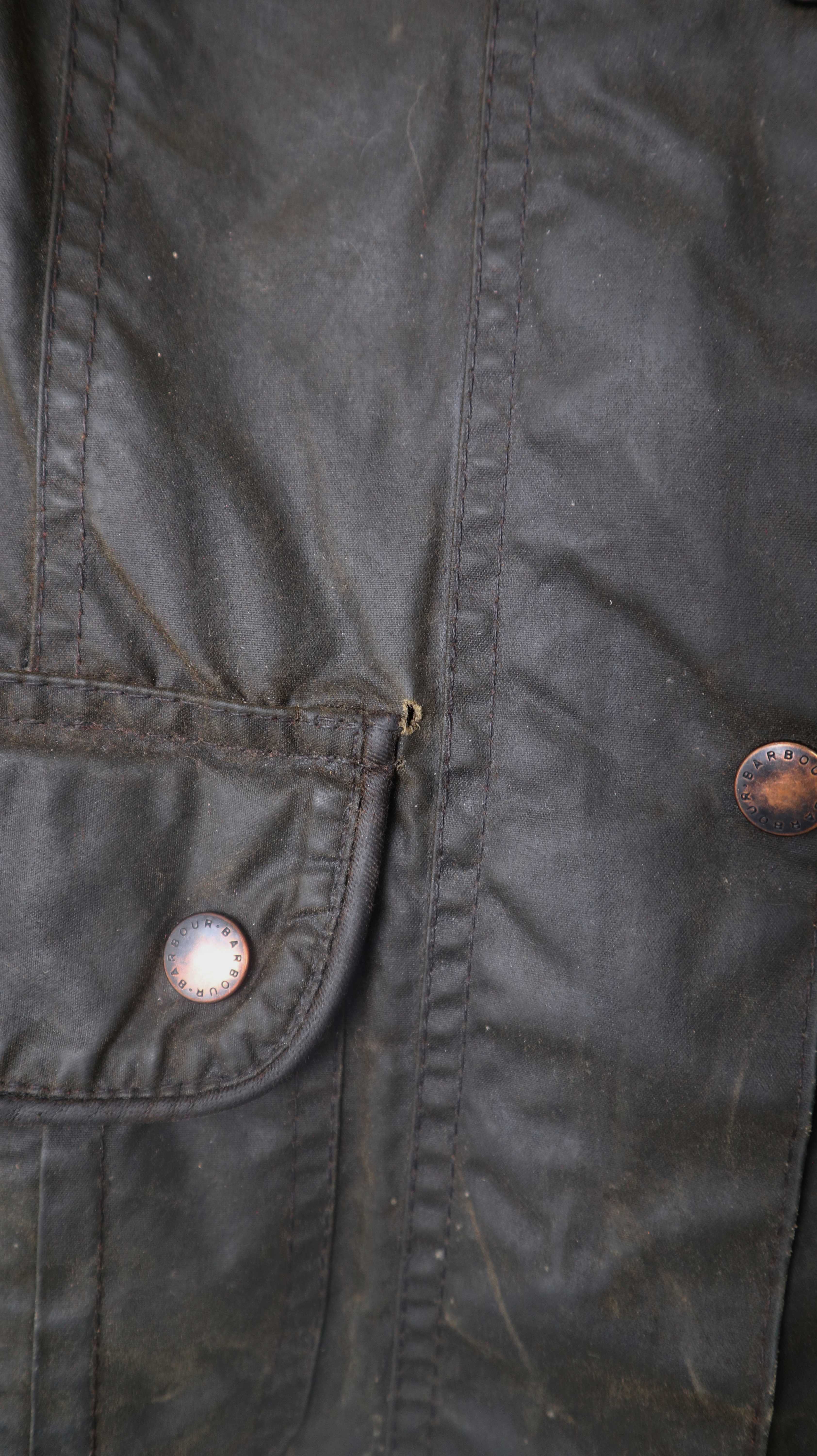 Dunkelbraune Wachsjacke von Barbour. Ausgeschildert ist sie mit 12, was nach der Tabelle einer 38 M entspricht. Tatsächlich passt sie eher einer 36 S. Links bei der Tasche ist außen ein kleines Loch / Benutzungsspur. Es ist eine alte Barbour mit 3 Emblemen. 50 cm Achselweite und 69 cm Länge. Plus Versand