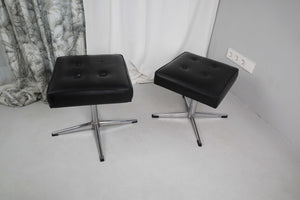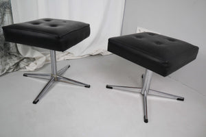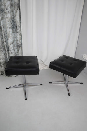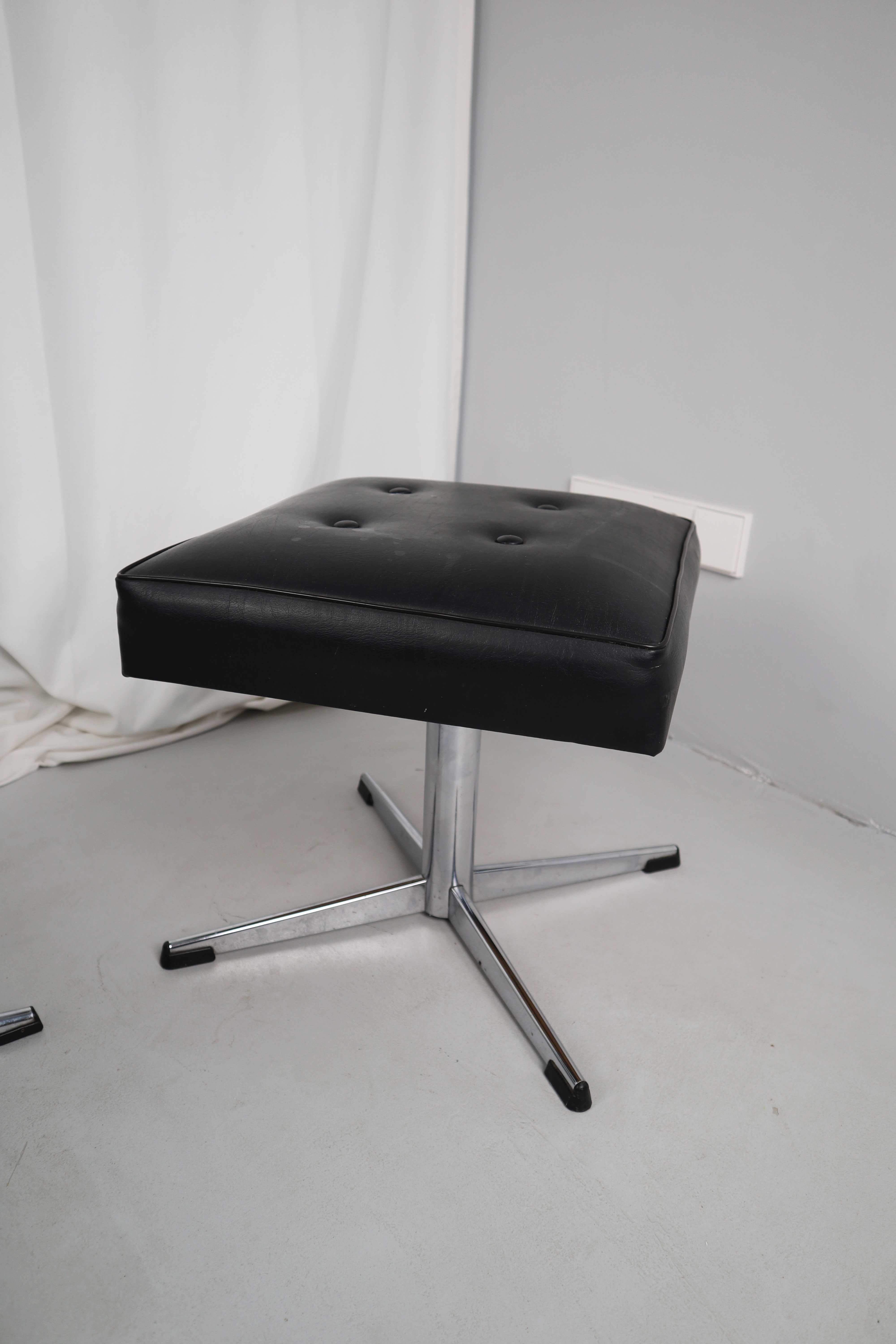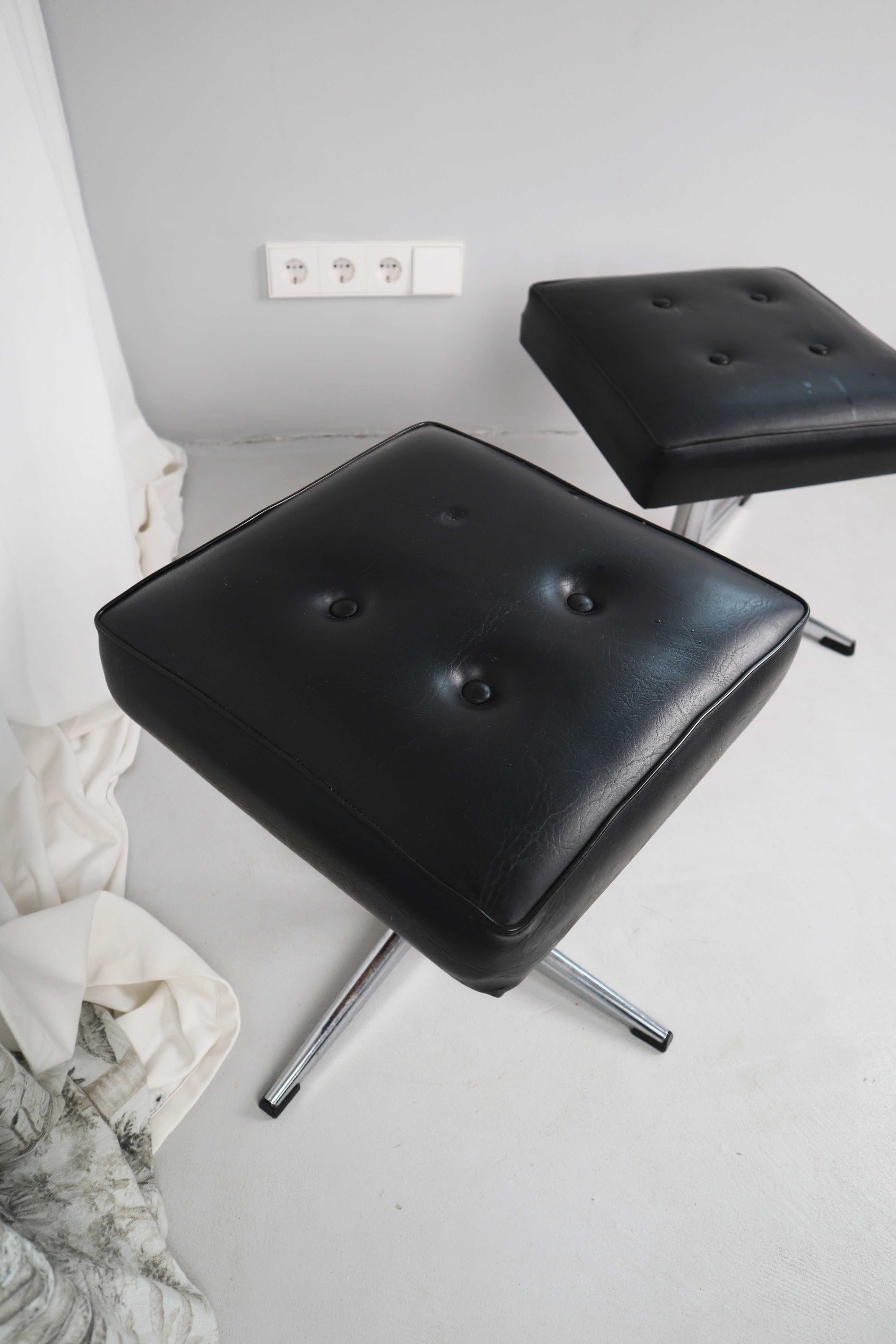 Zwei Vintagehocker mit Chromfuß. Beide messen 40 x 40 cm von der Fläche, unterscheiden sich jedoch und haben unterschiedliche Höhen. Kunstleder. Bei einem fehlt ein schwarzer Polsterknopf. Verkauf als Paar oder Einzelstücke. Preis bezieht sich auf einen Hocker. Geschätzt auf 70er, sie stammen aus einer Tischlerei. Plus Versand