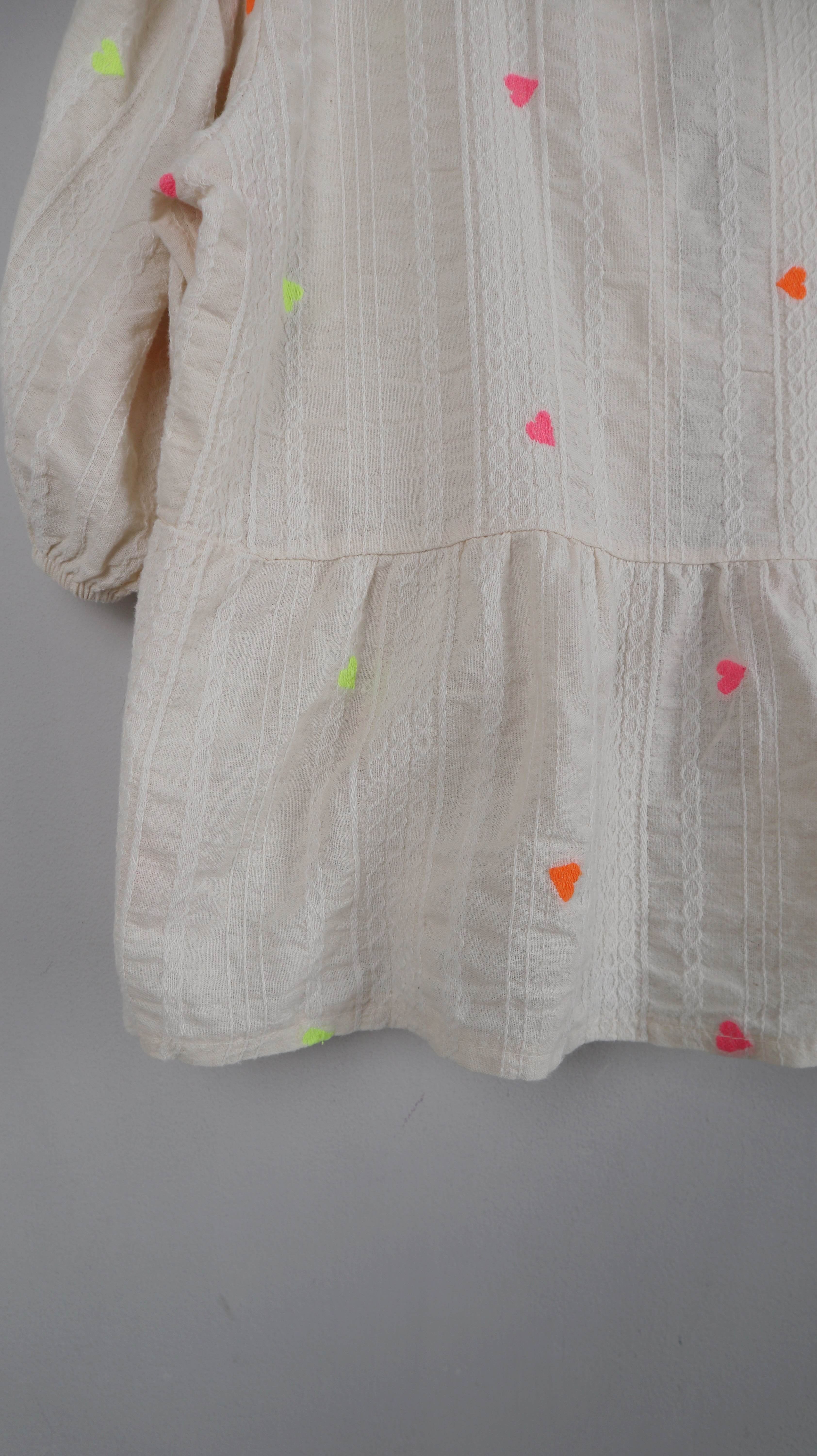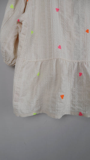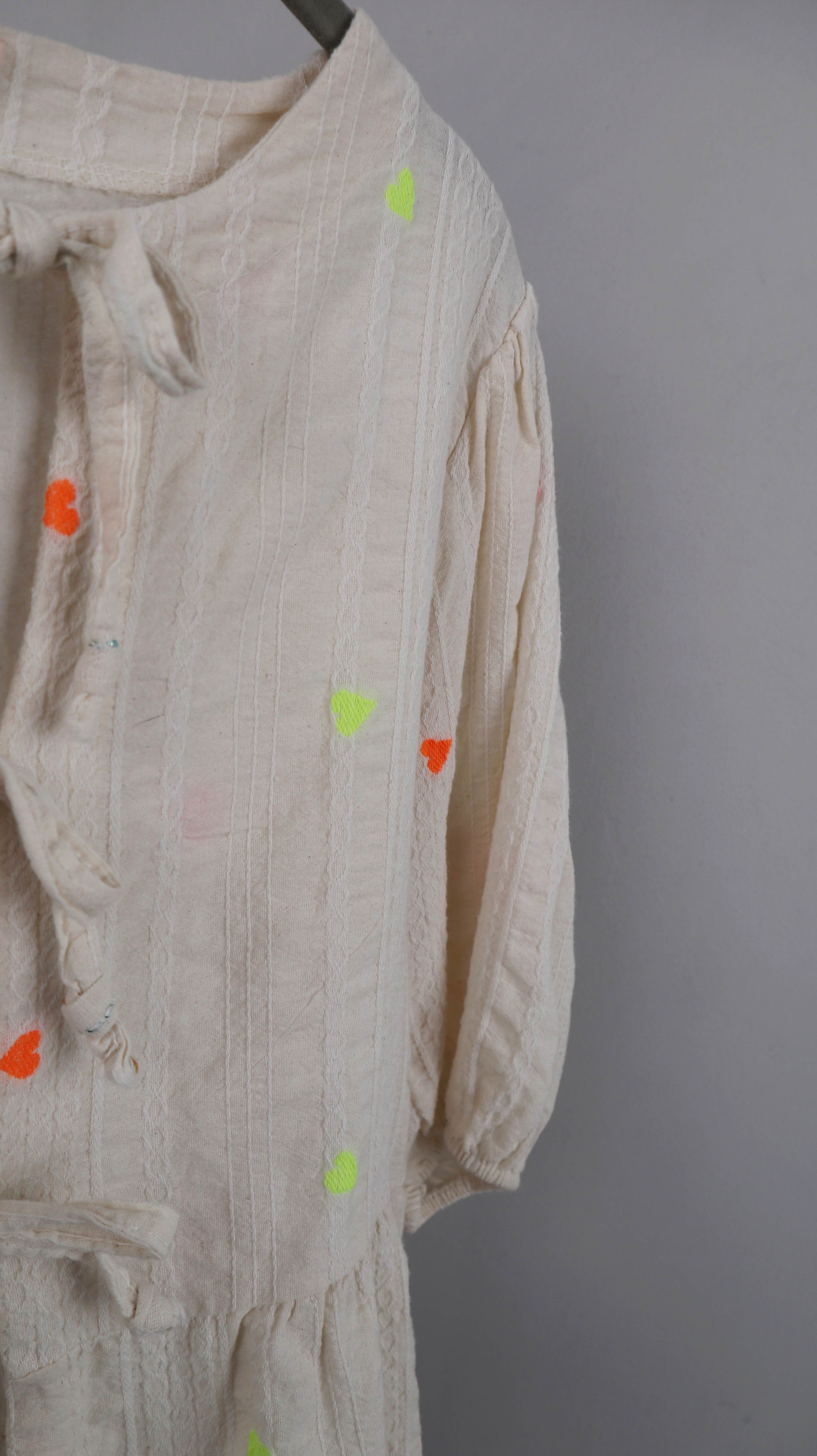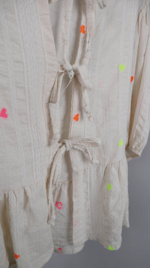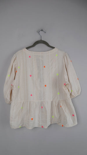 Beige Bluse mit kleinen Herzen in einer 38 M. Sie hat vorne drei Bindungen. 48 cm Achselweite und 52 cm Länge. Plus Versand
