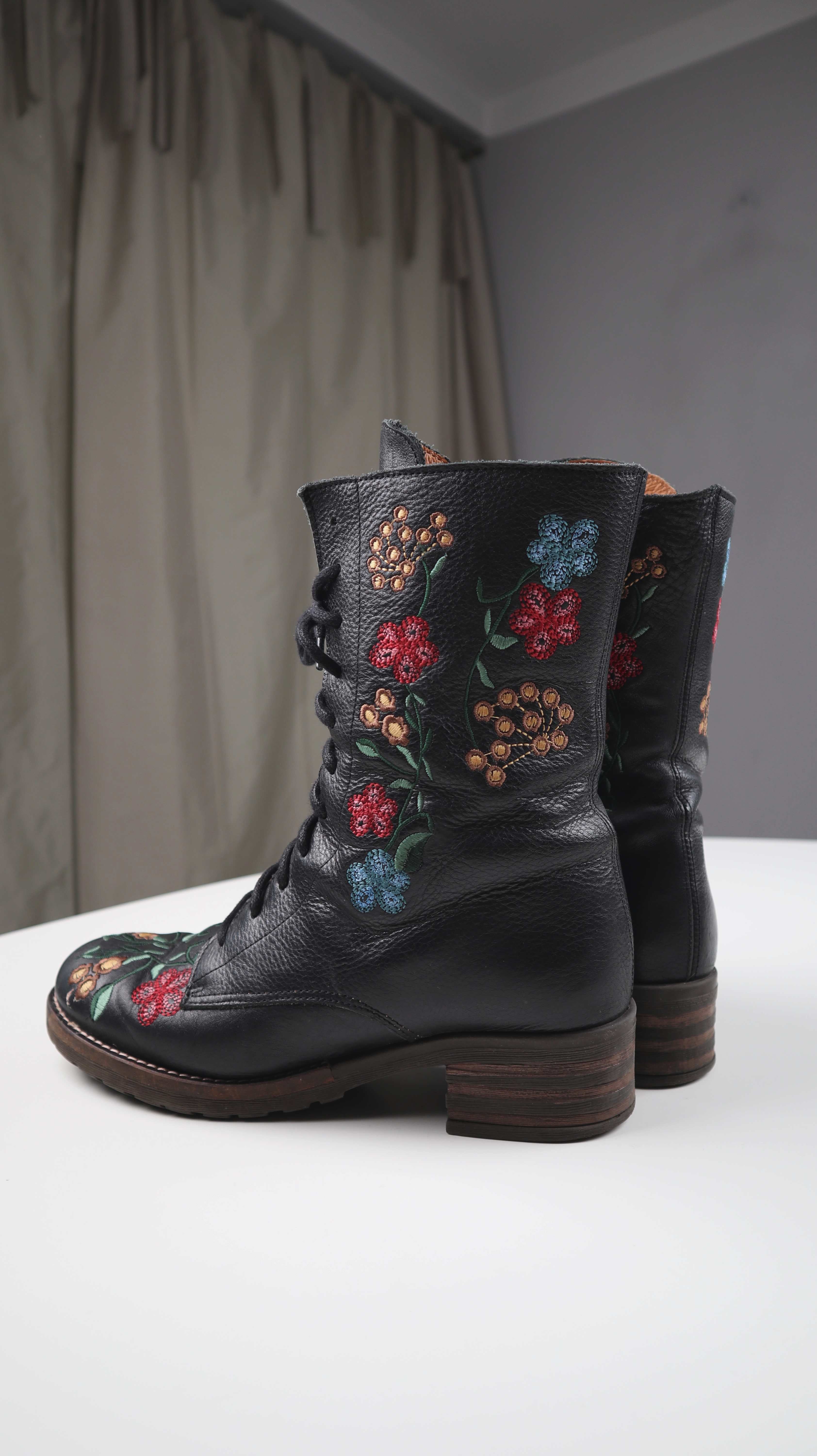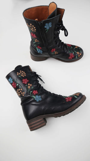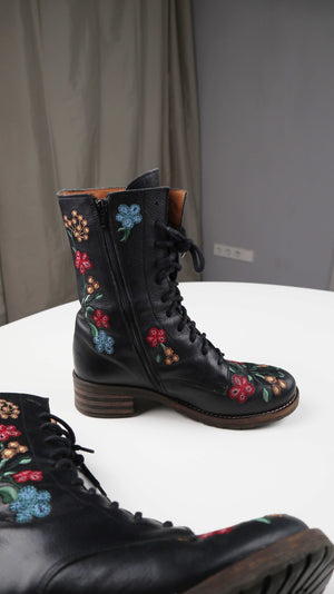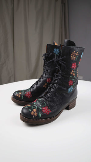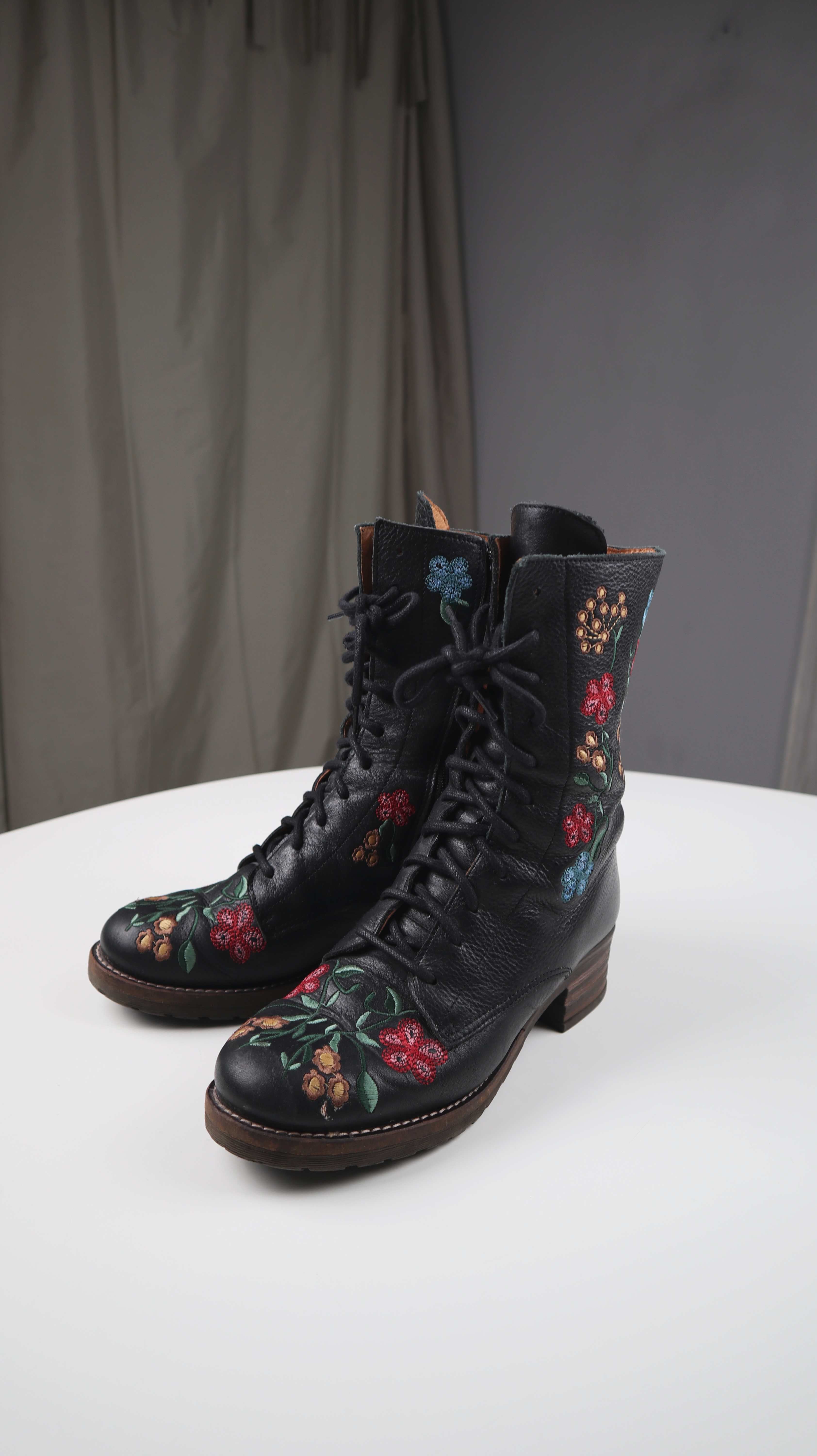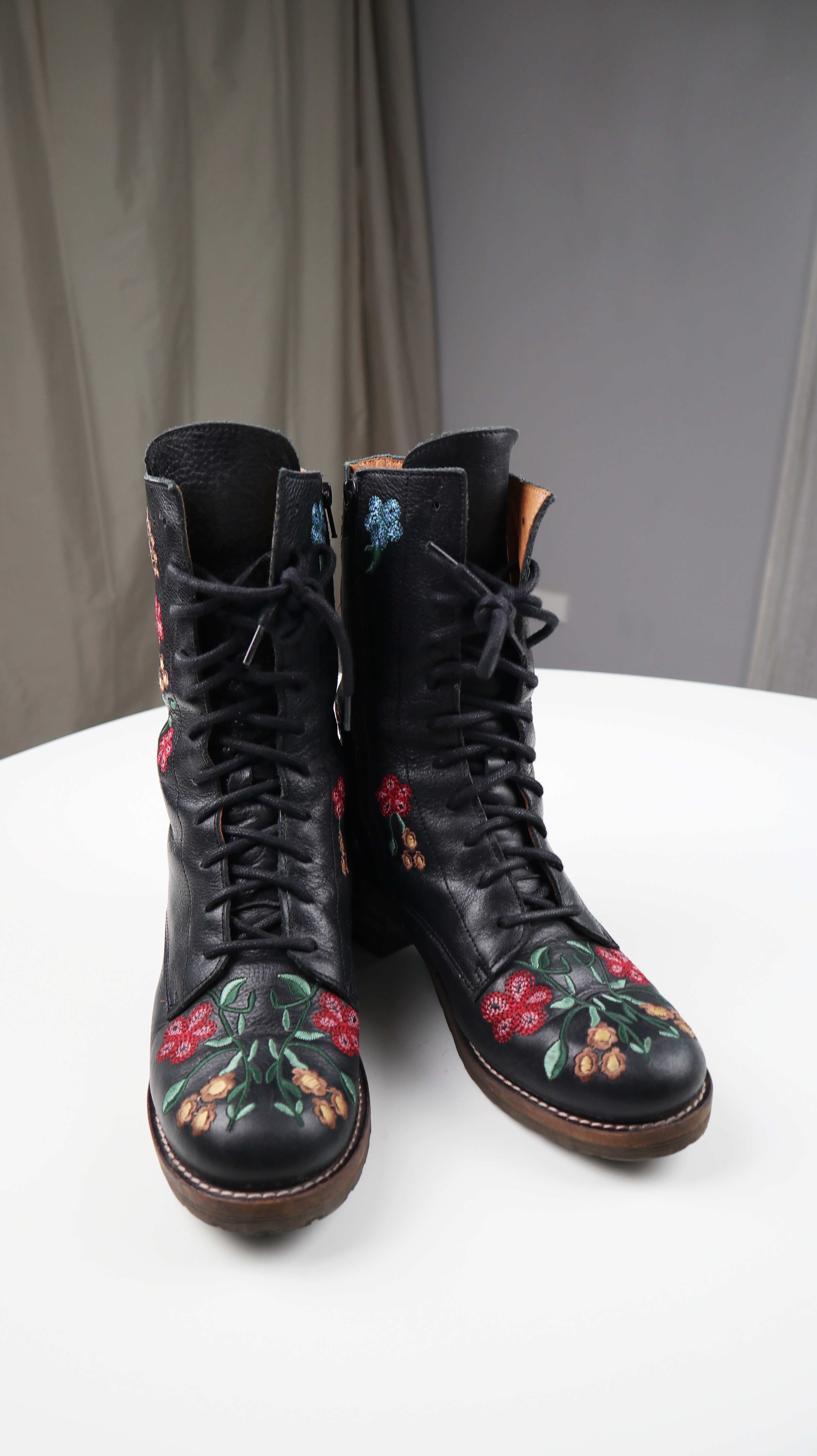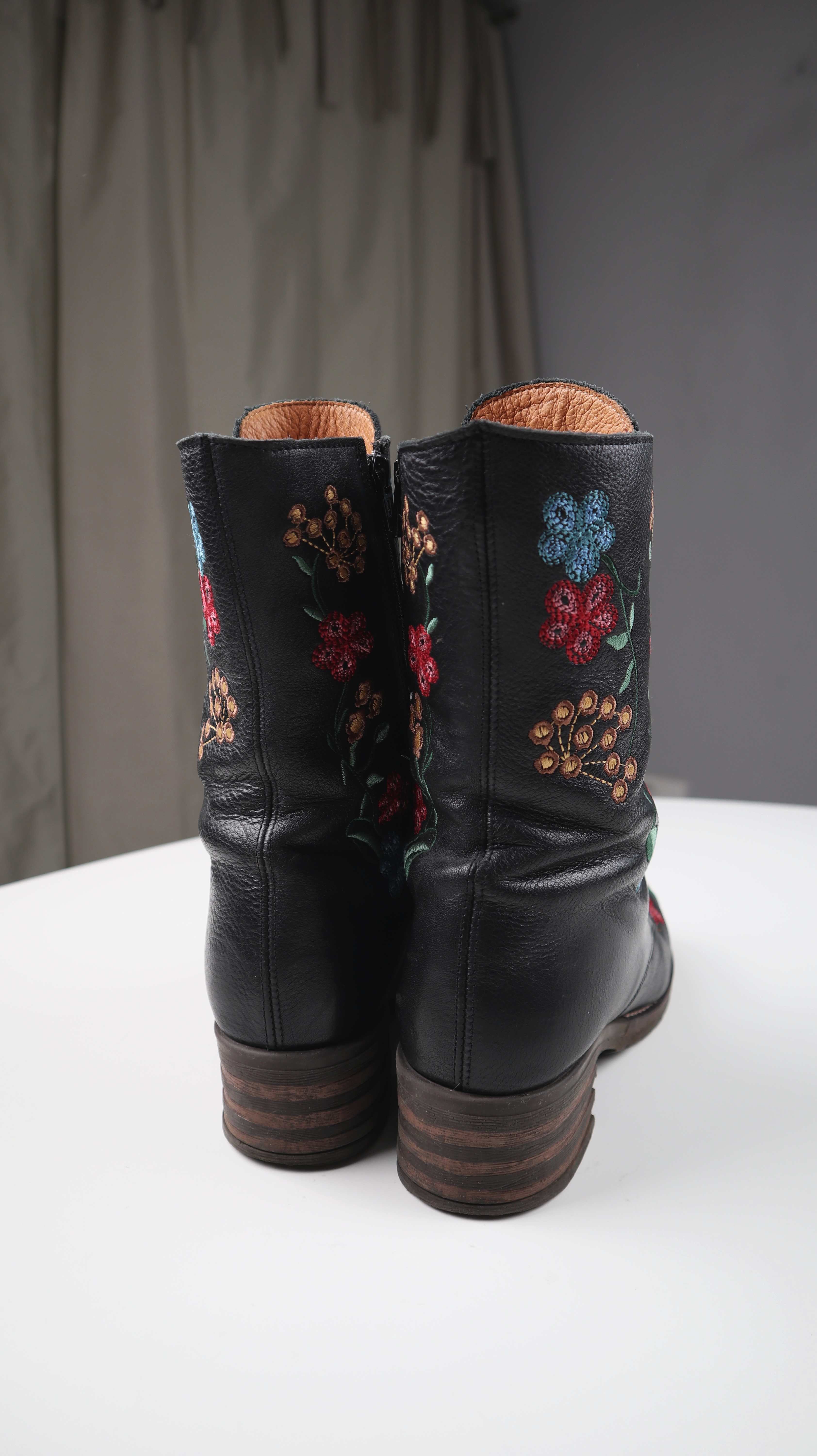 Brako Stiefel Stiefeletten 40 schwarz bestickt Blumen Lederstiefel