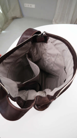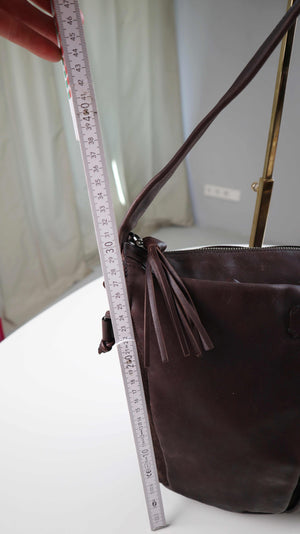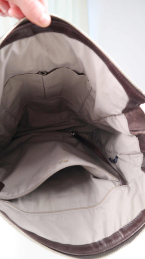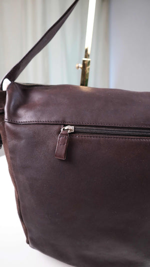 Braune Ledertasche von Bree mit einem breiten Schultergurt. Innen und außen viele Fächer mit Reißverschlüssen vorhanden. Plus Versand