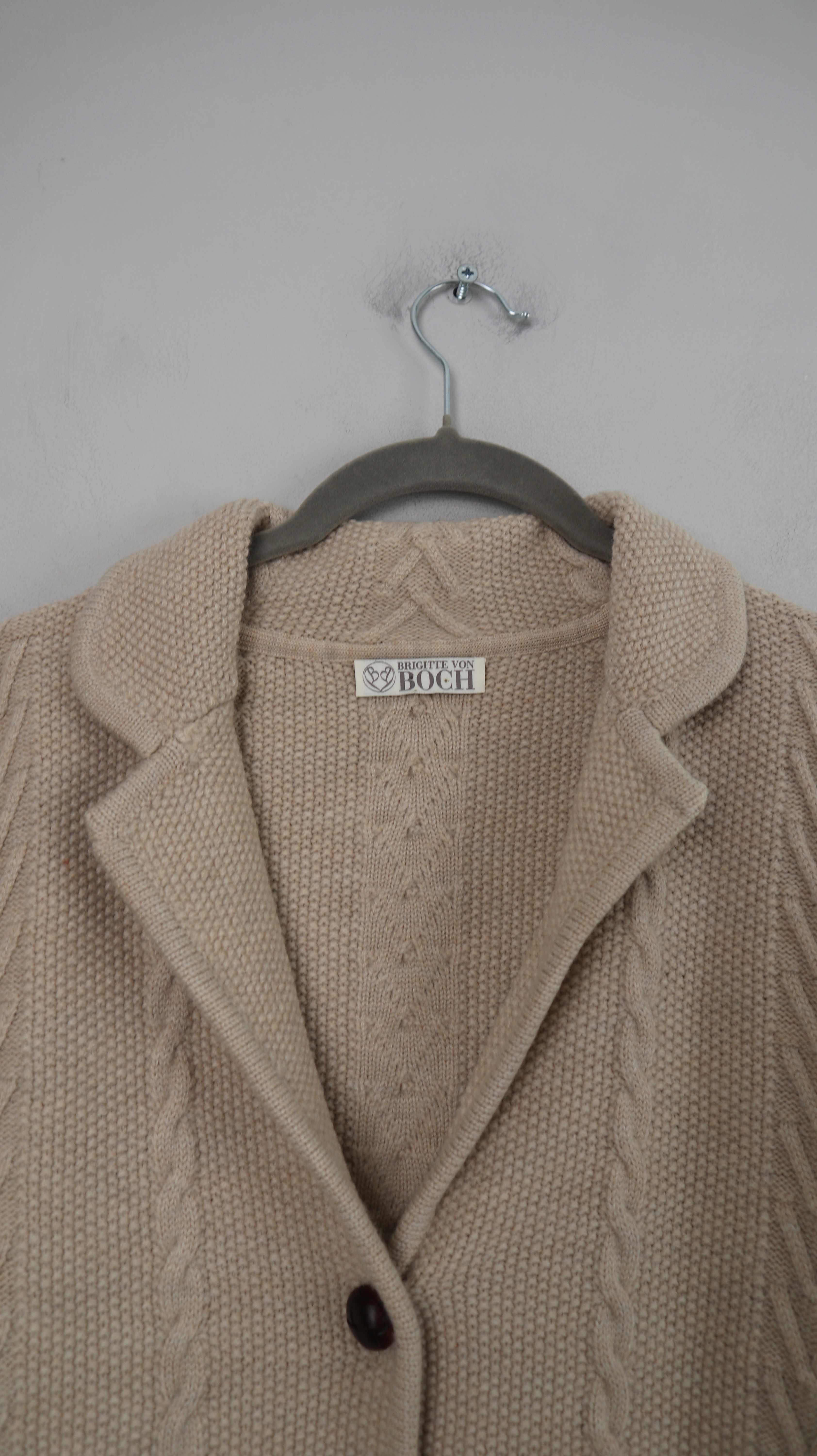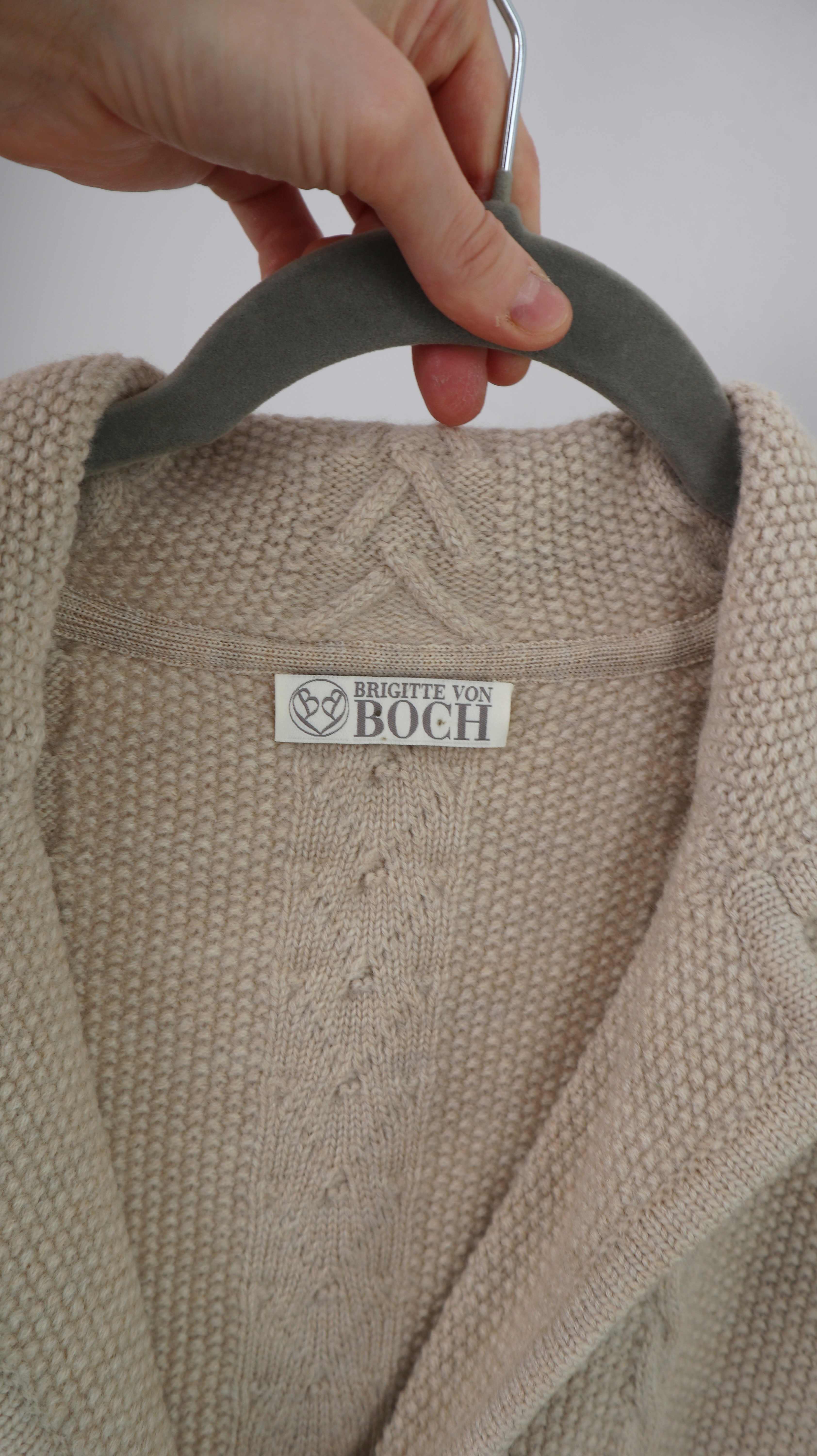 Beige Strickjacke aus Wolle von Brigitte von Boch. Sie passt einer 40 L. 43 cm Achselweite und 59 cm Länge. Plus Versand
