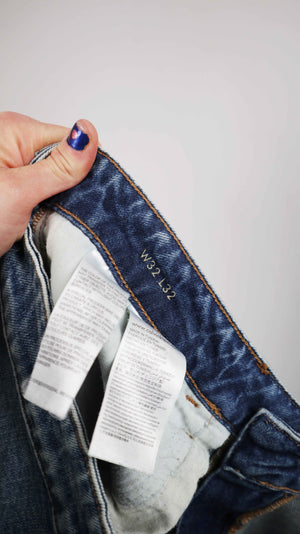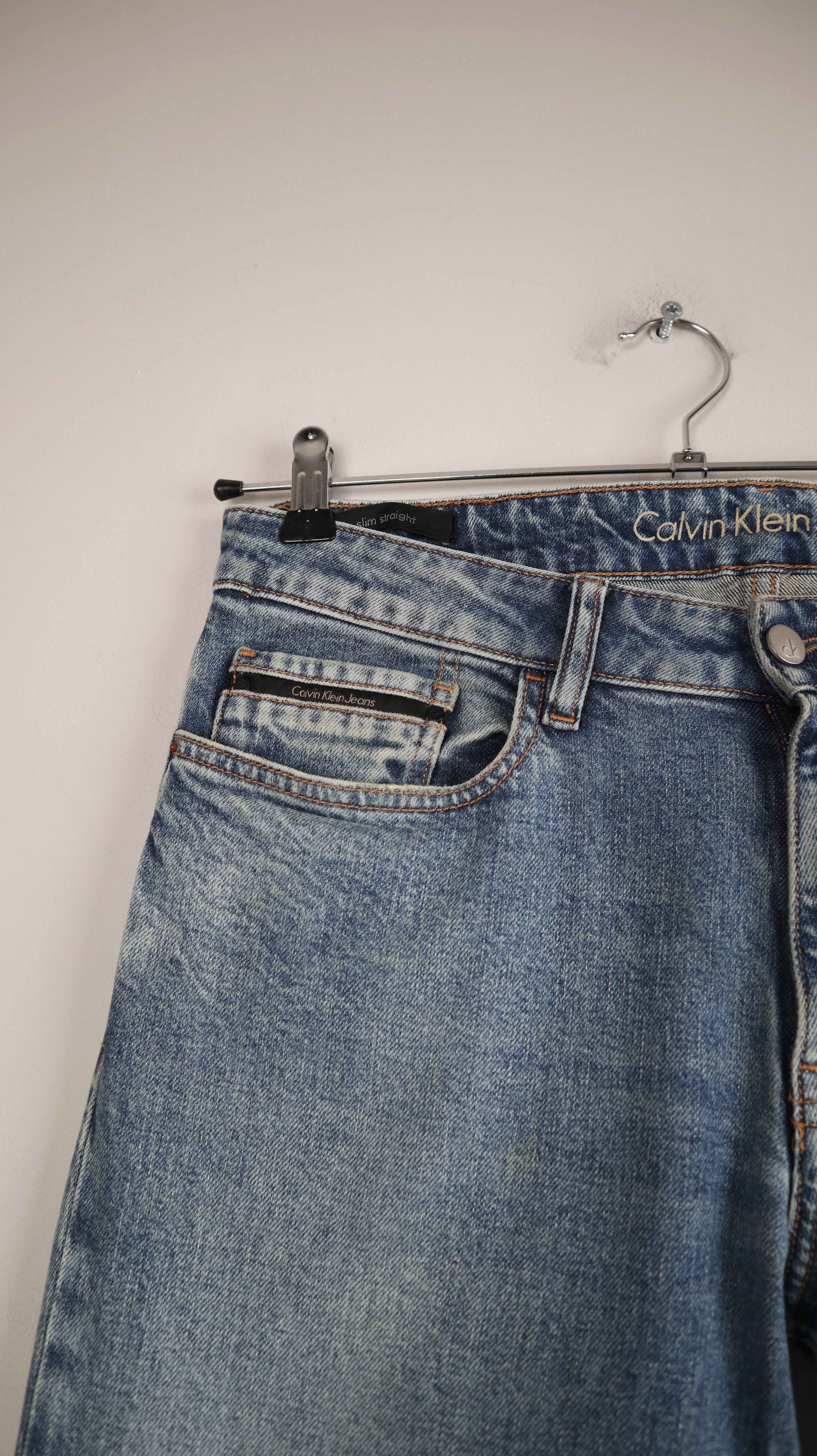 Blaue Jeans von Calvin Klein und W32 und L32. 44 cm Bundweite, 26 cm Schritthöhe und 74 cm Länge. Plus Versand