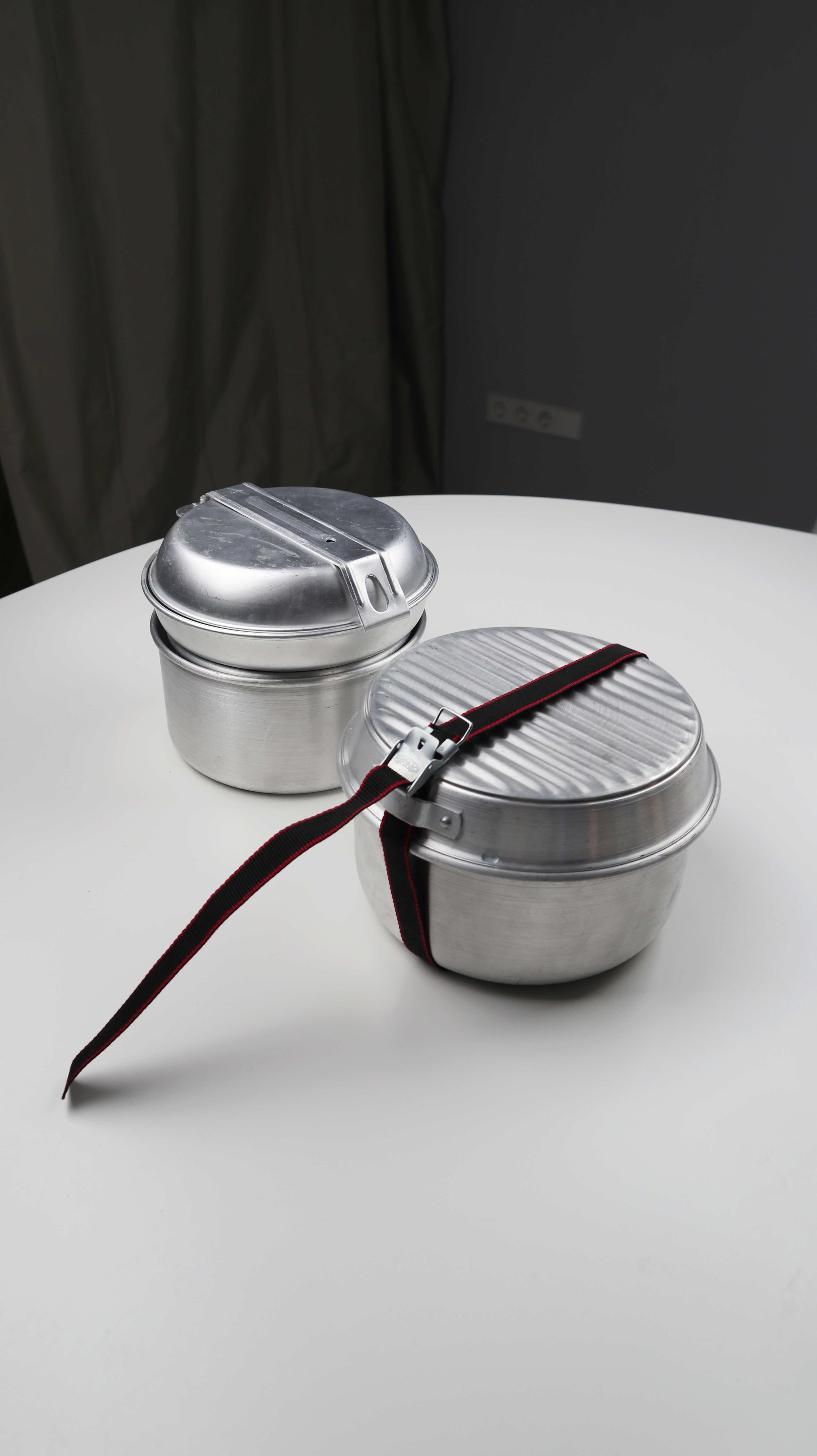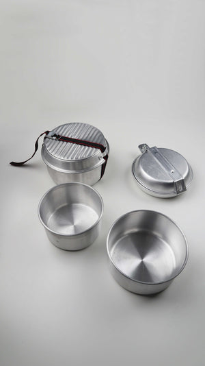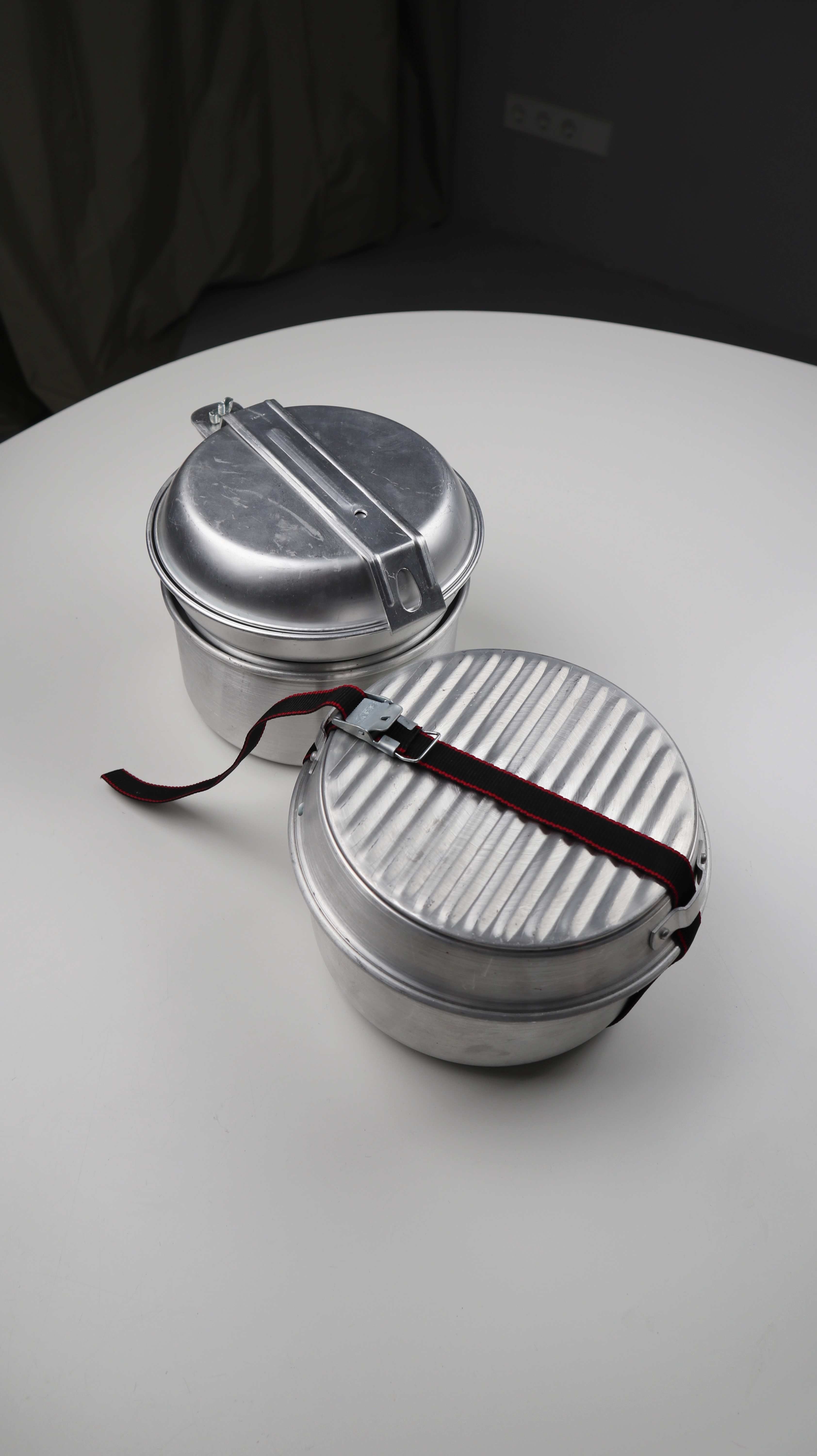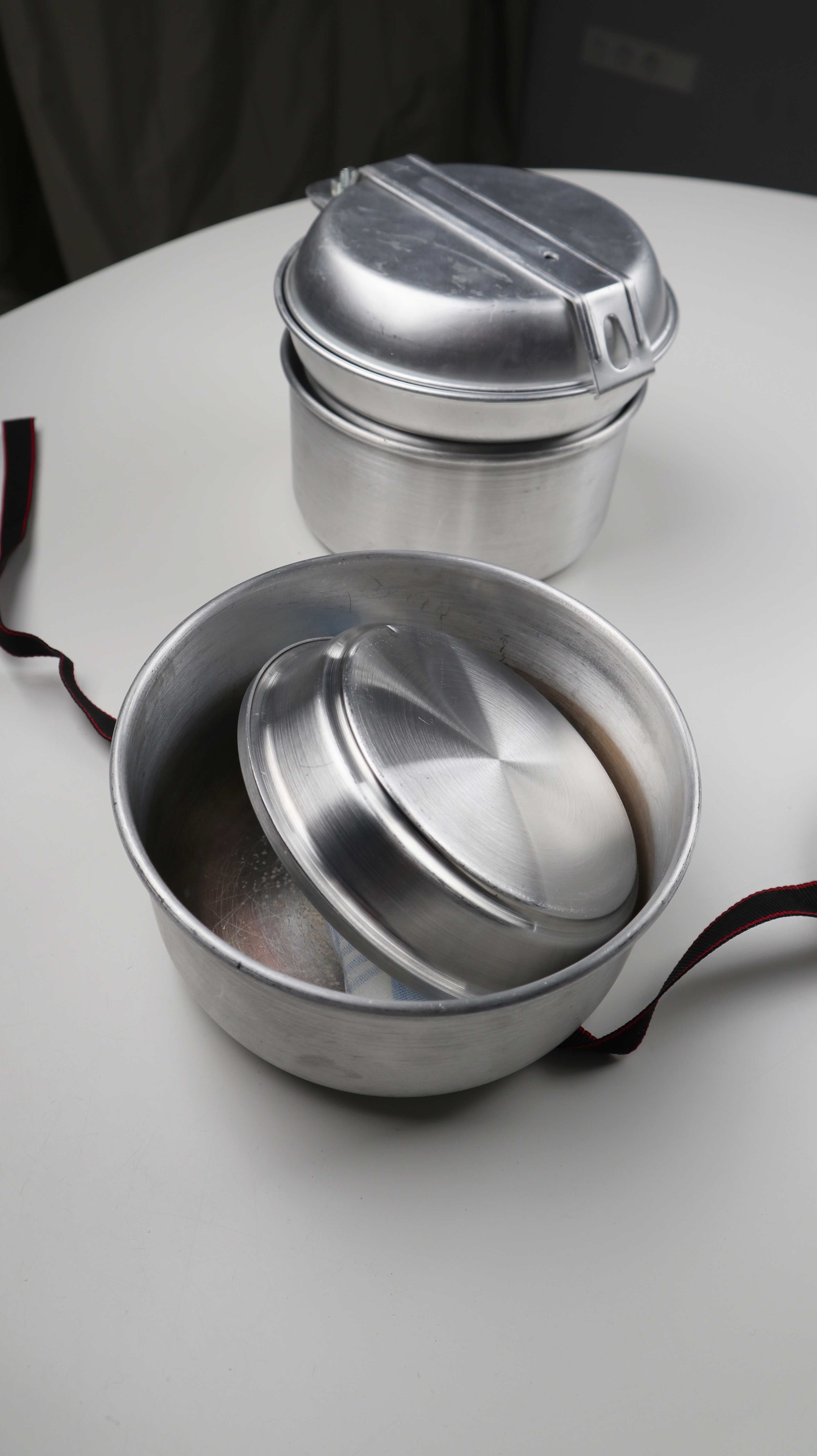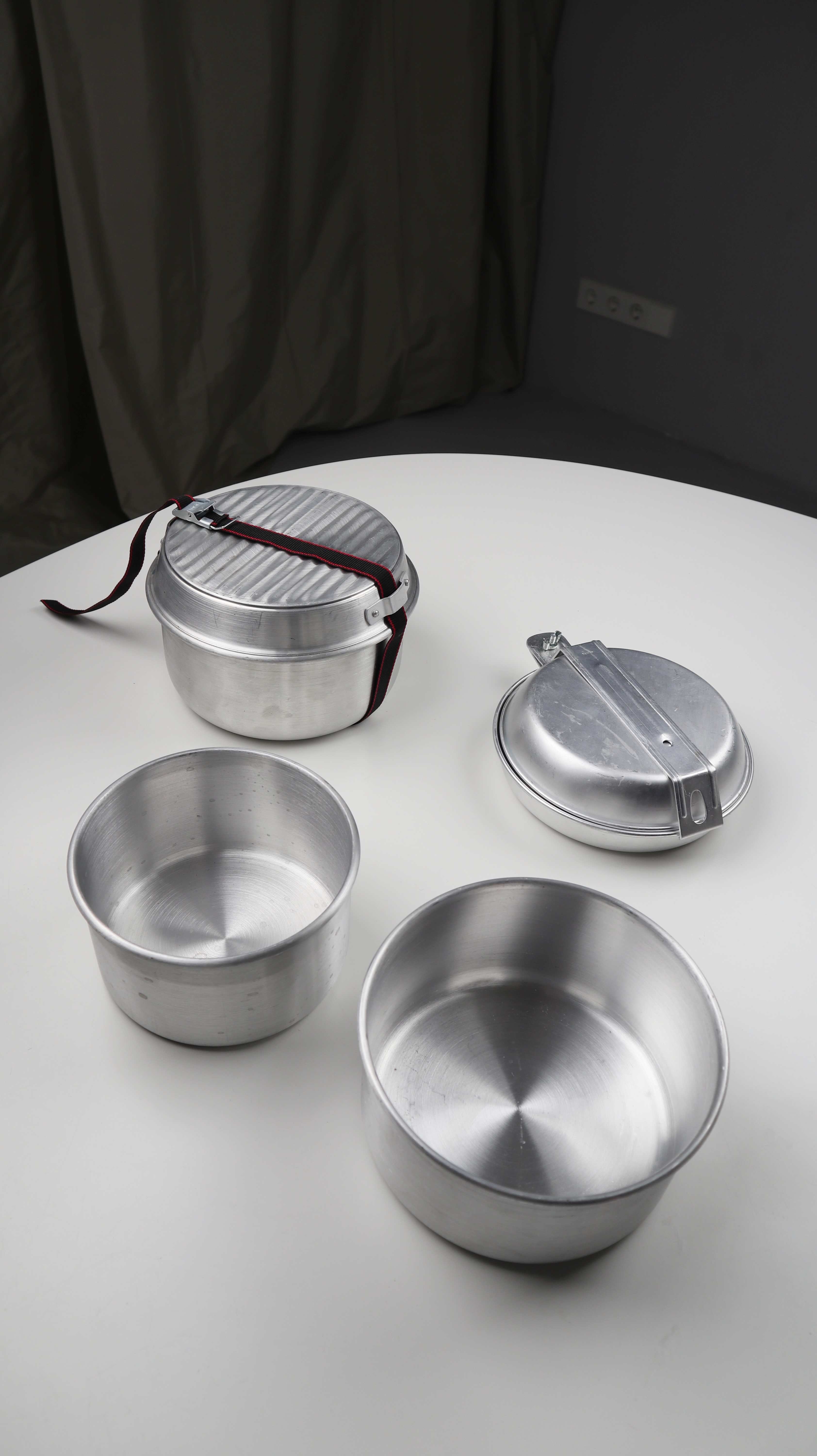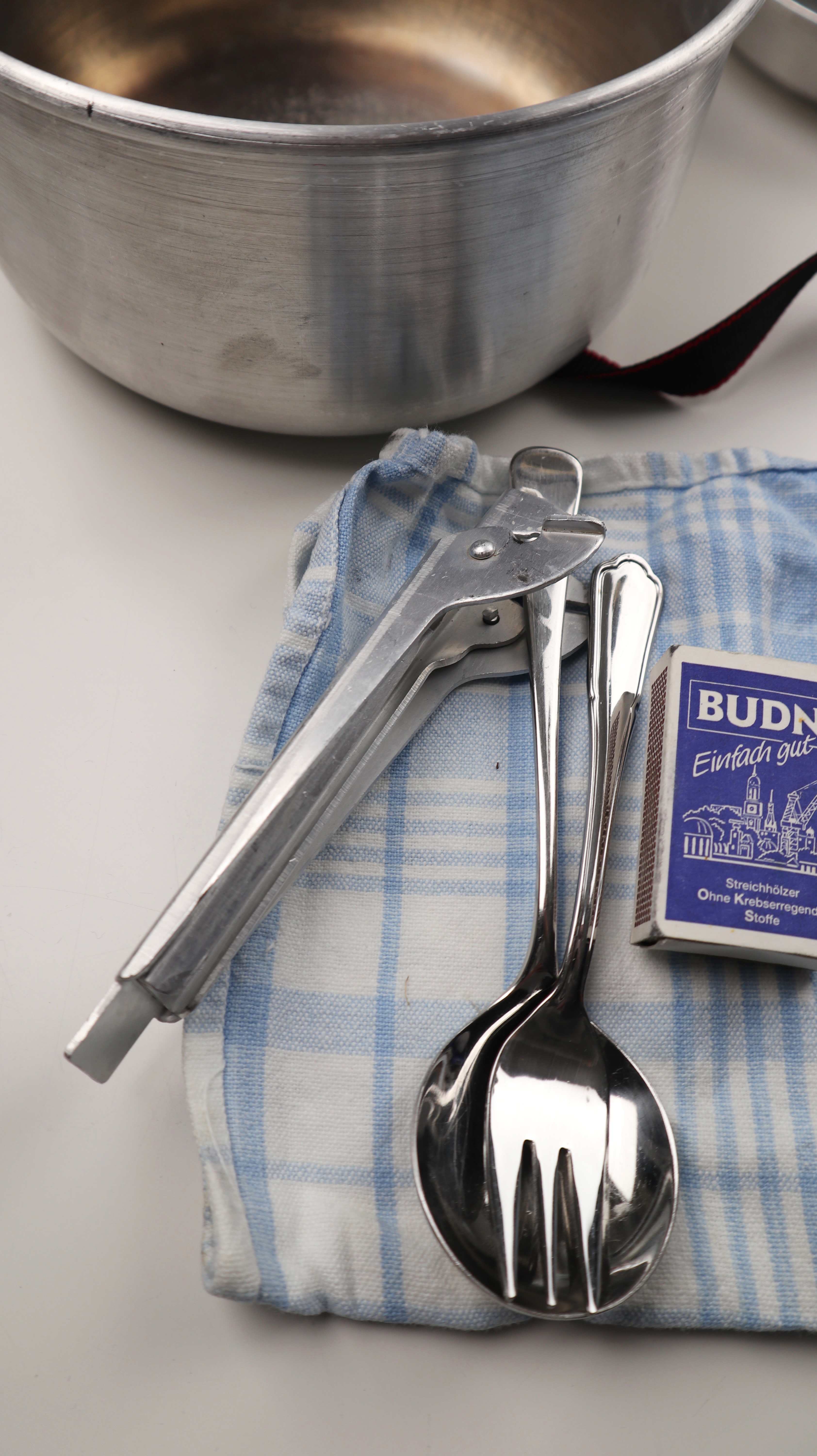 Set von kleinen Töpfen zum Kochen beim Wandern. Der kleine Griff sowie ein Geschirrtuch und Besteck ist dabei. Plus Versand
