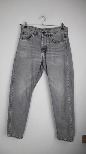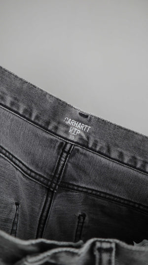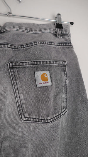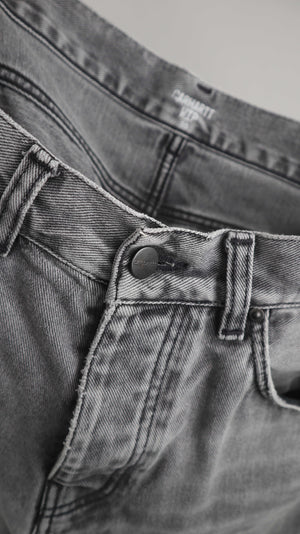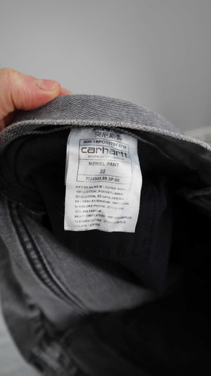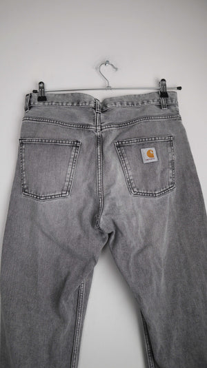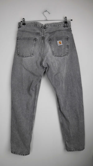 Graue Jeans von Carhartt in 30, das Modell heißt Newel Pant. 42 cm Bundweite, 28 cm Schritthöhe und 73 cm Innenbeinlänge. Plus Versand