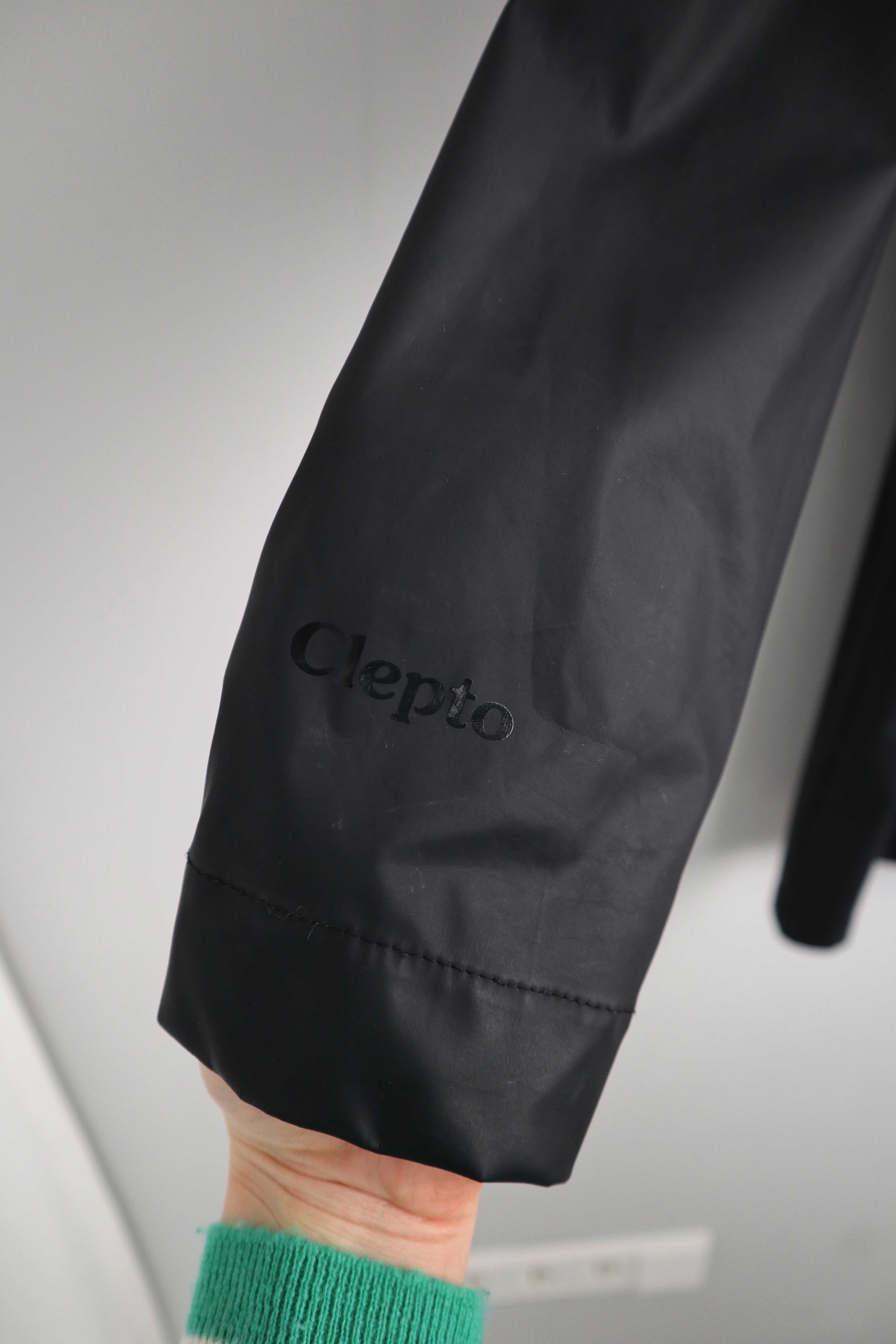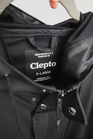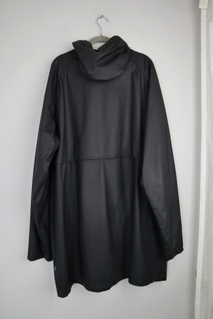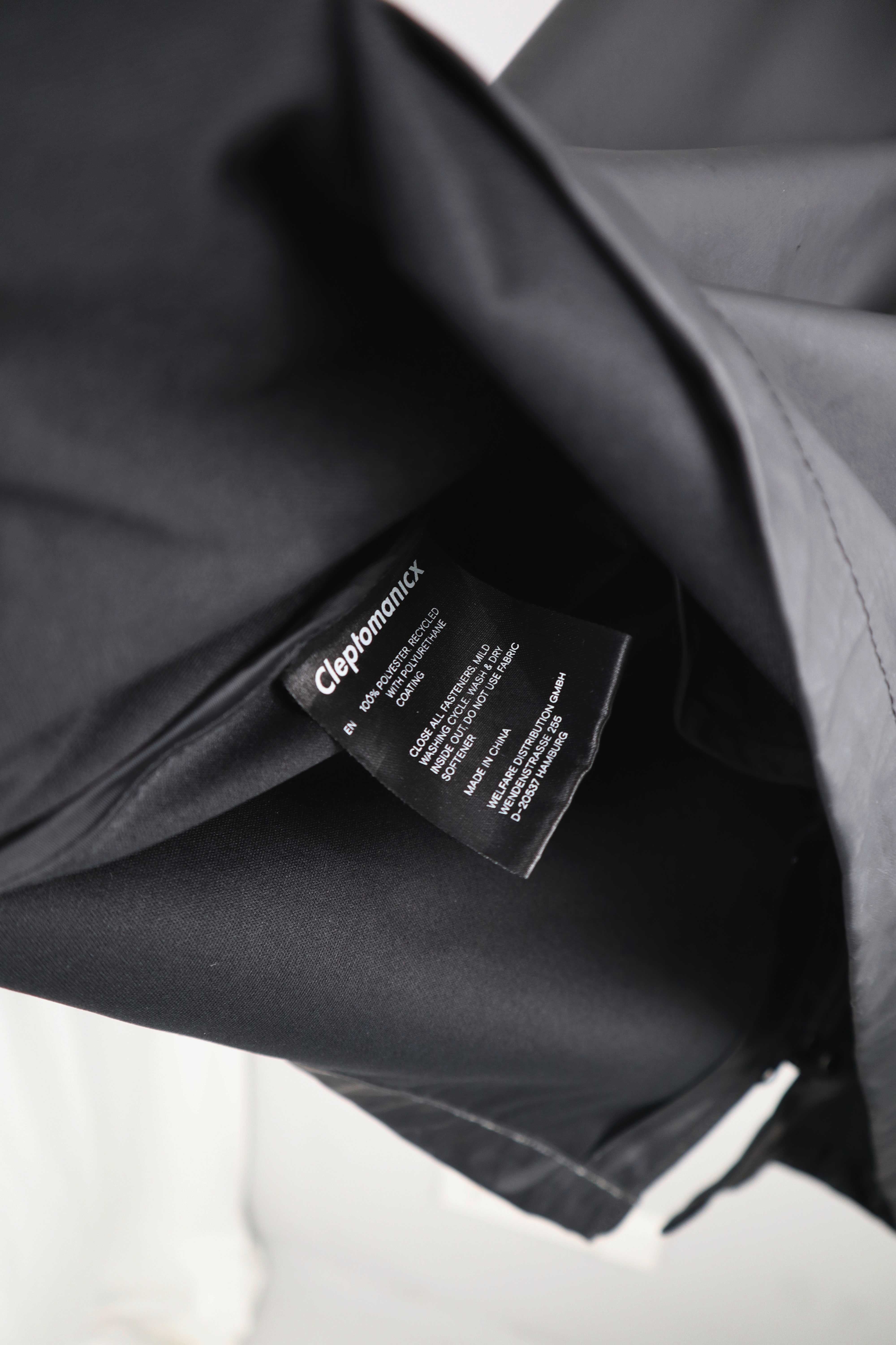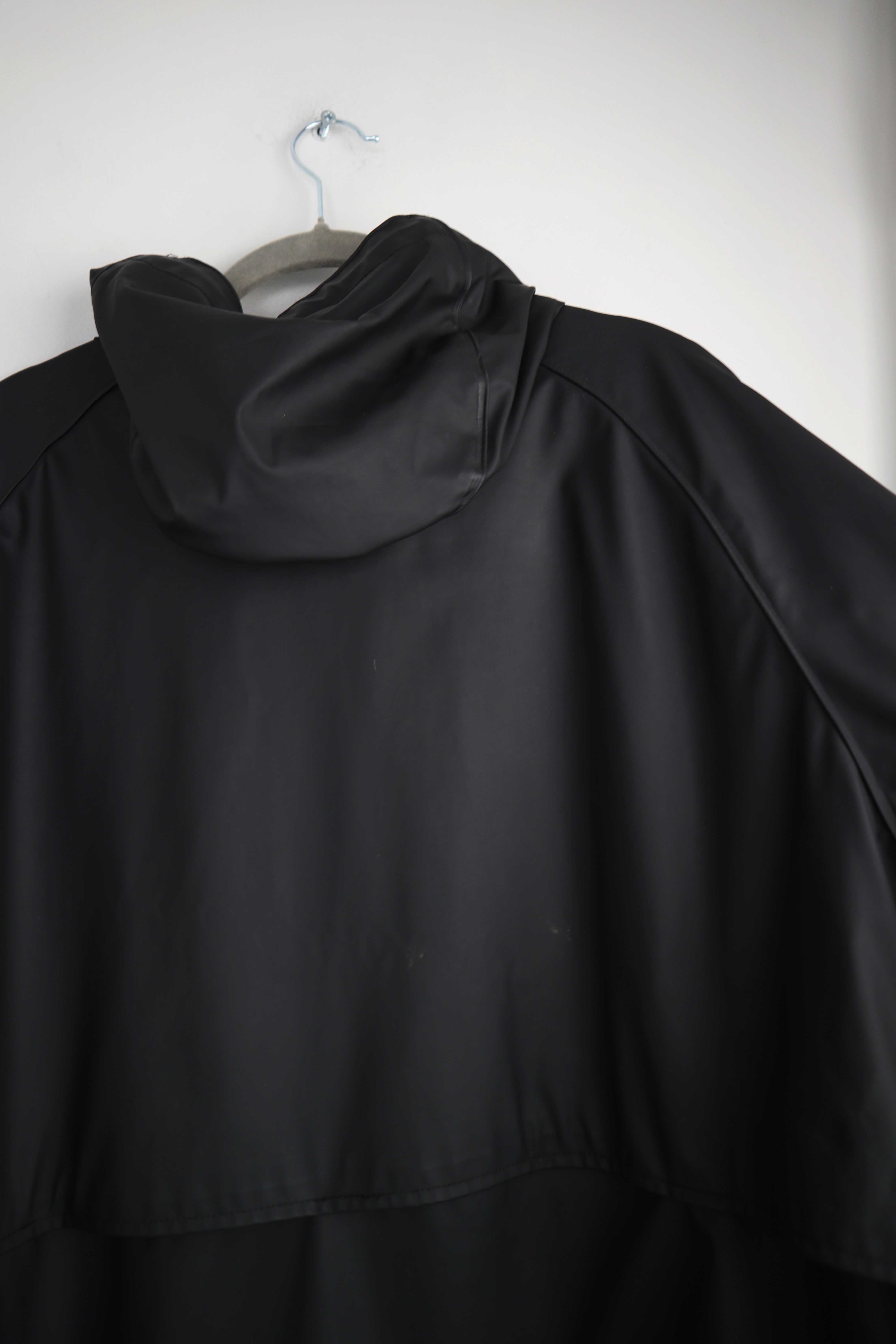 Schwarzer Regenmantel von Cleptomanicx. Er ist in XL ausgeschildert und passt auch einer 40 L super, mit einem Pullover drunter. Hinten am Nacken unter der Kapuze gibt es Benutzungsspuren. Sonst sehr gut und nirgends Peeling oder Risse. 63 cm Achselweite und 83 cm Länge. Plus Versand