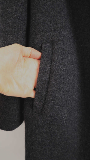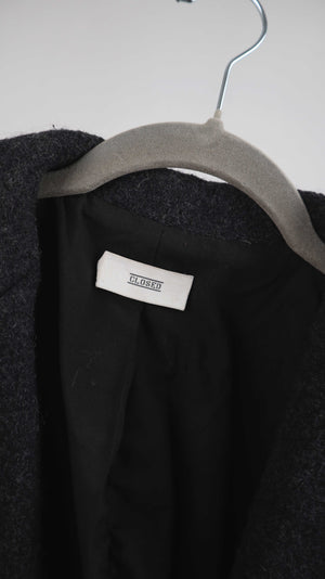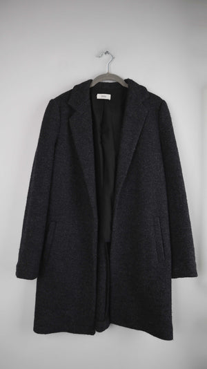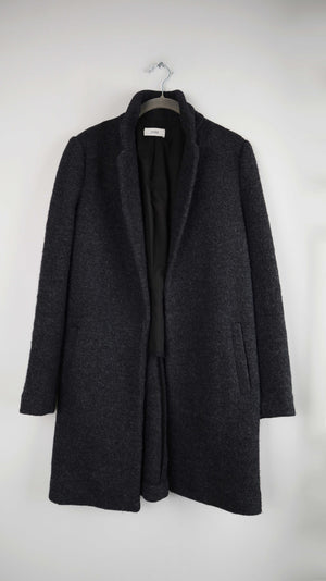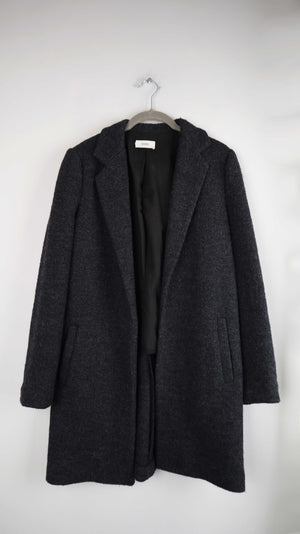 Grauer Mantel von Closed aus Schurwolle. Er hat vorne keinen Knopf und seitlich Taschen. Er passt einer S bis M und ist eher schmal geschnitten. 46 cm Achselweite und 85 cm Länge. Plus Versand