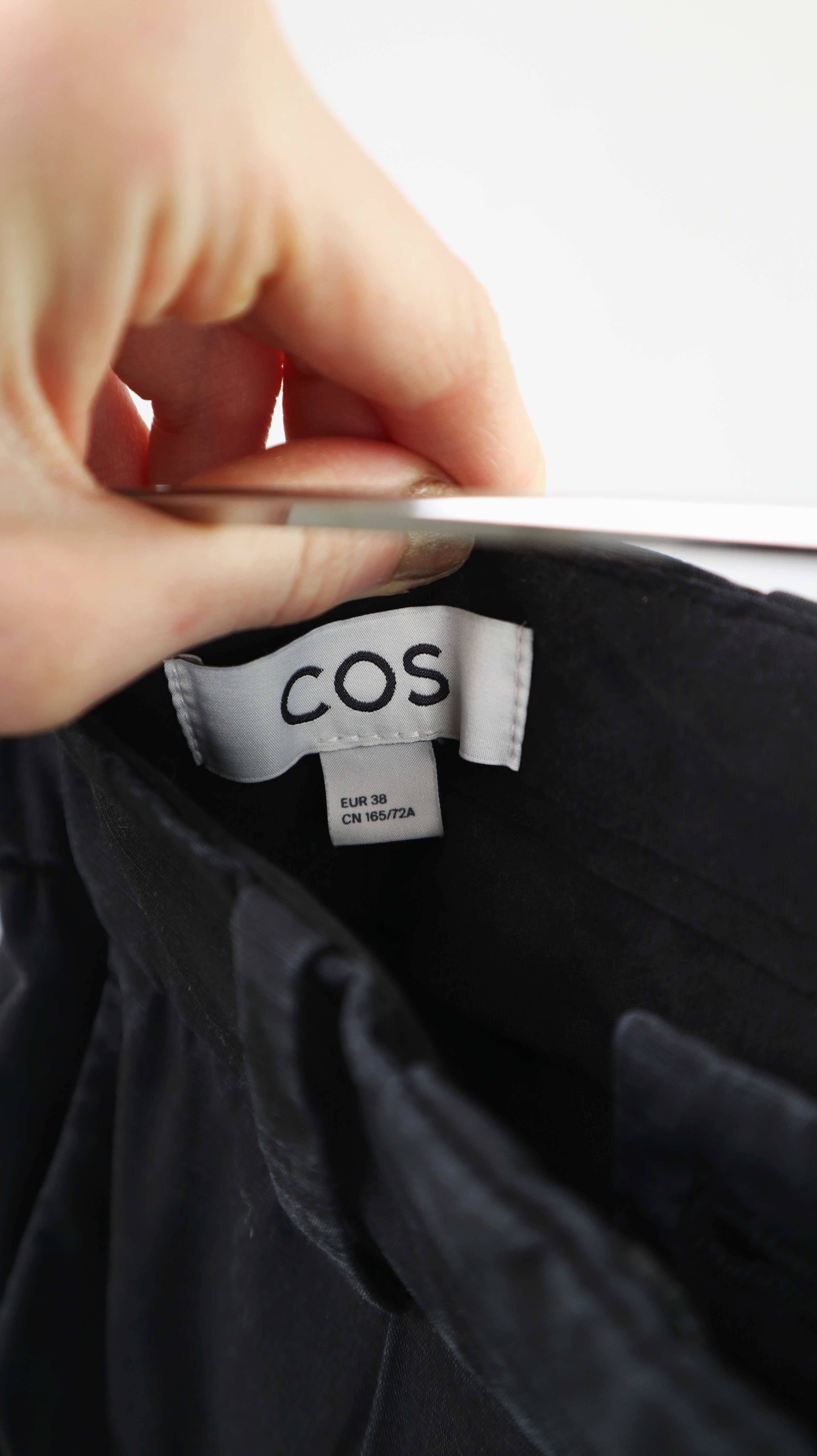 Dunkle Hose in 38 M von COS. Sie sitzt mid waist. 39 cm Bundweite, 38 cm Schritthöhe und 64 cm Innenbeinlänge. Plus Versand