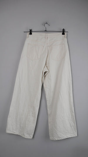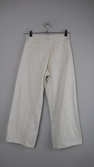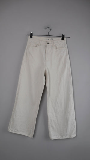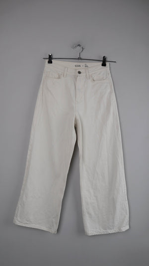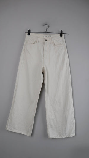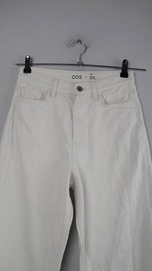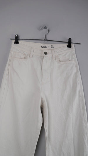 Weiße Hose von COS in Größe 25. Sie flared und high rise. 34 cm Bundweite, 29 cm Schritthöhe und 61 cm Innenbeinlänge. Plus Versand