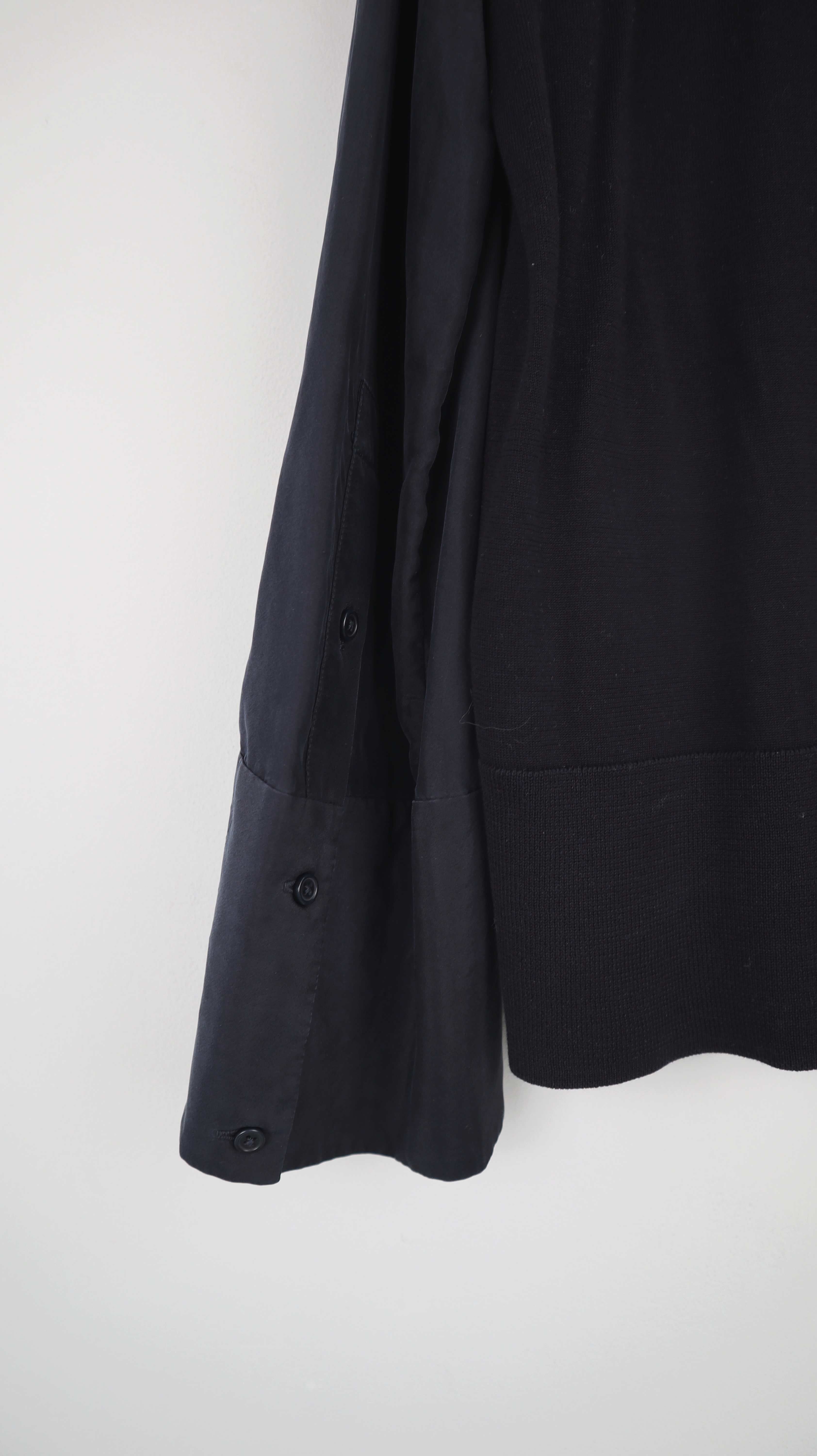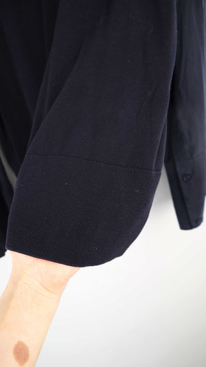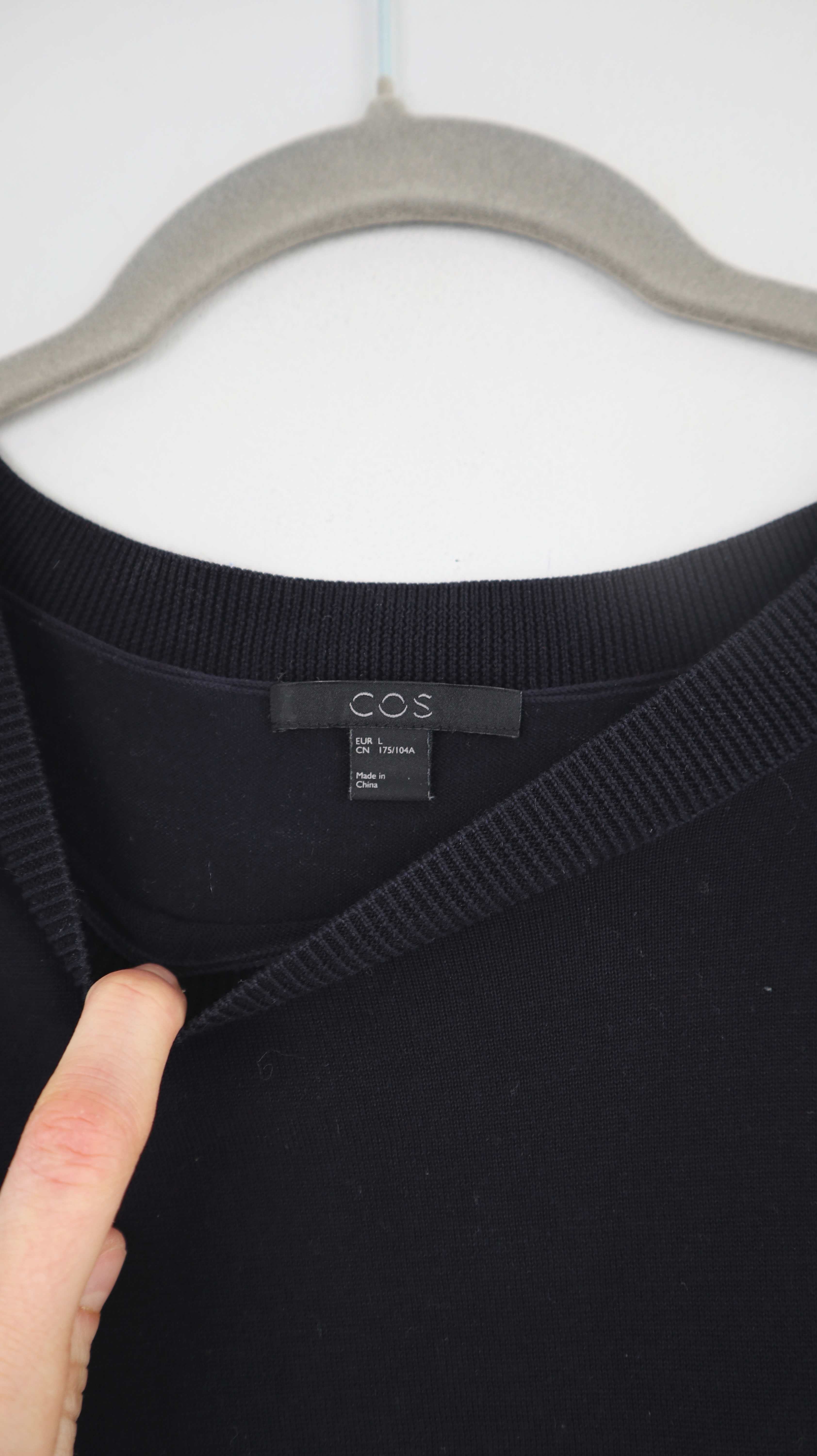 Dunkelblauer Pullover von COS in 40 L. Die Ärmel sind aus Seide, der Mittelteil aus Baumwolle. 56 cm Achselweite und 60 cm Länge. Plus Versand