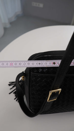 Schwarze Umhängetasche aus Leder, geflochten. Am Zipper ist ein Bündel mit Fransen. 18 x 26. Plus Versand