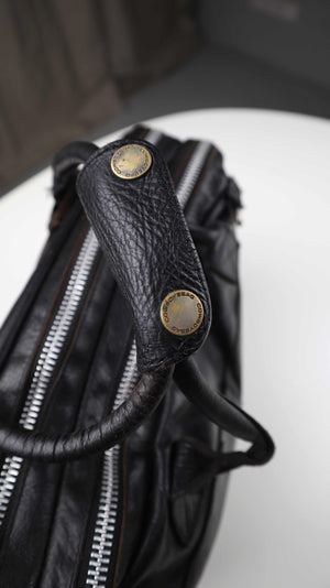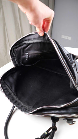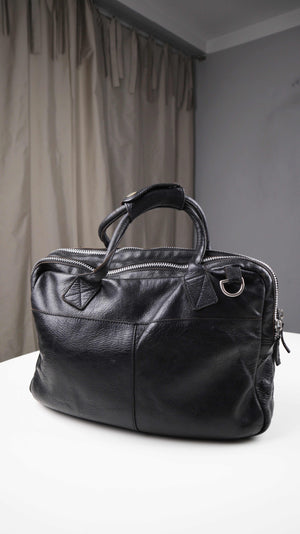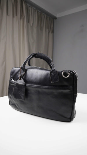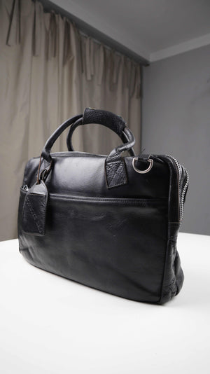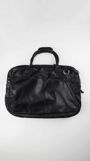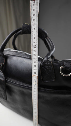 Schwarze Ledertasche von Cowboysbag. Sie hat Benutzungsspuren am Zipper vorne und kann auch als Schultertasche getragen werden. Der Riemen fehlt, die Befestigungen sind etwas locker. Als normale Laptoptasche sehr gut geeignet. Plus Versand