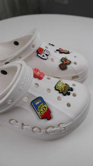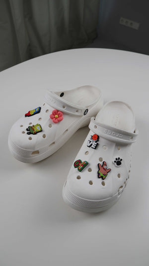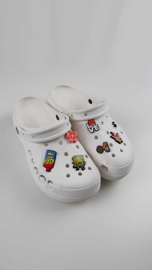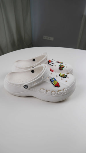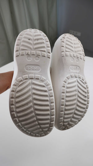 Weiße Crocs in W11 mit kleinen Figuren. Sie passen einer 42. Plus Versand