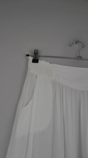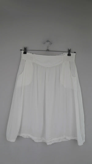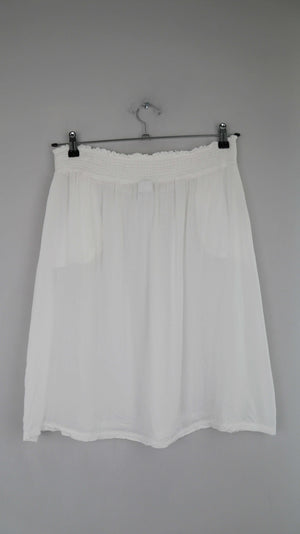 Kurzer weißer Midirock aus Stoff von Deerberg. Er passt einer 38 M und hat oben Gummizug. 40 cm Bundweite, 59 cm Länge. Plus Versand