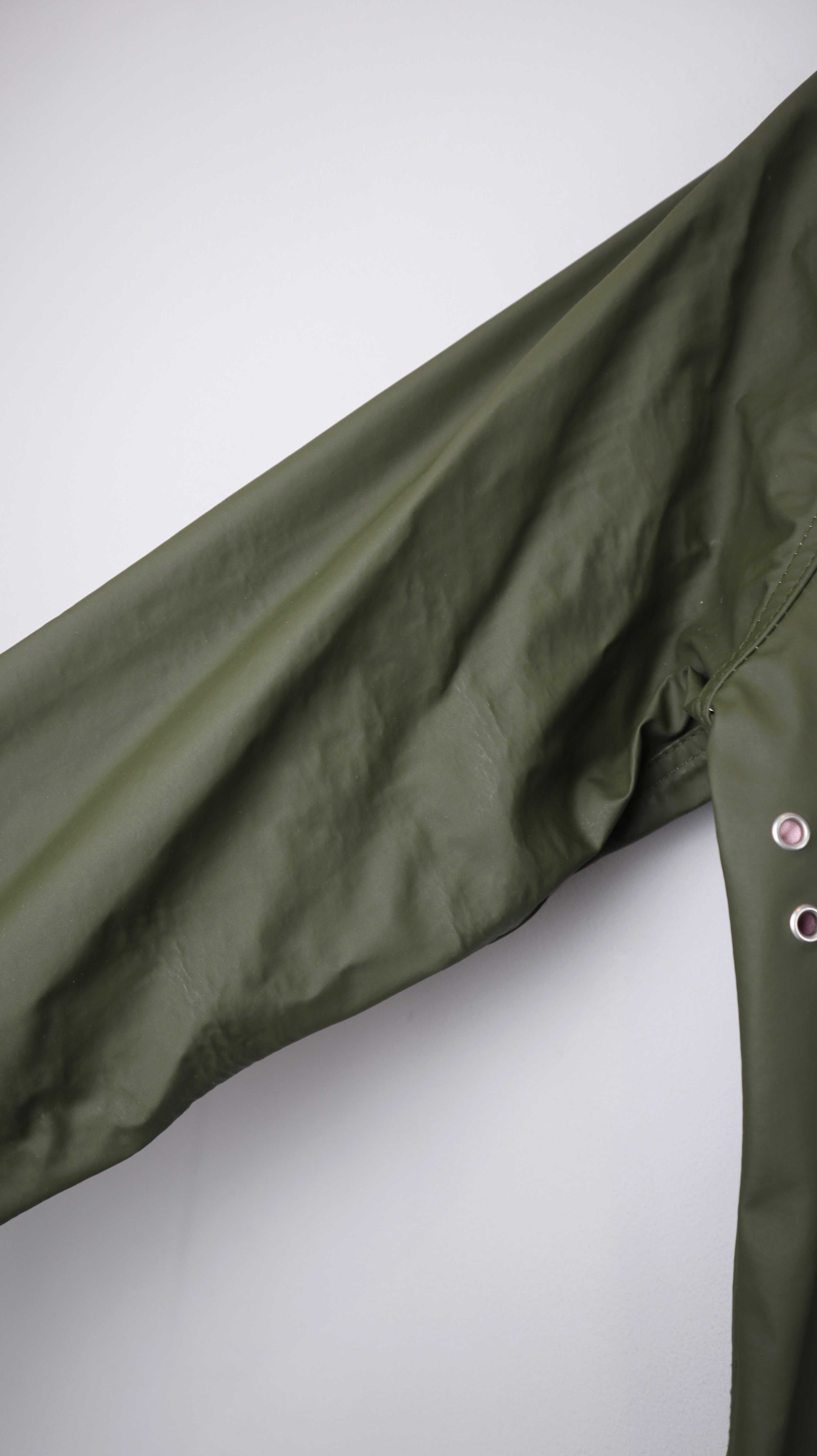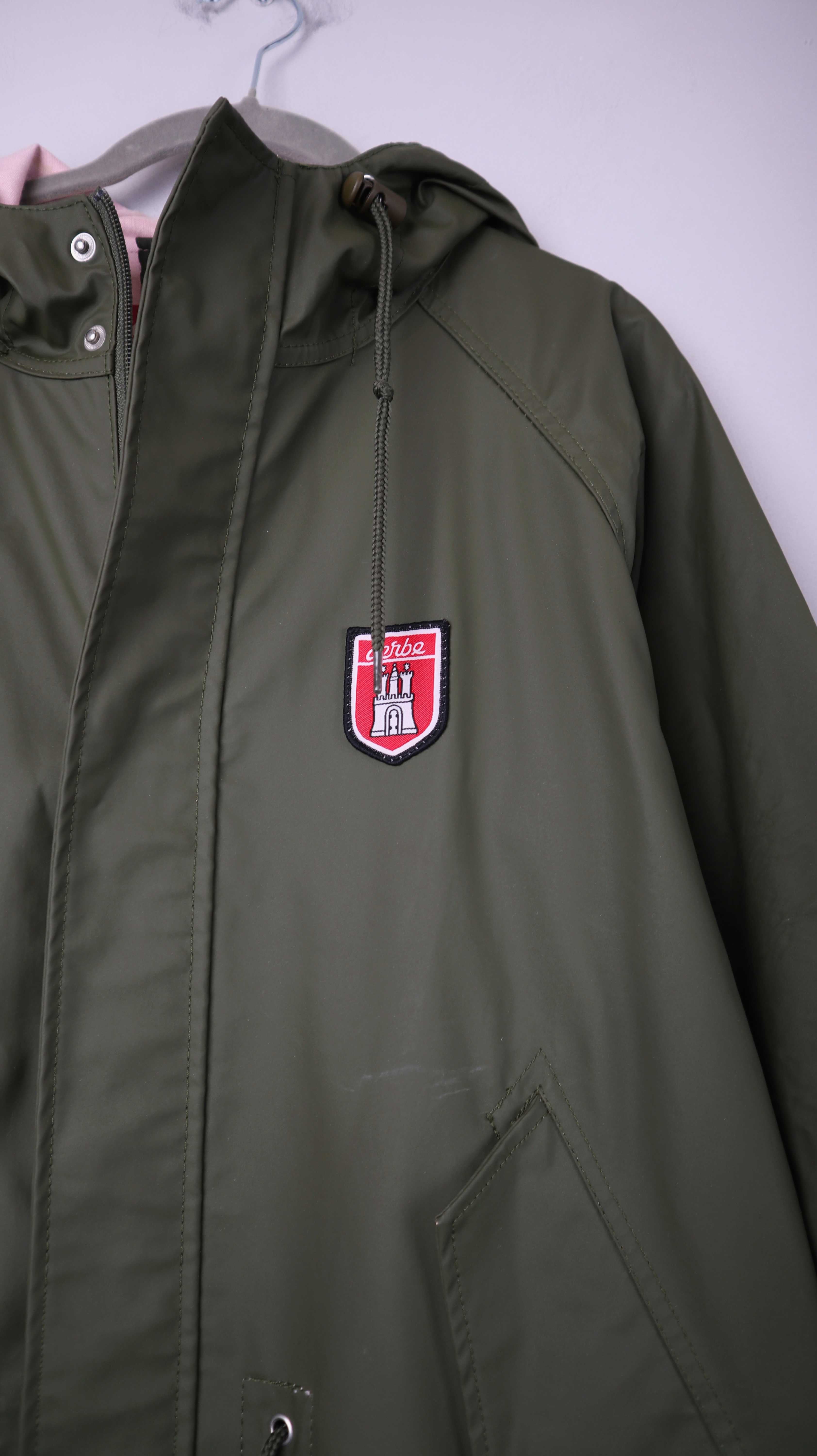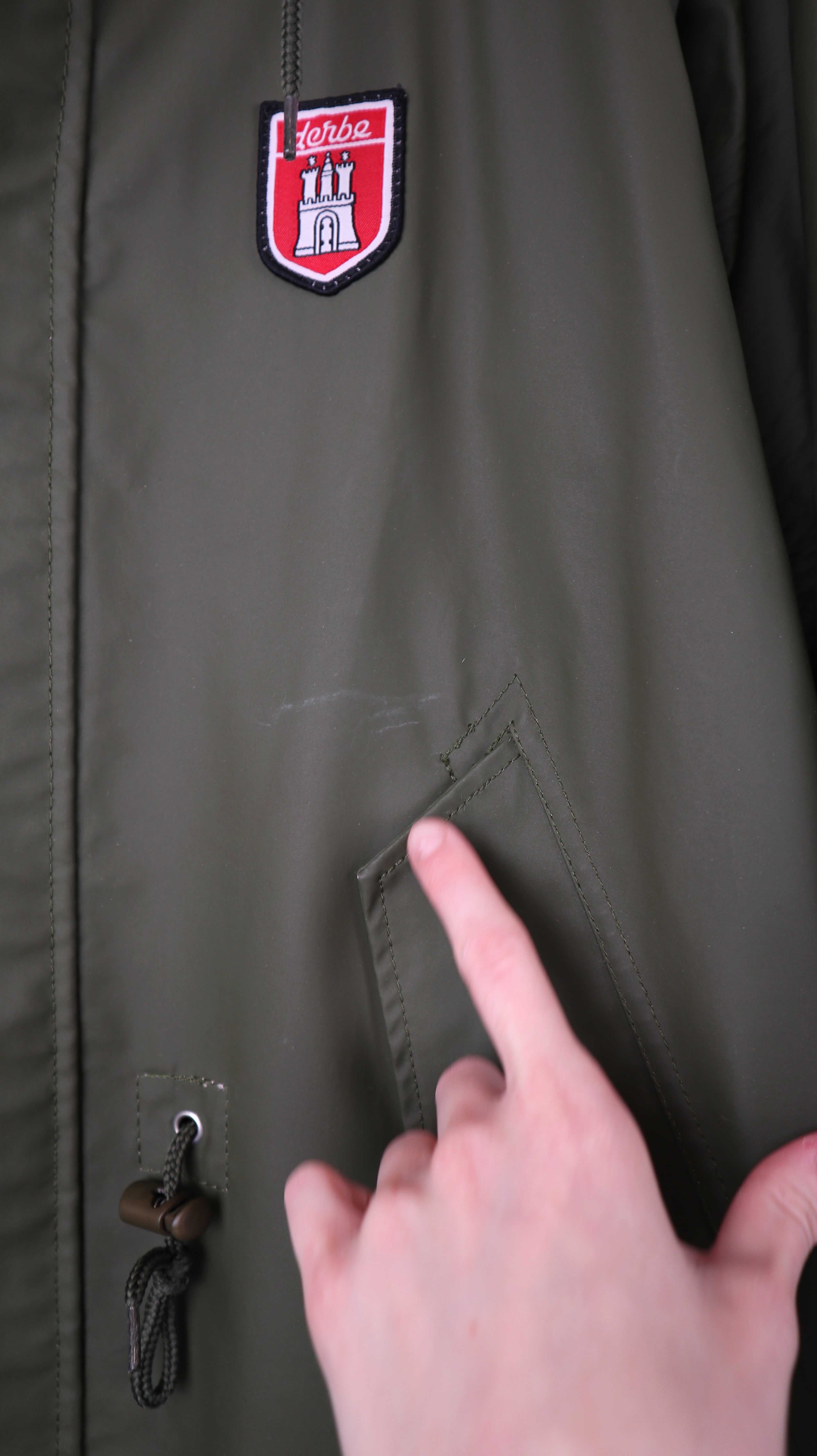 Grüne Regenjacke von Derbe Hamburg in 40 L. Die Ärmel haben so leichte Wellen (beide Seiten), wie man auf den Bildern sieht. Es gibt ein paar Benutzungsspuren. 55 cm Achselweite und 90 cm Länge. Plus Versand