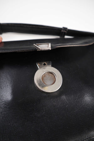 Kleine Design Ledertasche mit einem silbernen Verschluss und einem verstellbaren Gurt. Beim Verschluss ist der Drücker defekt und es fehlt der Stift, um die Tasche fest zu verschließen. Plus Versand