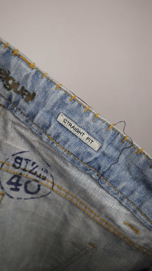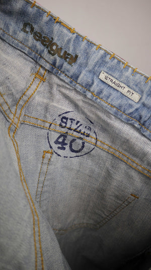 Blaue Jeans von Desigual in 40 L mit vielen Details. 42 cm Bundweite, 22 cm Schritthöhe und 83 cm Innenbeinlänge. Plus Versand
