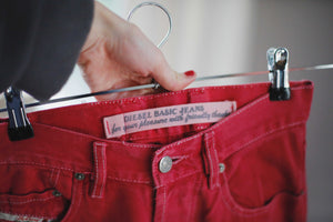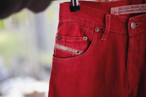 Basic rote high waist Jeans von Diesel. Ausgeschilderte Größe ist 27, sie passt einer 38 M wunderbar. 35 cm Bundweite, 28 cm Schritthöhe und 72 cm Innenbeinlänge. Plus Versand