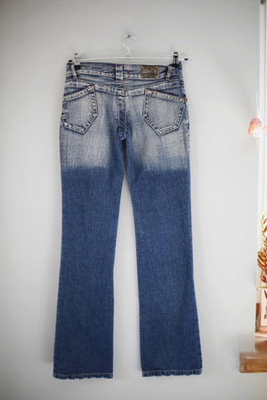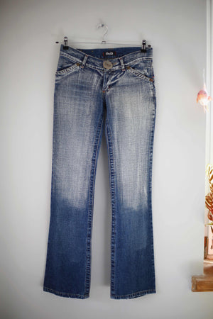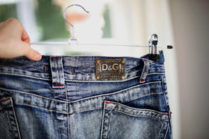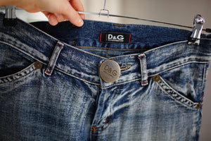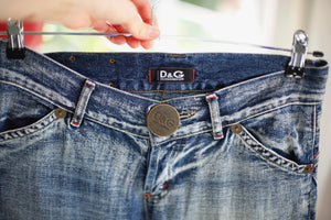 Blaue Jeans von Dolce & Gabbana. Sie passt einer 38 M wunderbar und hat vorne einen großen auffälligen Knopf. 39 cm Bundweite, 18 cm Schritthöhe und 82 cm Innenbeinlänge. Plus Versand