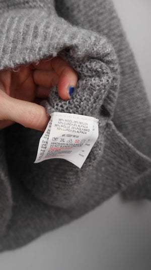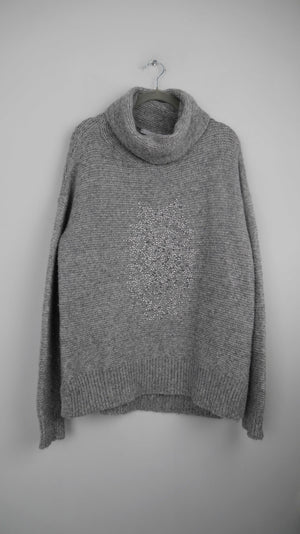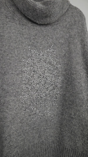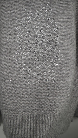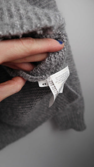 Grauer Strickpullover von Don't label me. Er ist mit Wolle (56 Prozent) und Glitzer auf der Brust. Er passt einer 40 bis 42. 60 cm Achselweite und 63 cm Länge. Plus Versand