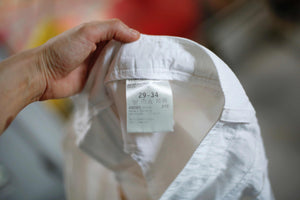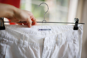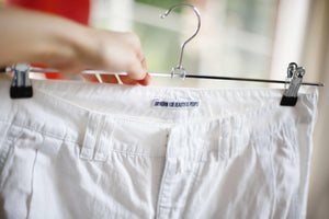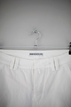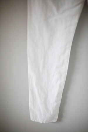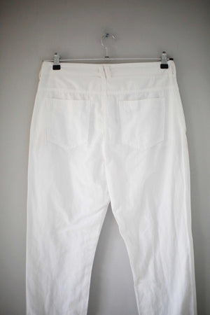 Weiße Stoffhose aus Leinen und Baumwolle. Soe passt einer 40 L. 41 cm Bundweite, 29 cm Schritthöhe und 74 cm Innenbeinlänge. Plus Versand