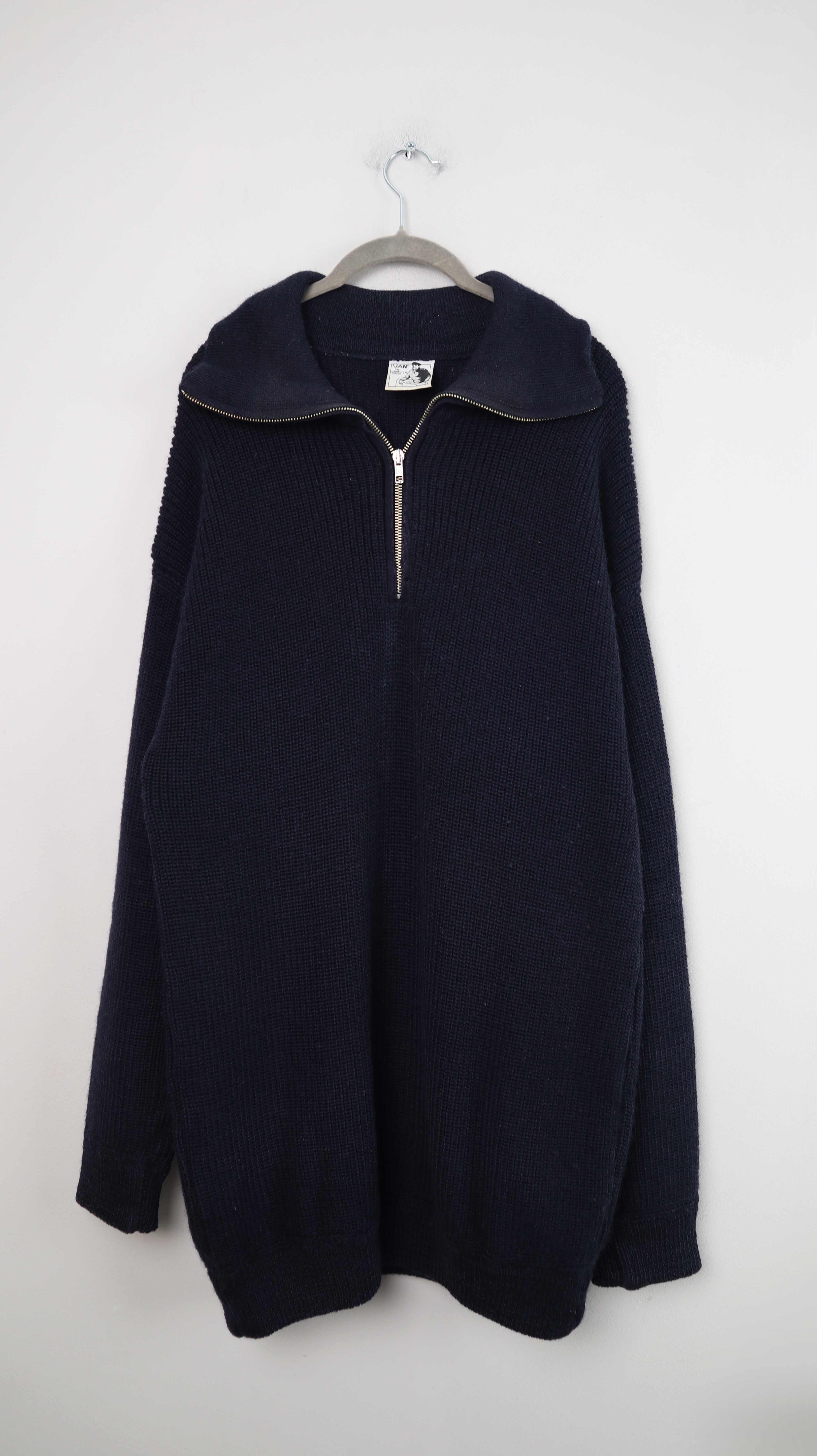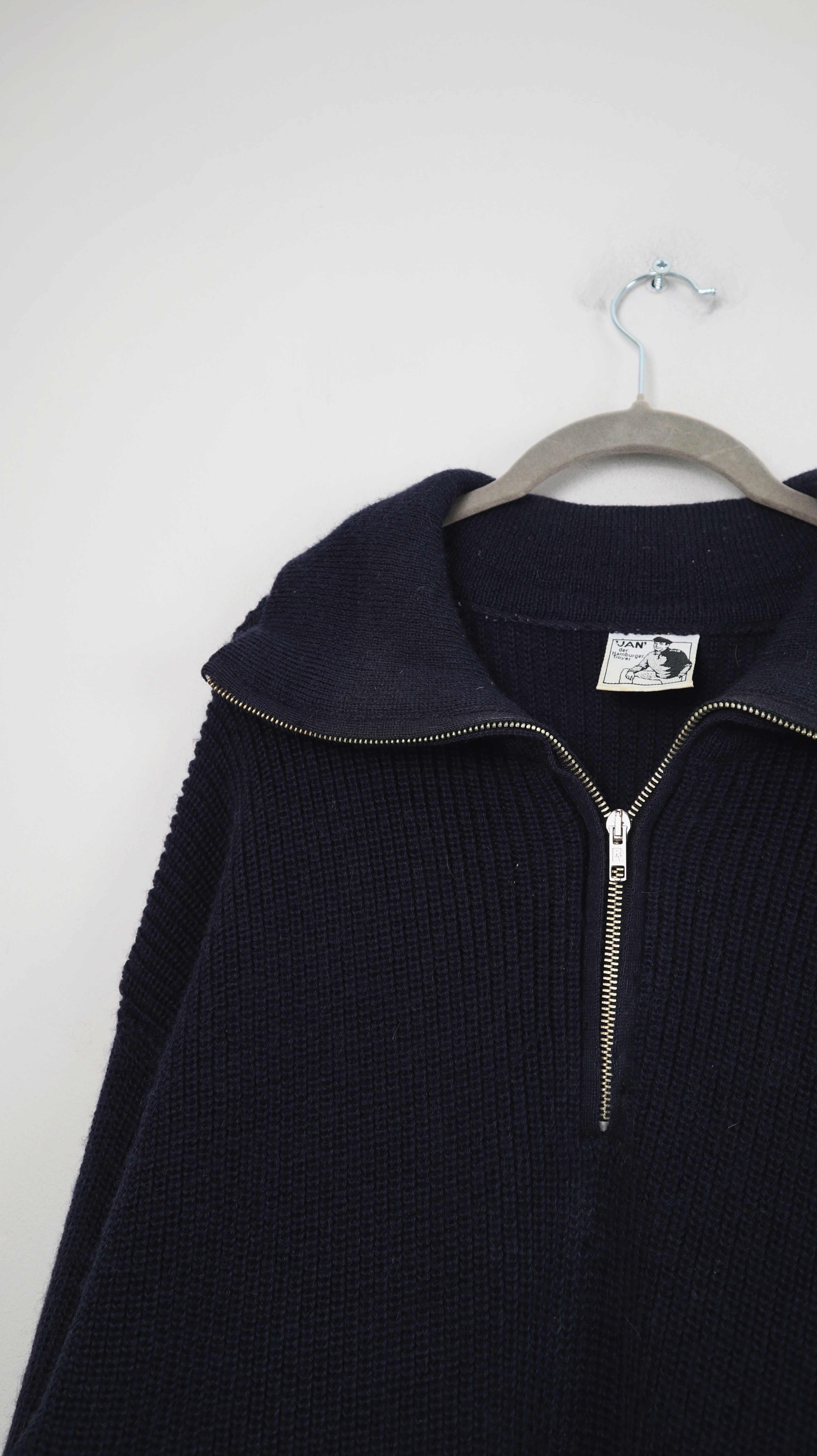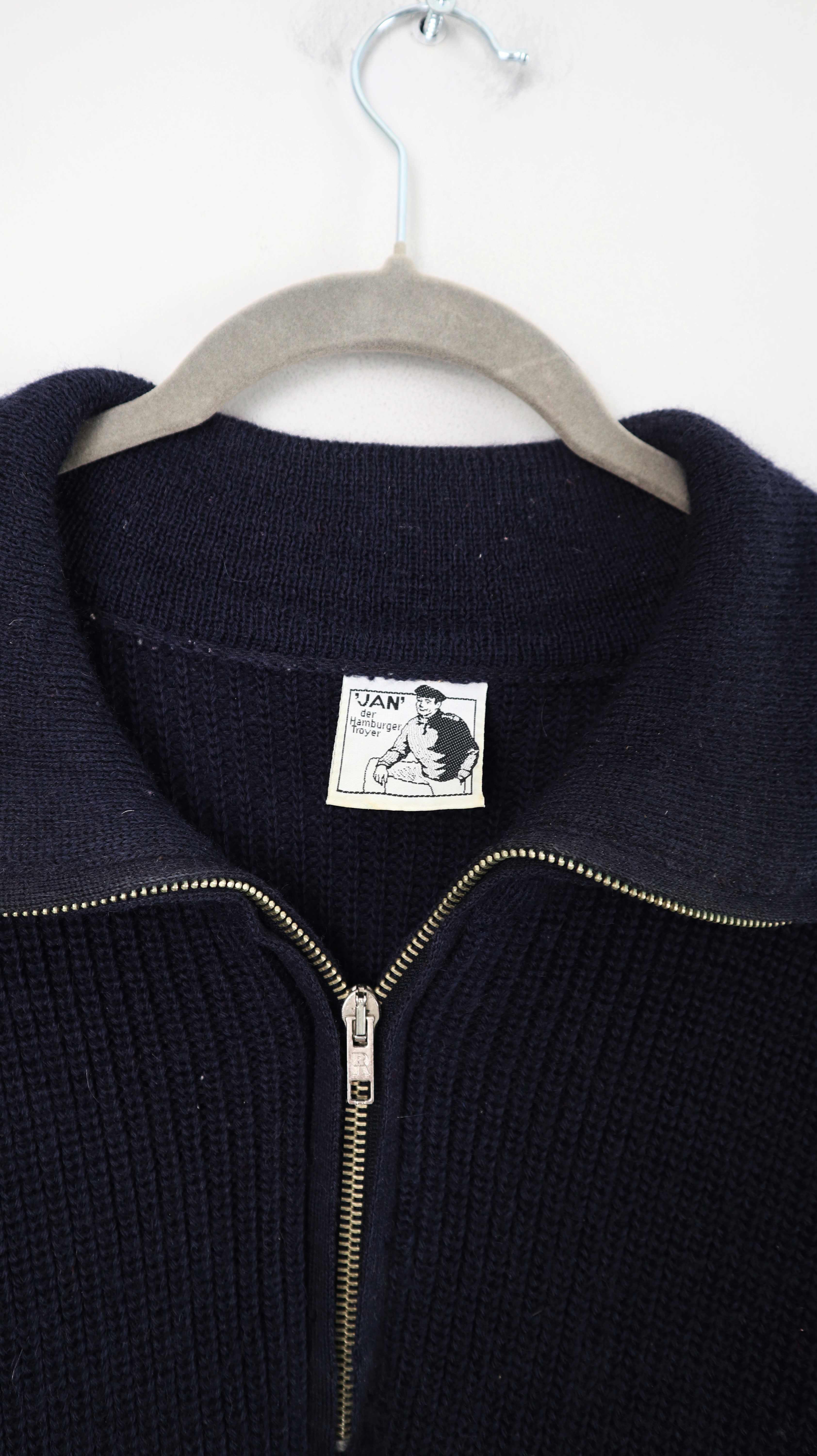 Dunkelblauer Pullover aus Schurwolle von Elbsegler. Originaler Pullover, er passt einer L bis XL und hat vorne den Zipper. 59 cm Achselweite und 83 cm Länge. Plus Versand
