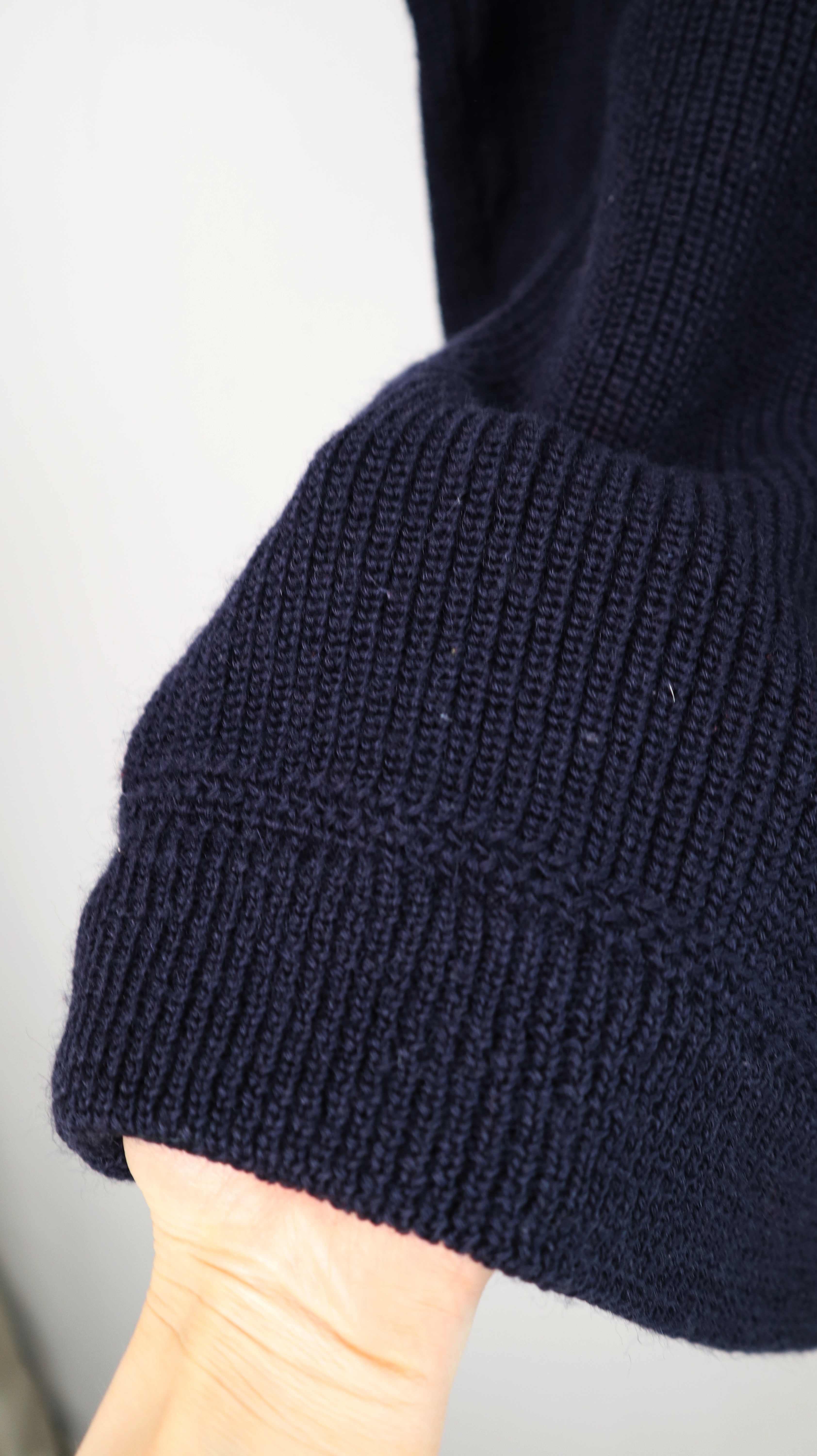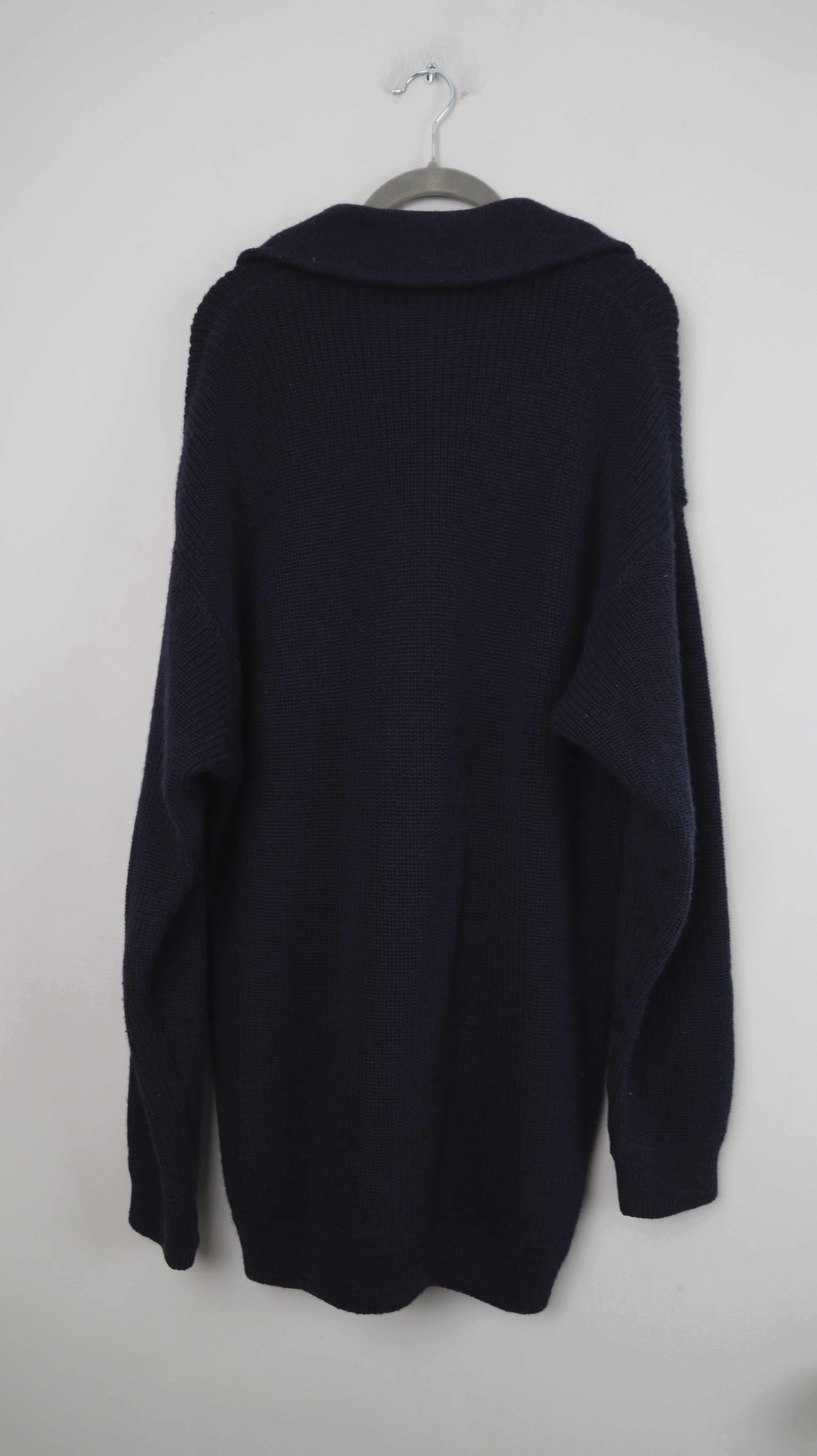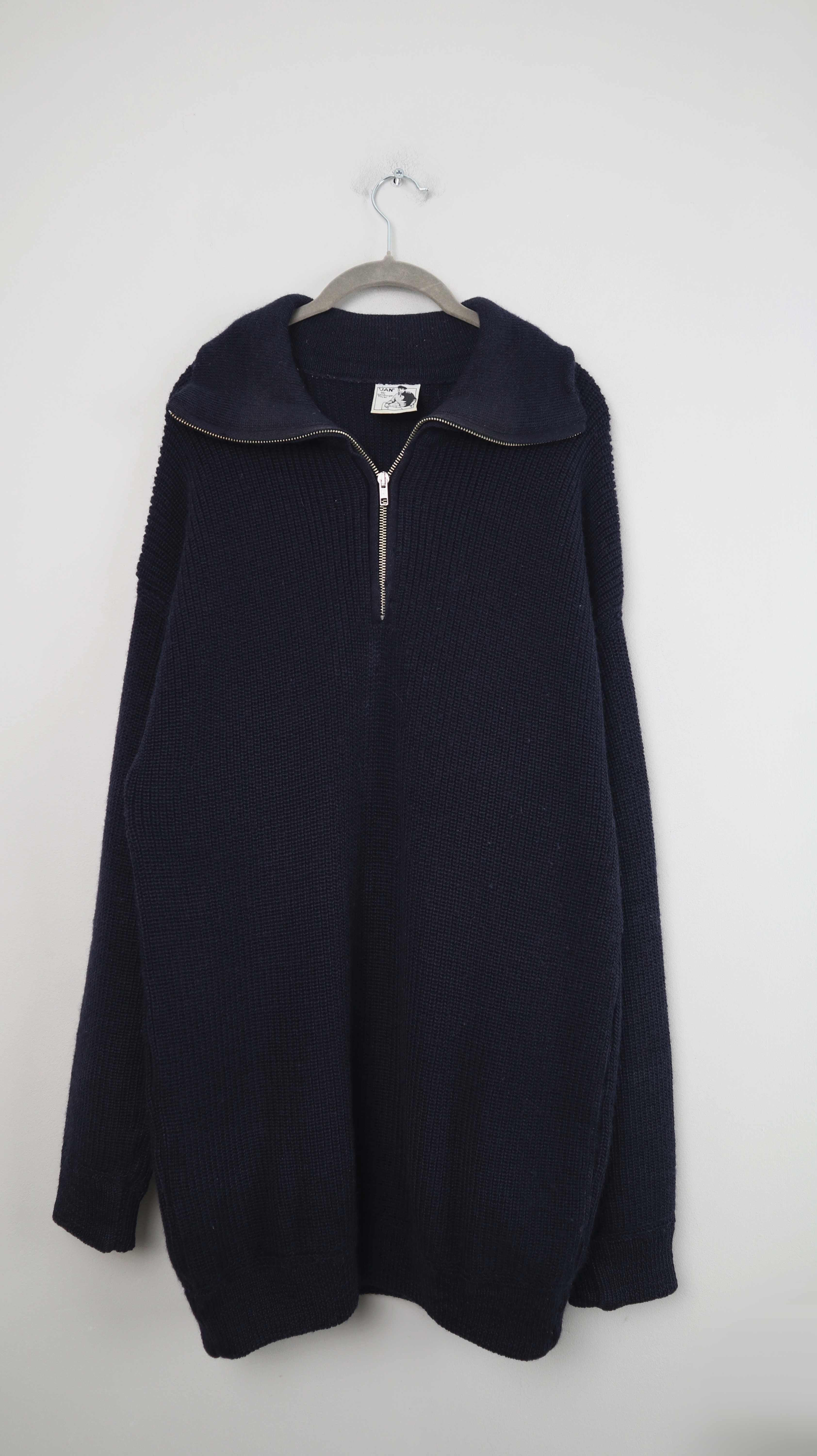 Dunkelblauer Pullover aus Schurwolle von Elbsegler. Originaler Pullover, er passt einer L bis XL und hat vorne den Zipper. 59 cm Achselweite und 83 cm Länge. Plus Versand