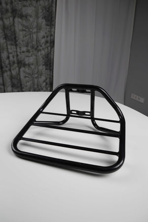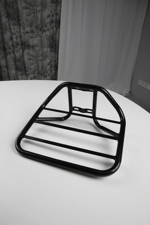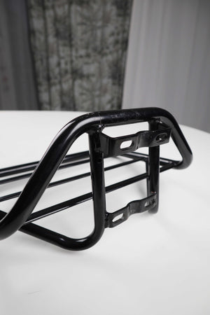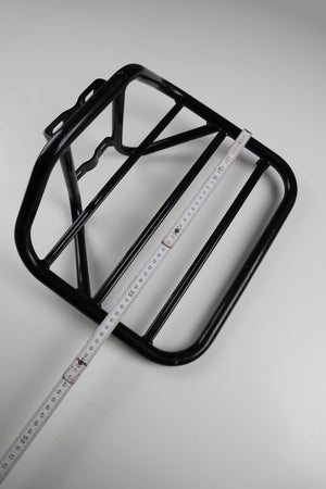 Schwarze Metallhalterung für den Fahrradlenker. Man kann dann eine Tasche oder einen Korb drauf befestigen. Plus Versand