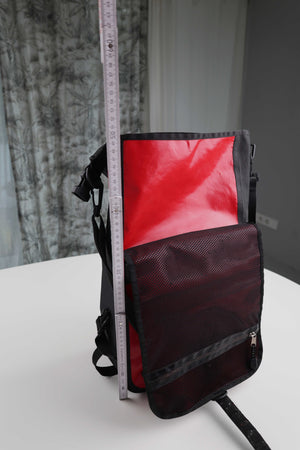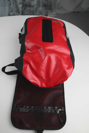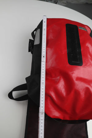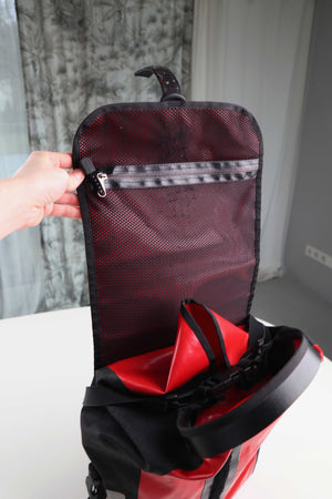 Rot schwarze Fahrradtasche von Four Season. Innen hat sie noch ein Fach mit Netz. Höhe etwa 41 cm und Breite 25 cm. Oben rollbar und wasserfest. Plus Versand