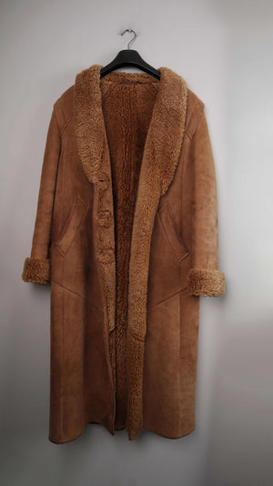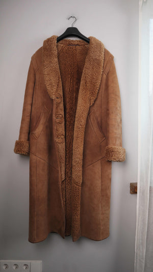 Wunderbarer Lammfellmantel von Friitala Made in Finland in Größe 42. Er ist braun, gefüttert und passt einer 40 L bis 42 XL. 57 cm Achselweite und 122 cm Länge. Plus Versand