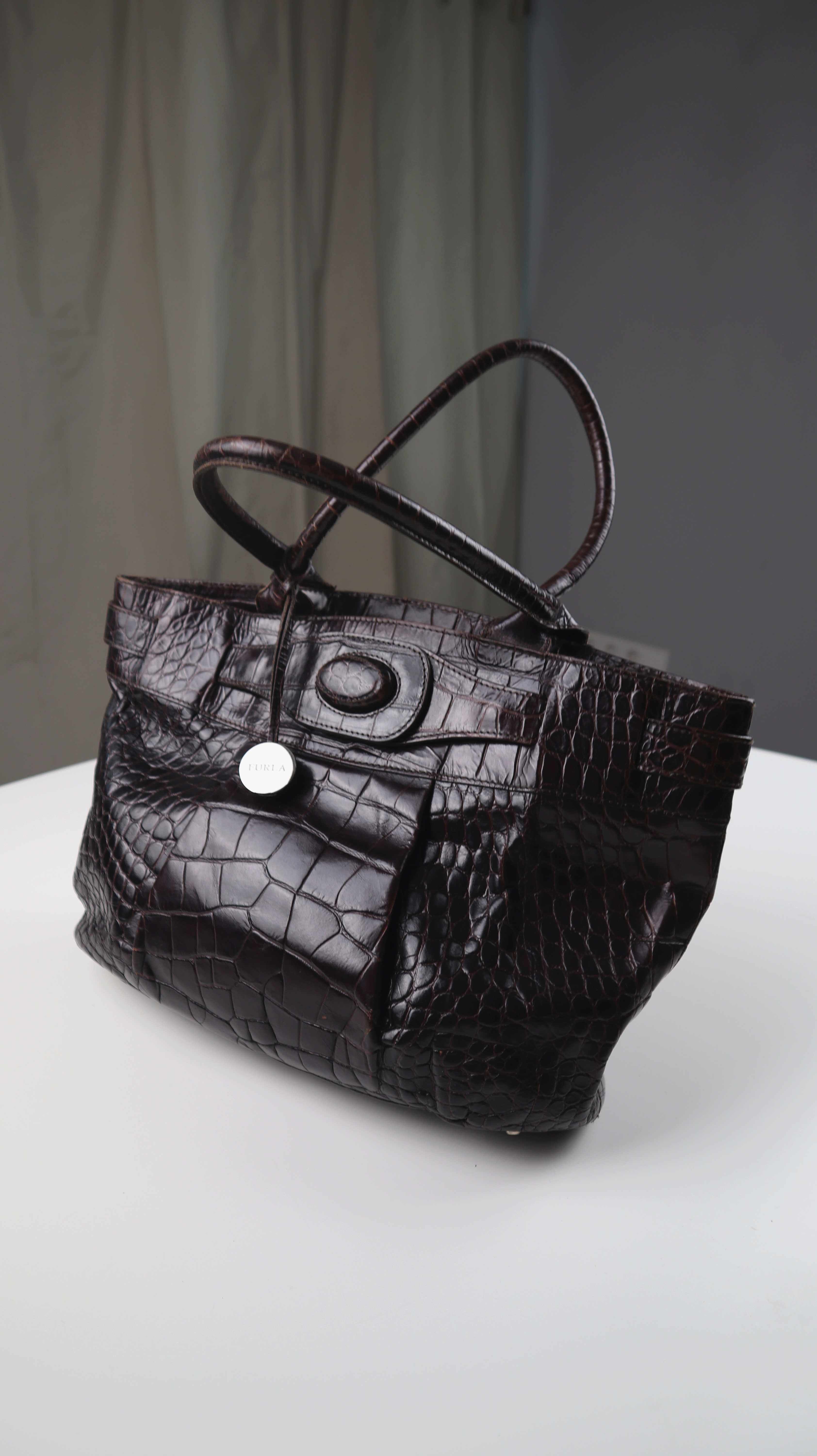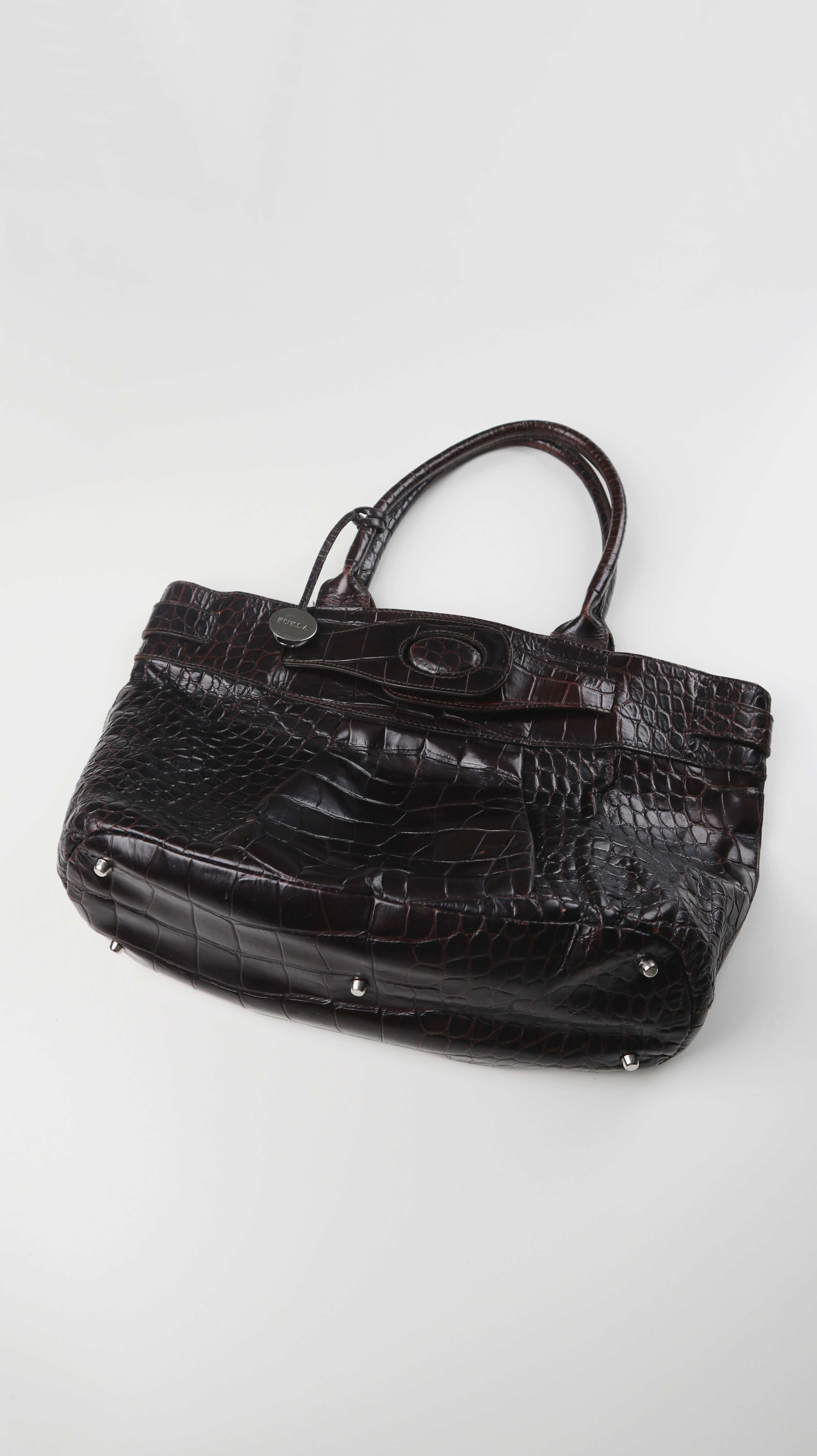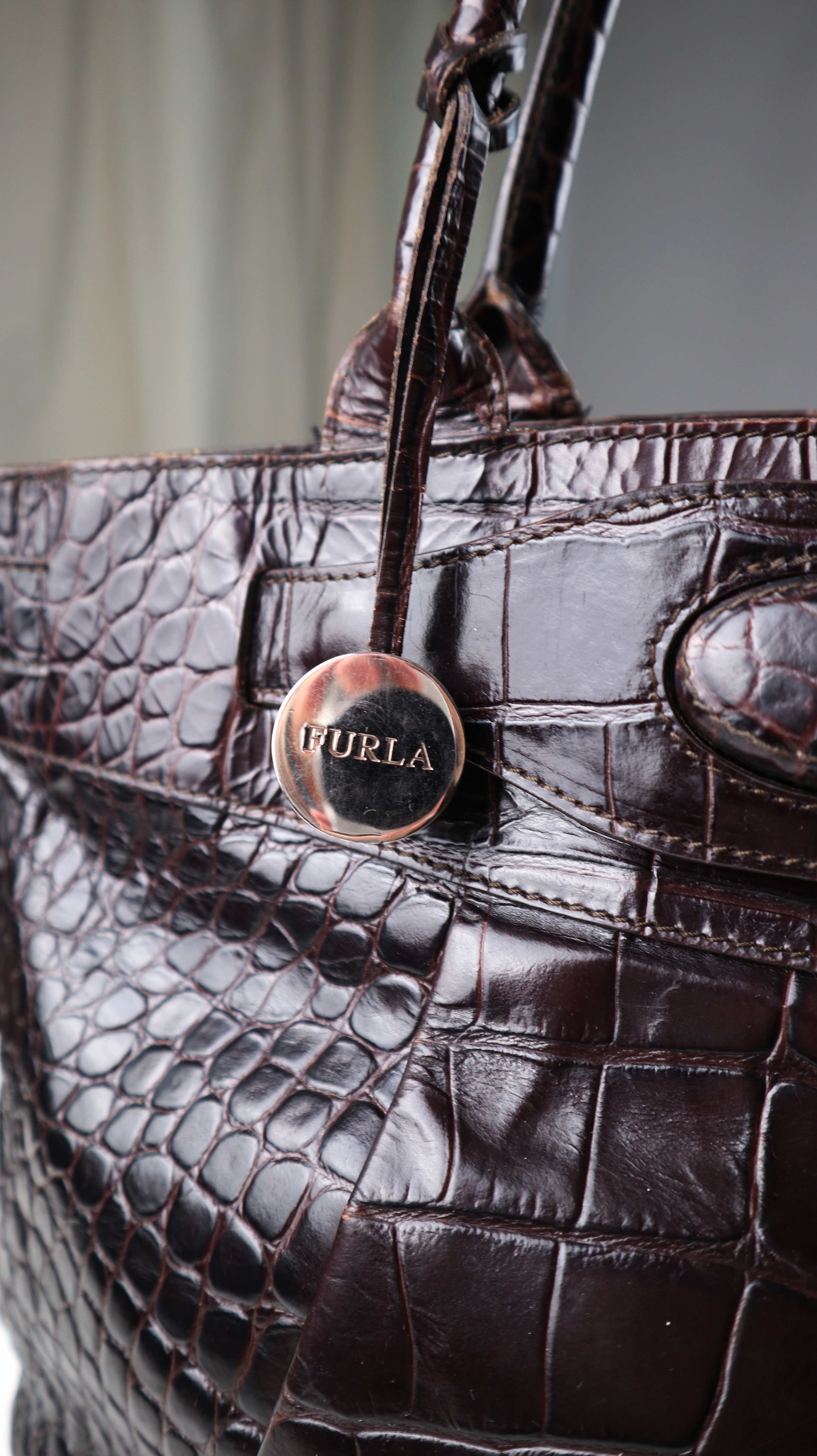 Braune Handtasche von Furla aus Leder. Oben ist ein Magnetknopf als Verschluss. Plus Versand