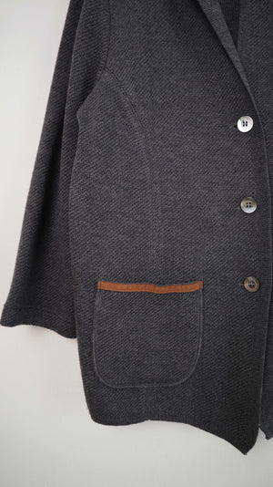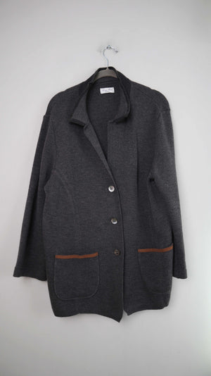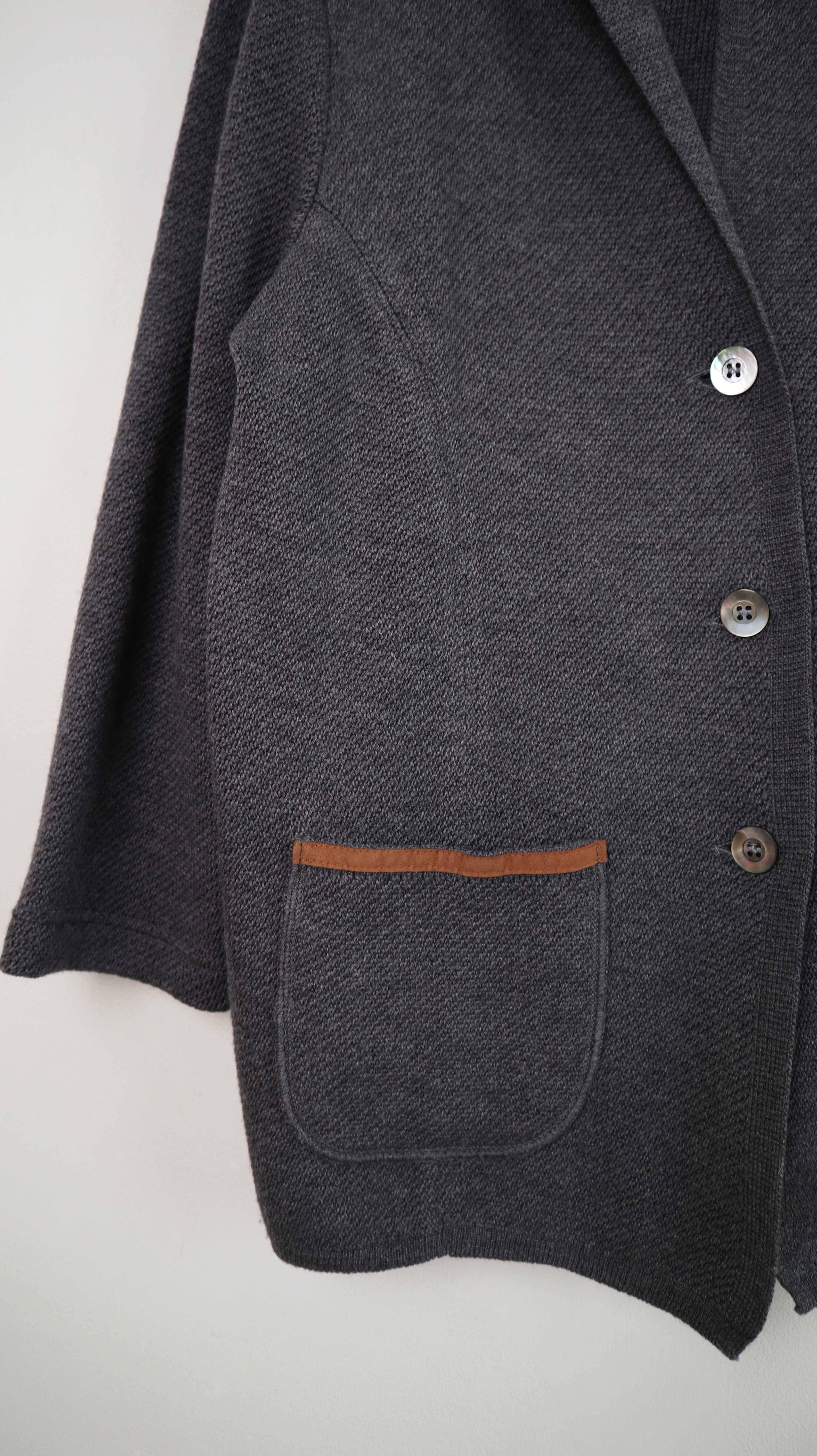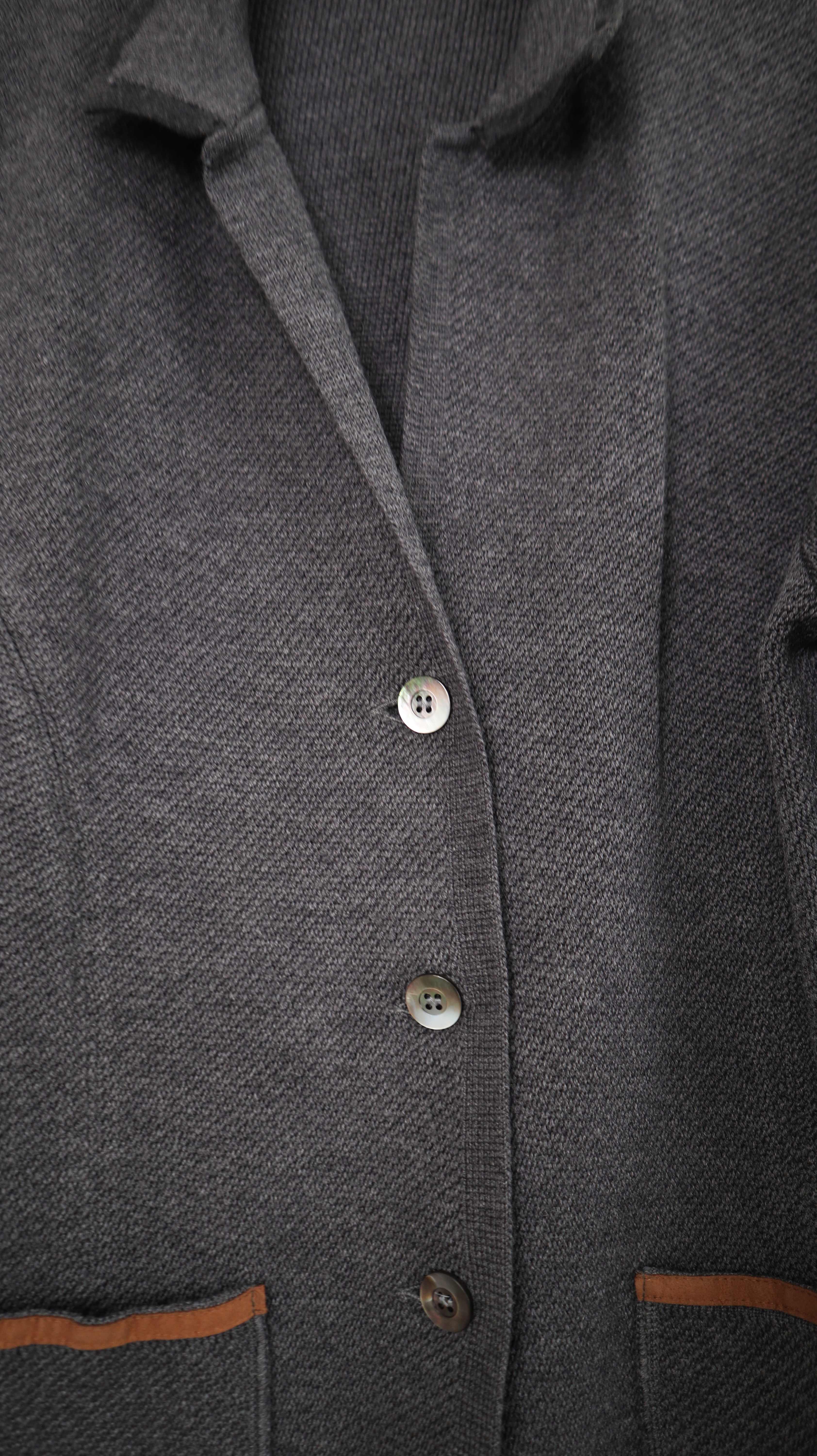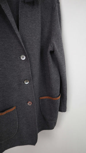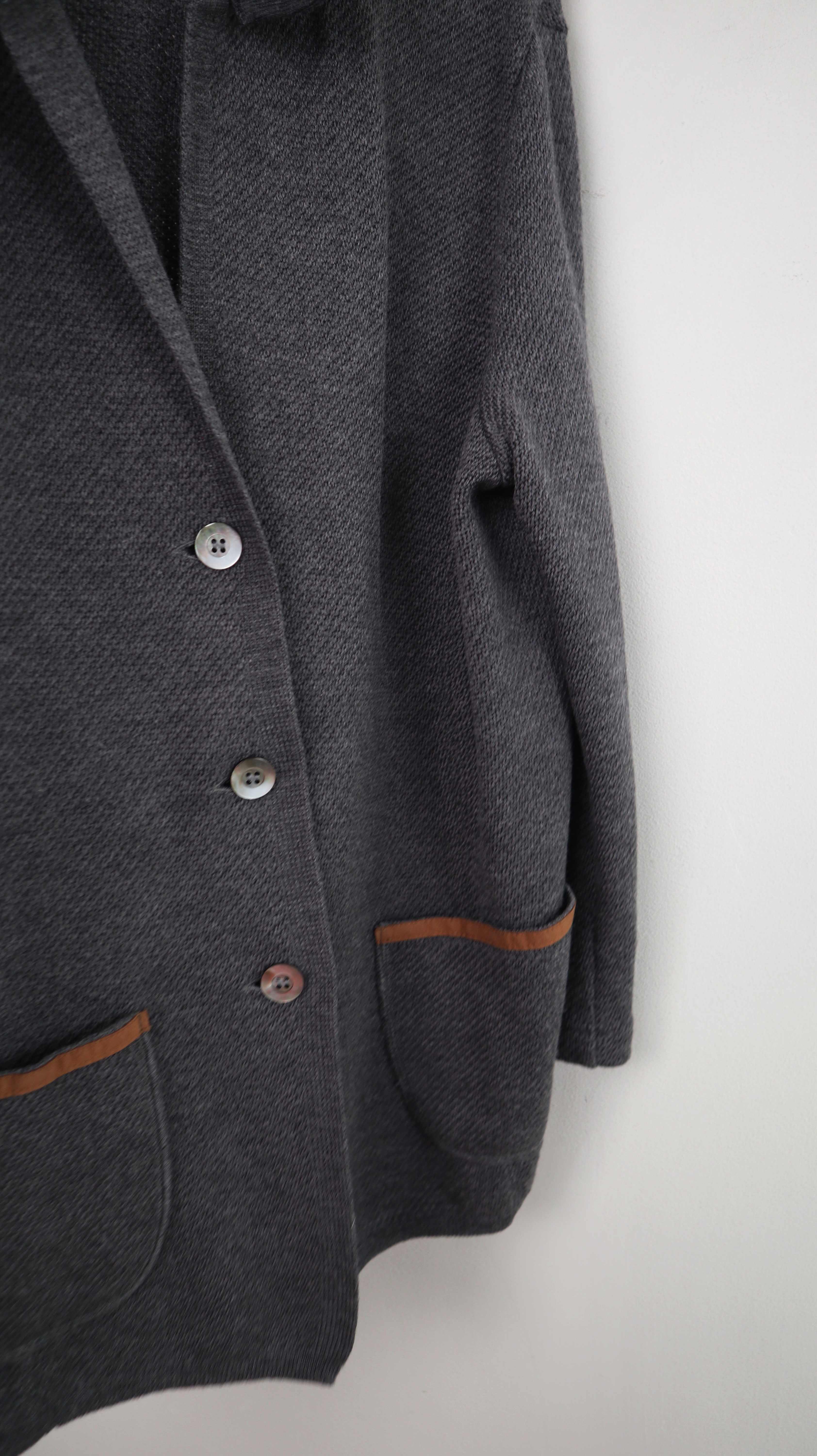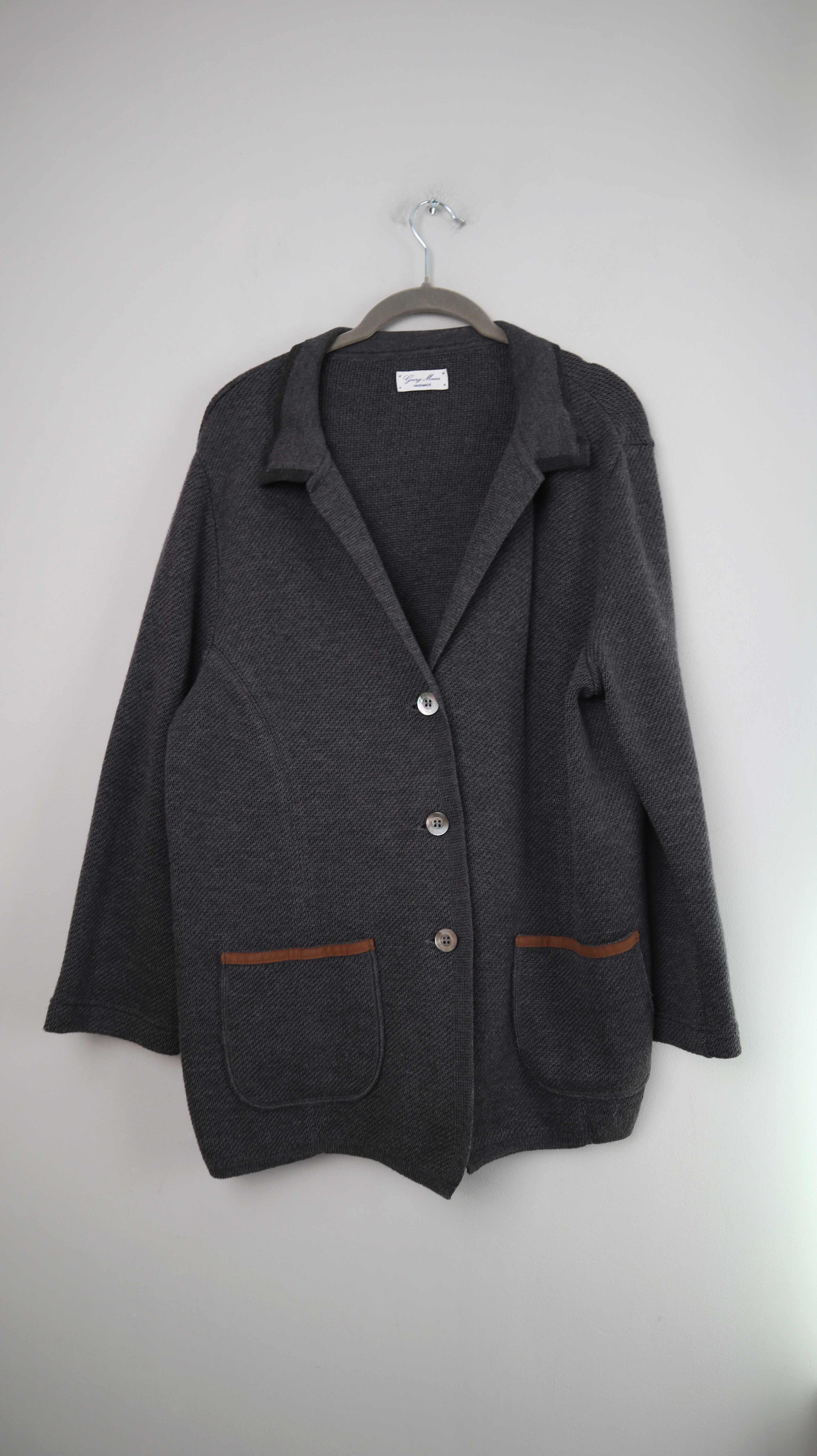 Gestrickte Graue Jacke mit Knöpfen von Georg Maier. Sie ist in 40 L und hat kleine aufgesetzte Taschen mit einem Lederrand. 50 cm Achselweite und 66 cm Länge. Plus Versand