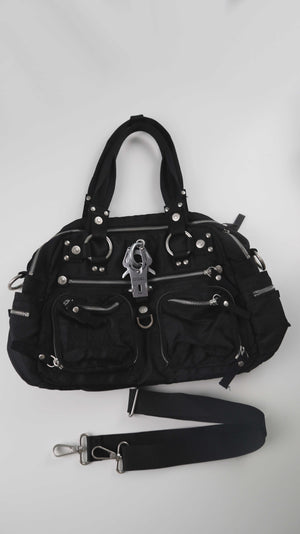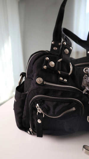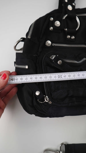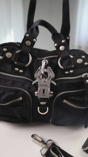 Schwarze Umhängetasche von GGL, das Modell heißt Double B. Sie hat den langen Gurt dabei. Plus Versand