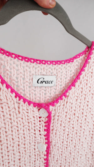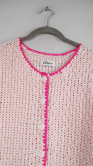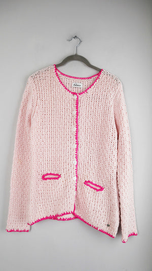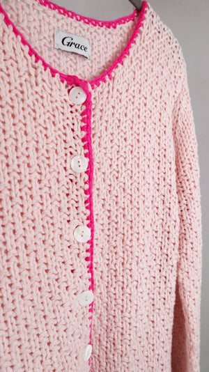 Rosa Strickjacke von Grace mit Backprint. 48 cm Achselweite und 57 cm Länge. Plus Versand