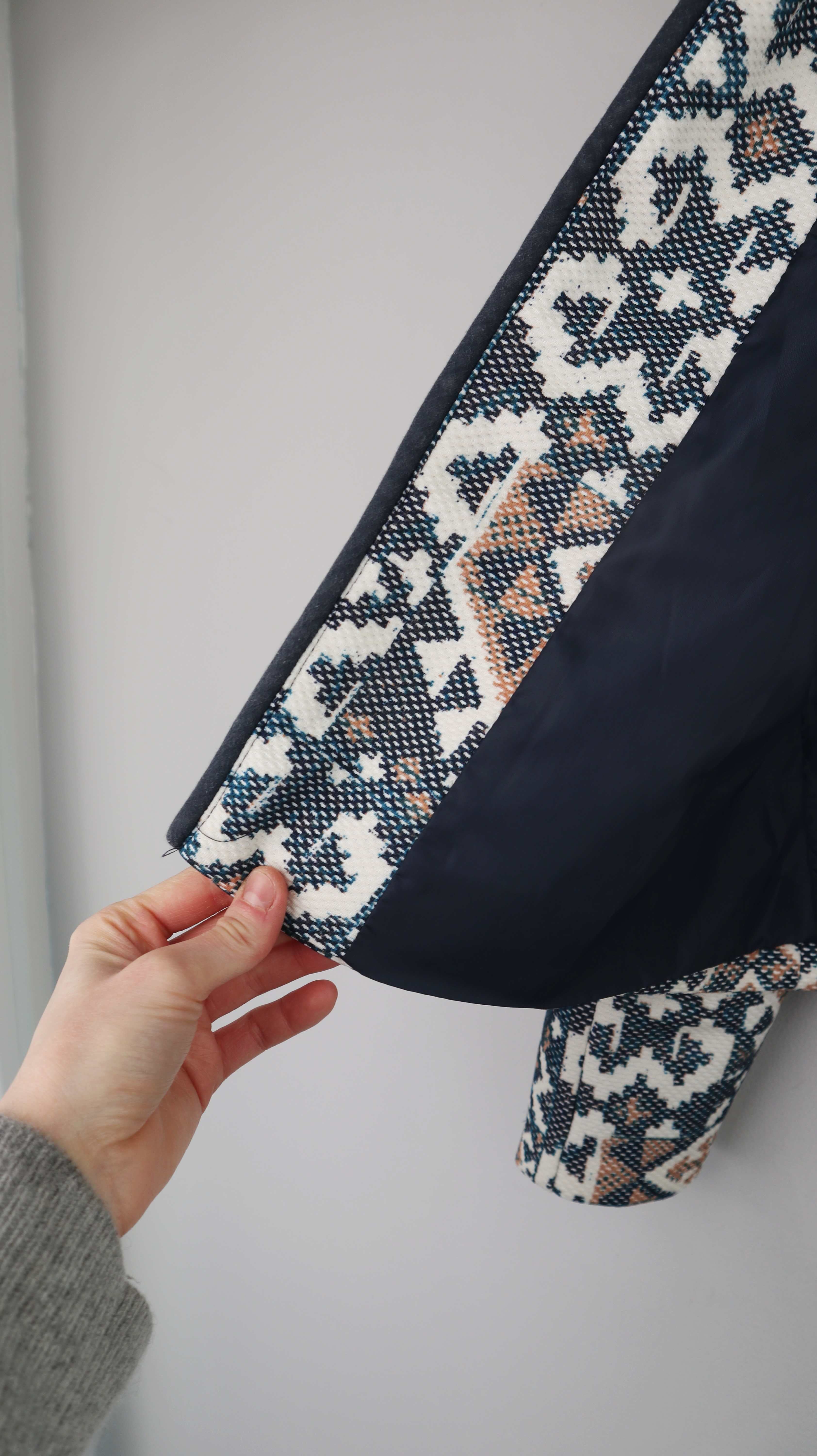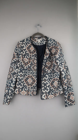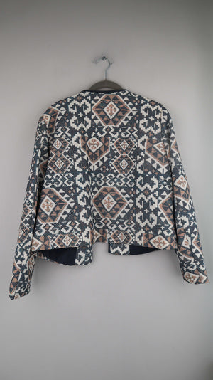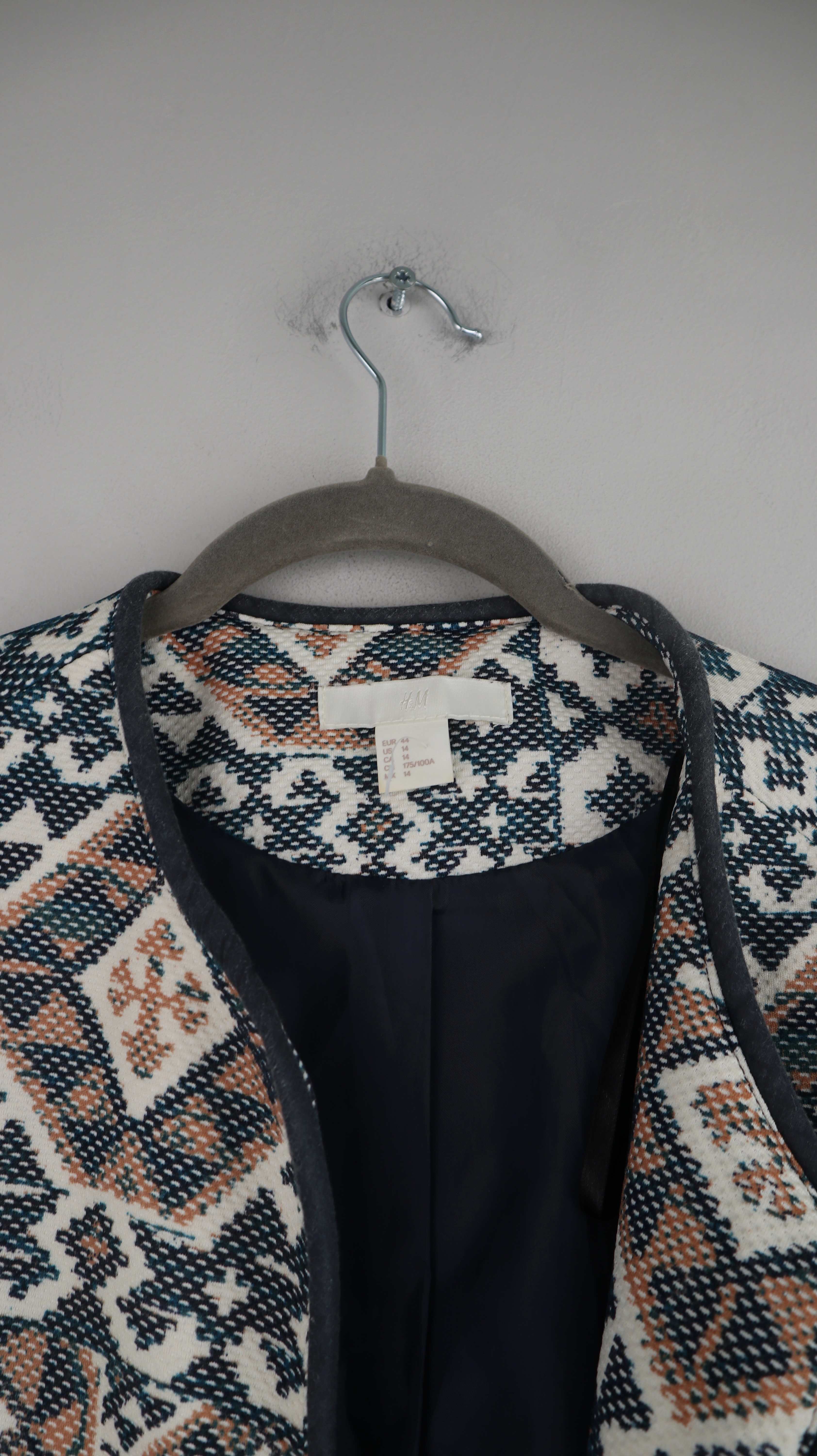 Blaue, gemusterte Jacke von H&M in Größe 44. 45 cm Achselweite und 53 cm Länge. Plus Versand