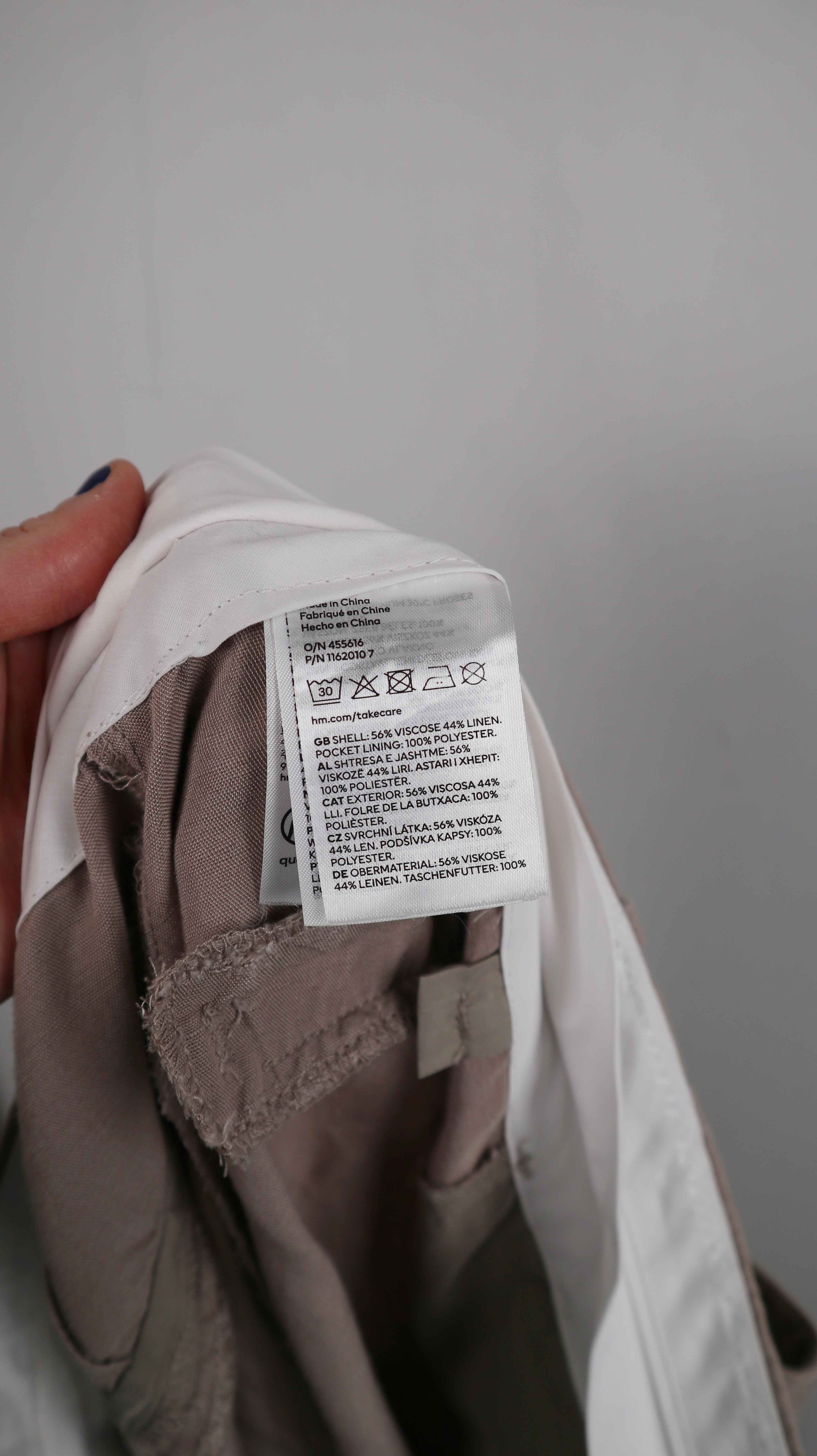 Beige Hose von H&M in Größe 40 L. Sie ist mit Leinen und hat oben am Bund einen kleinen Verarbeitungsfehler an der Naht. 41 cm Bundweite, 24 cm Schritthöhe und 71 cm Innenbeinlänge. Plus Versand