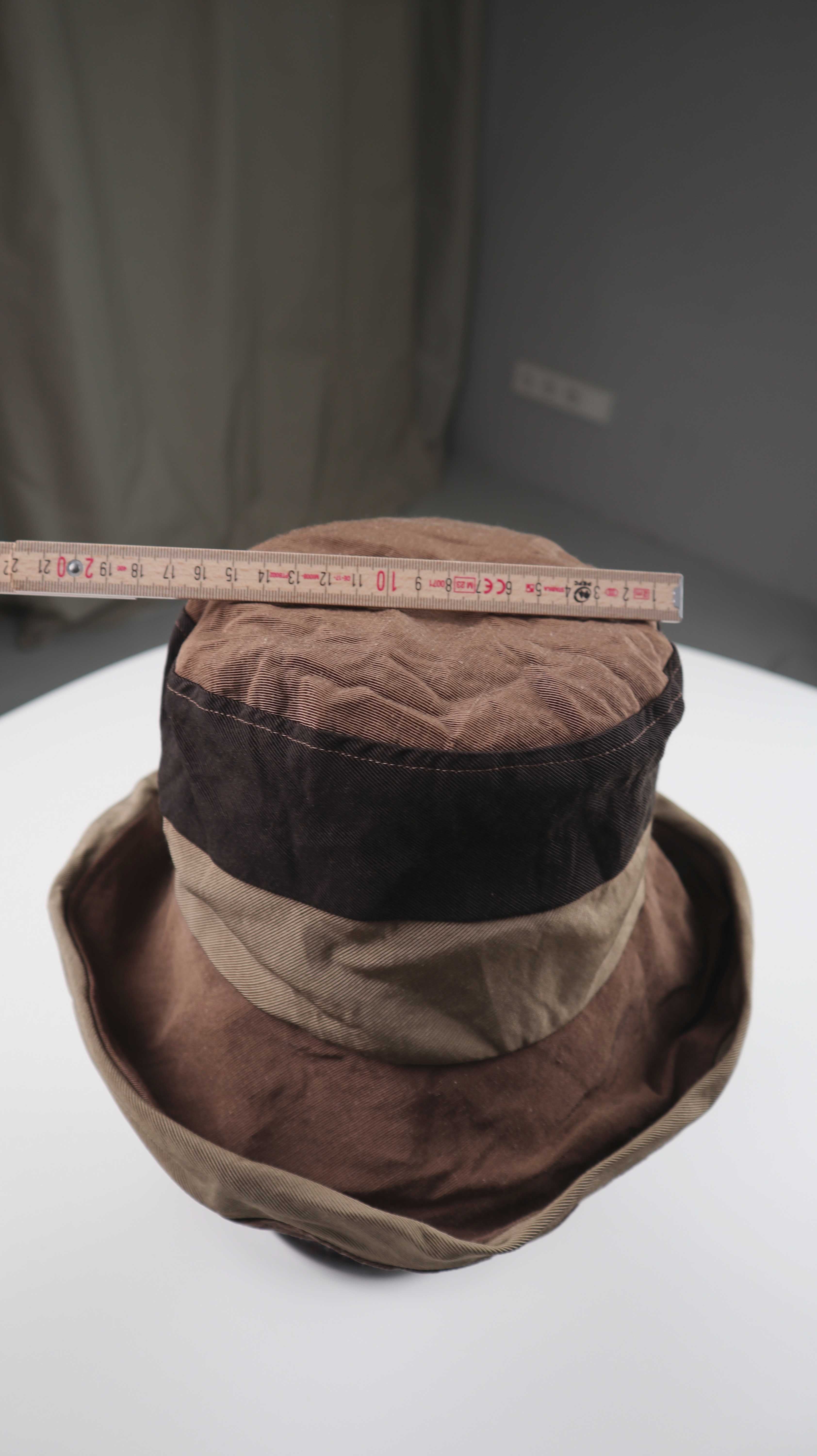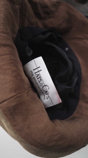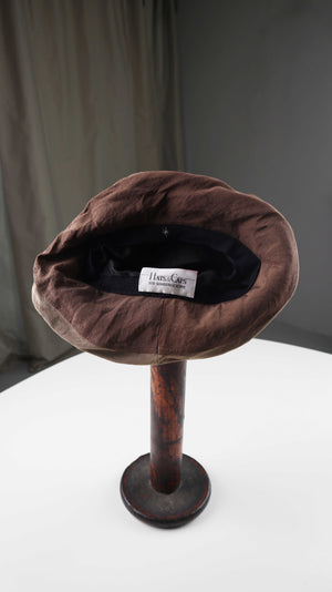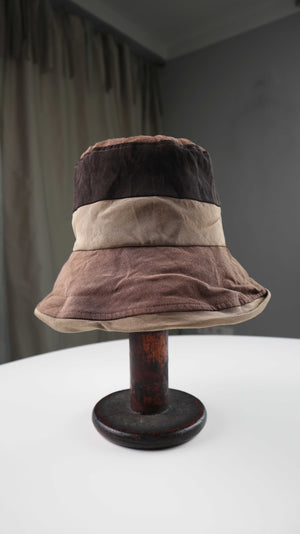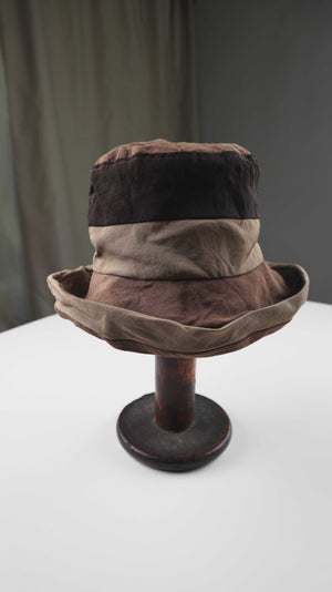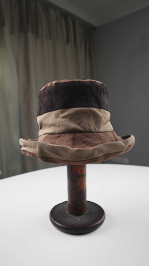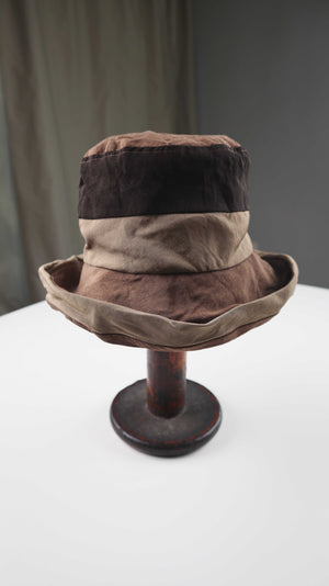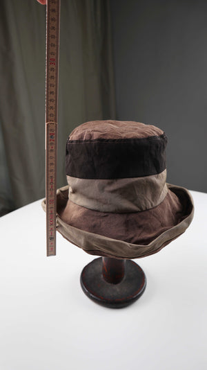 Brauner Hut mit Krempe aus Stoff. Er ist von Hats & Caps, einem hamburger Label. Plus Versand