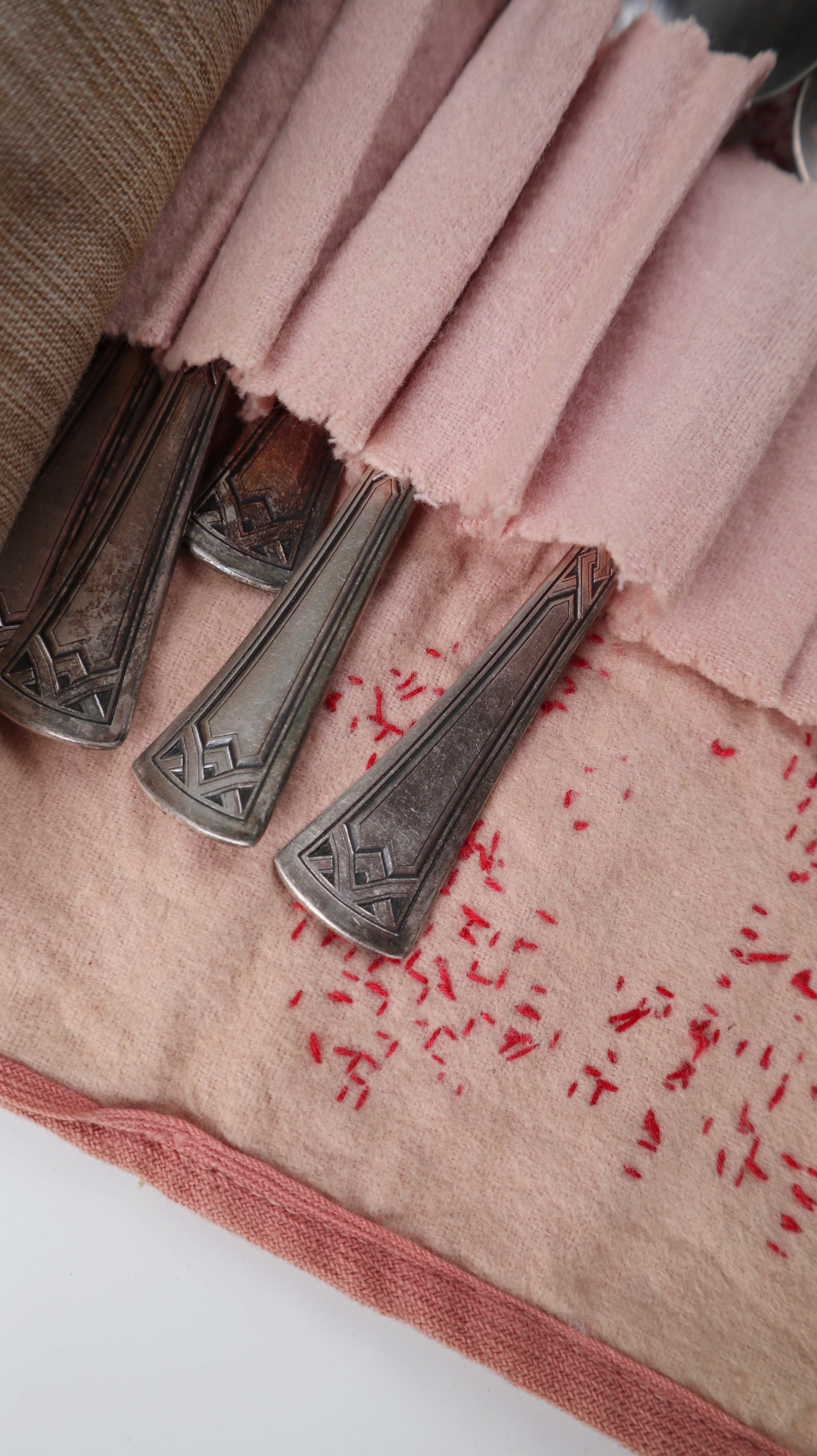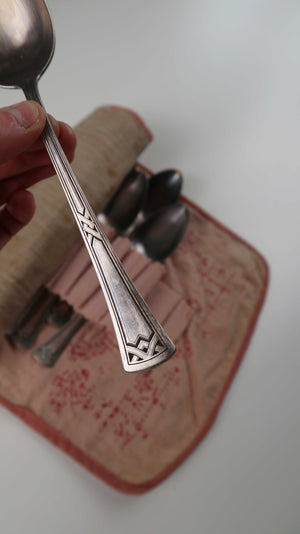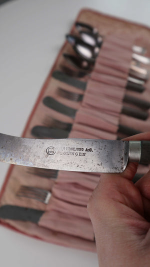 Versilbertes Besteckset in der Originalverpackung. Etwa von 1930. Hersteller Hermann Konejung Ag Solingen, für sechs Personen vollständig. Es ist in einem guten Zustand und weist Patina auf. Plus Versand
