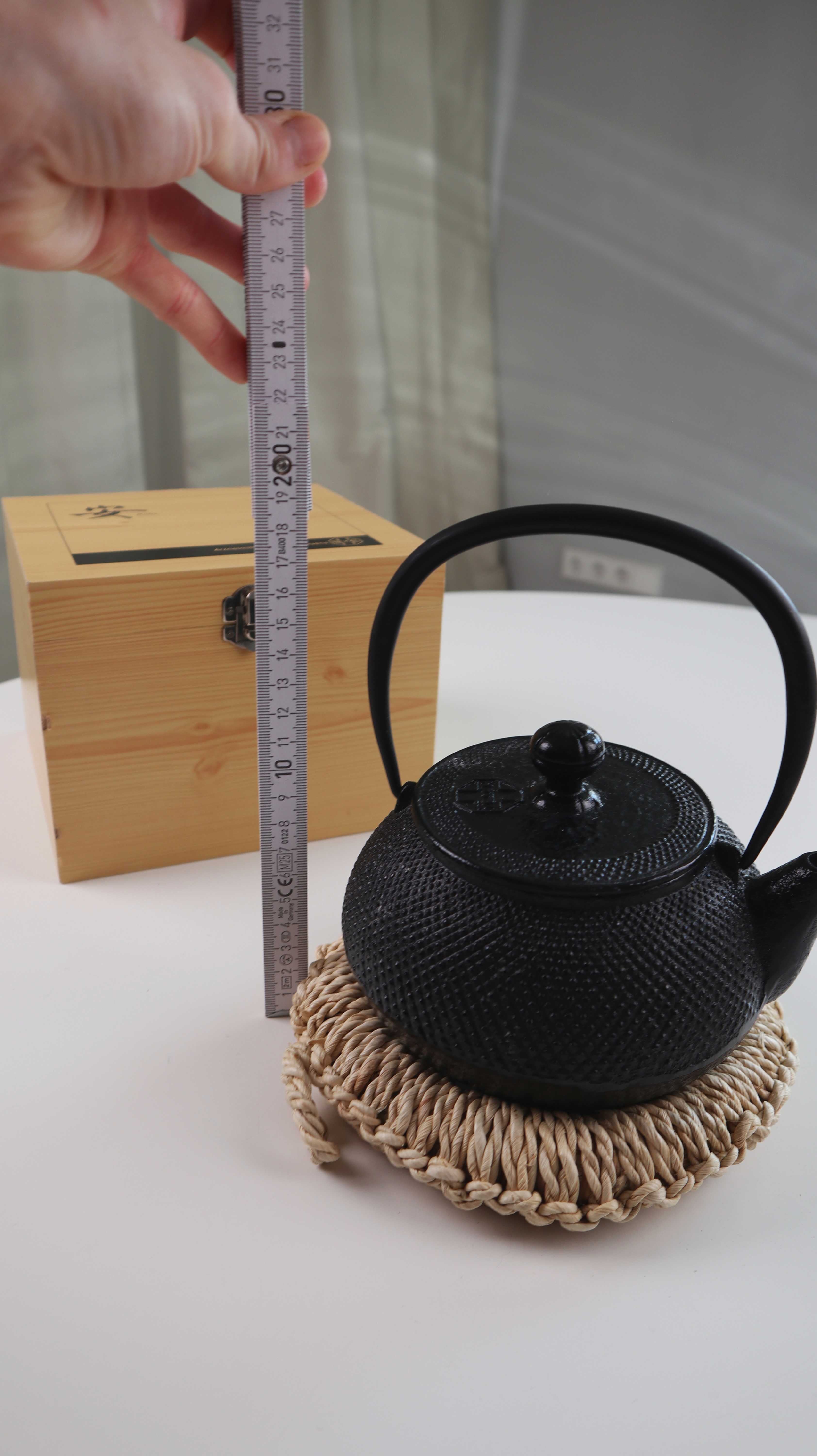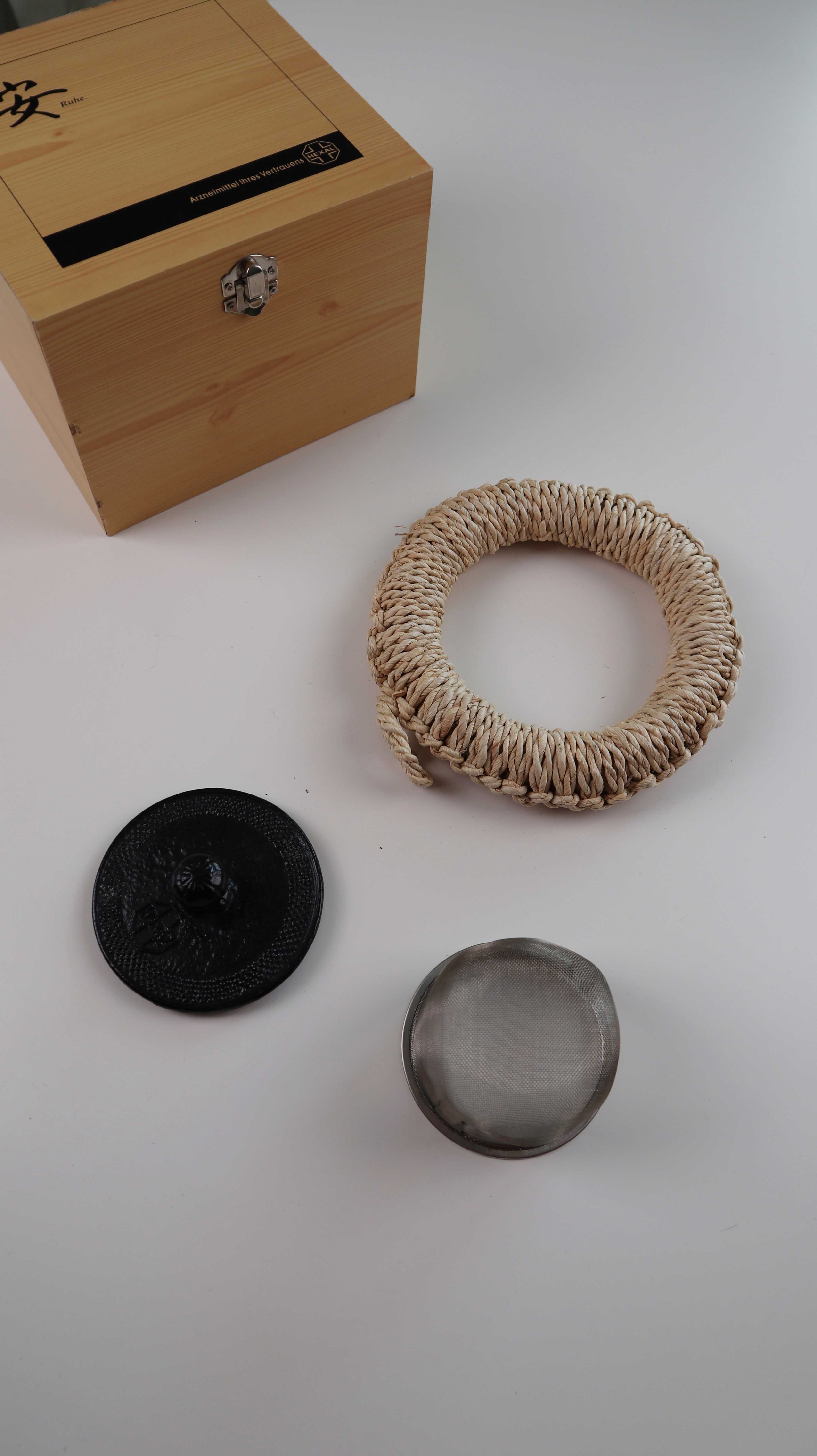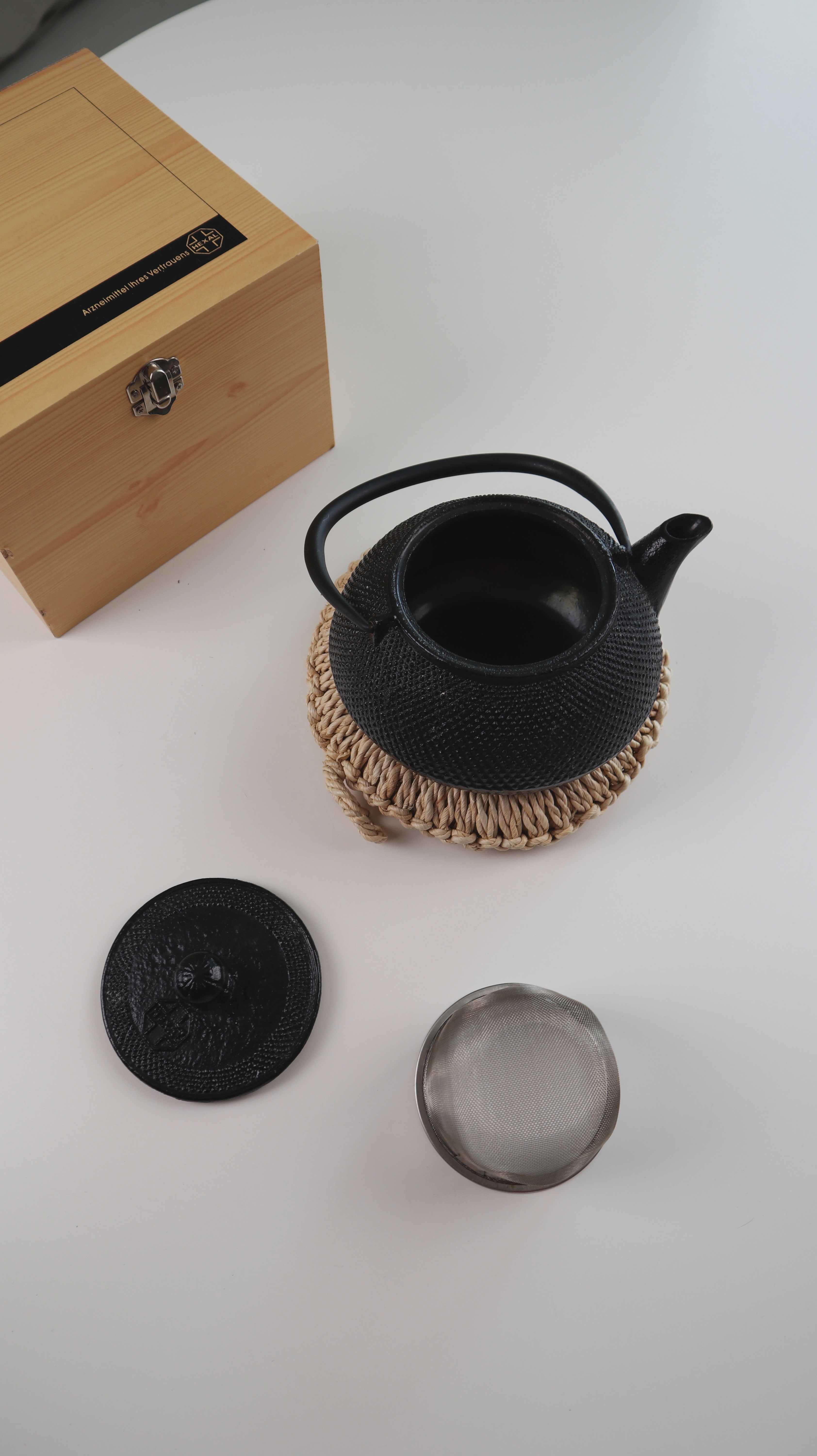 Neue Teekanne mit einer Holzbox und einem Untersetzer für die Kanne. Plus Versand