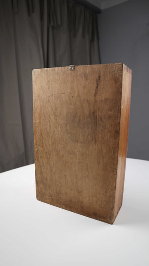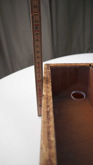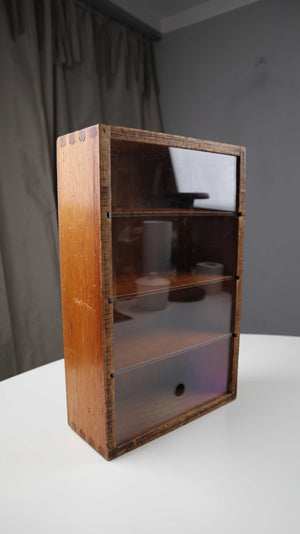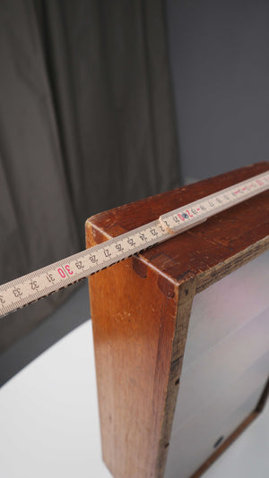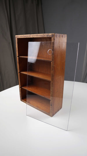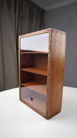 Kleiner Holzschrank mit einer Plexiglasscheibe. Er ist original Vintage und wurde in einer Firma für das Aufbewahren der Zeiterfassungen benutzt. Plus Versand