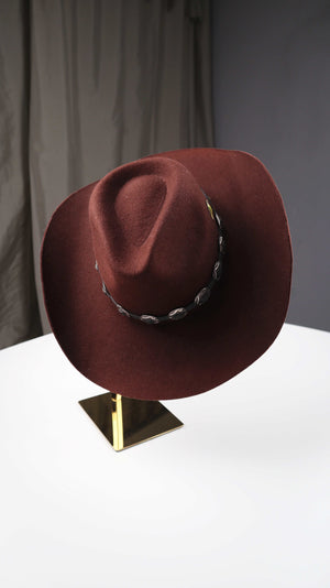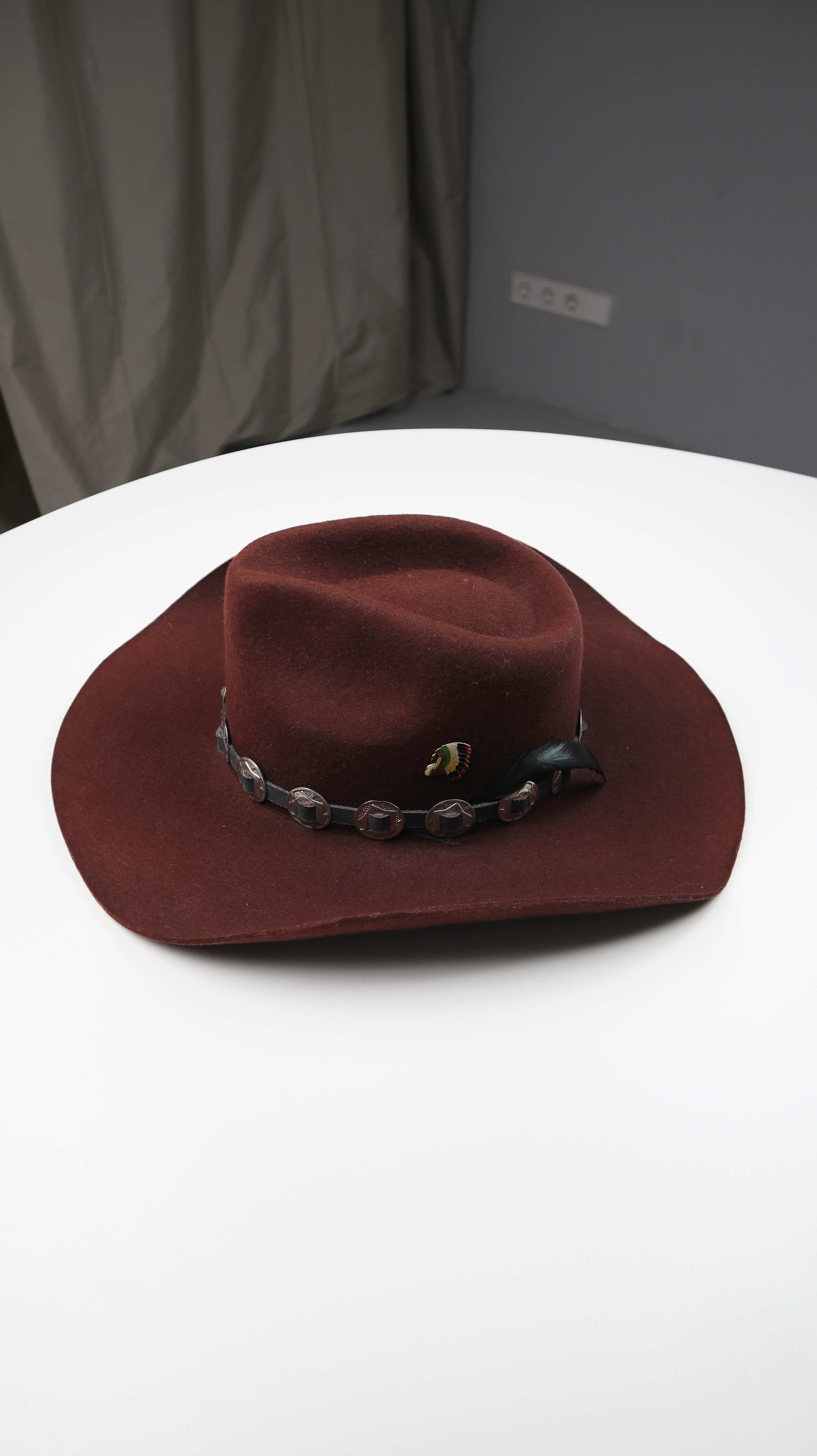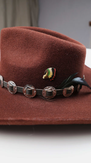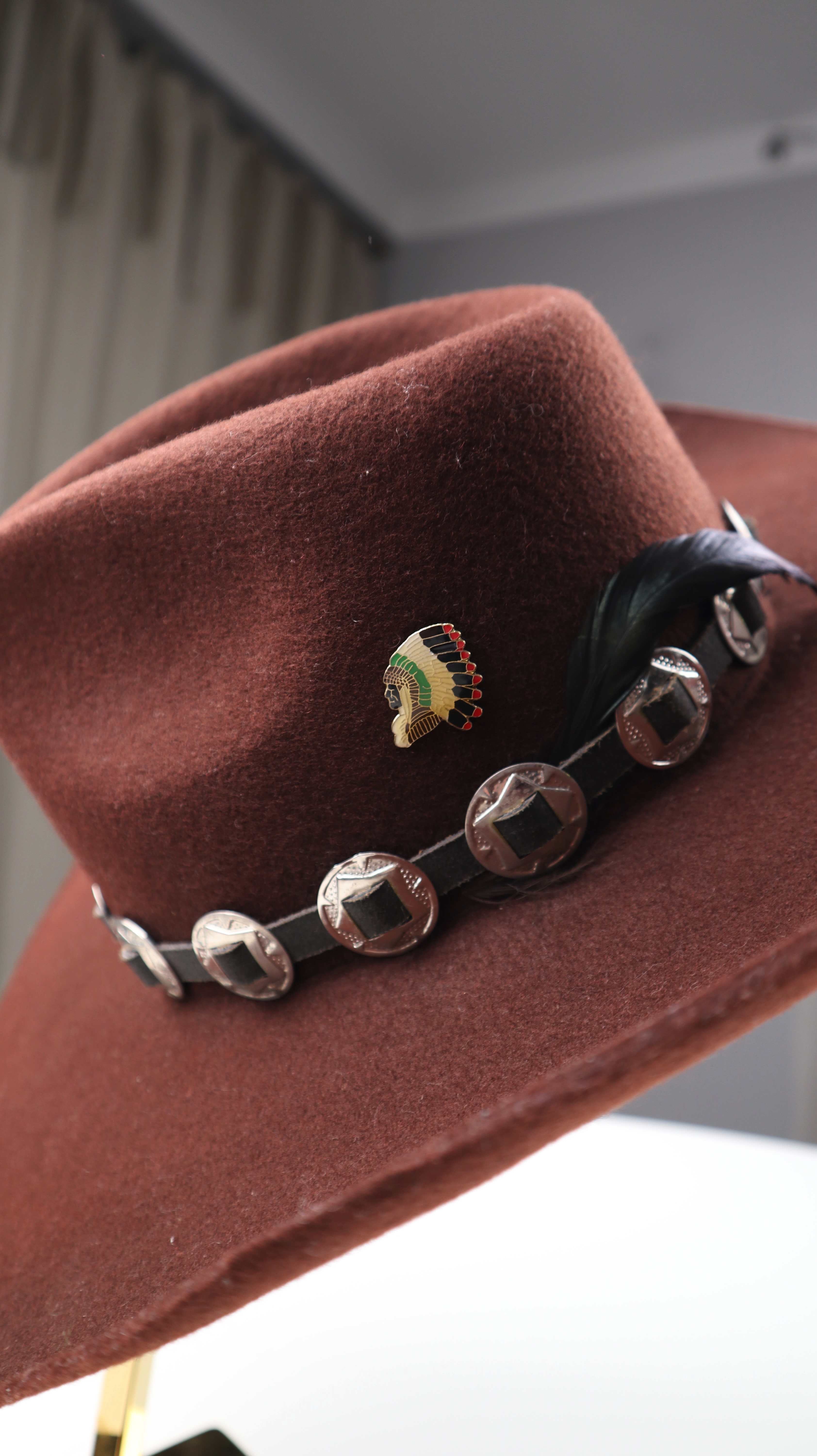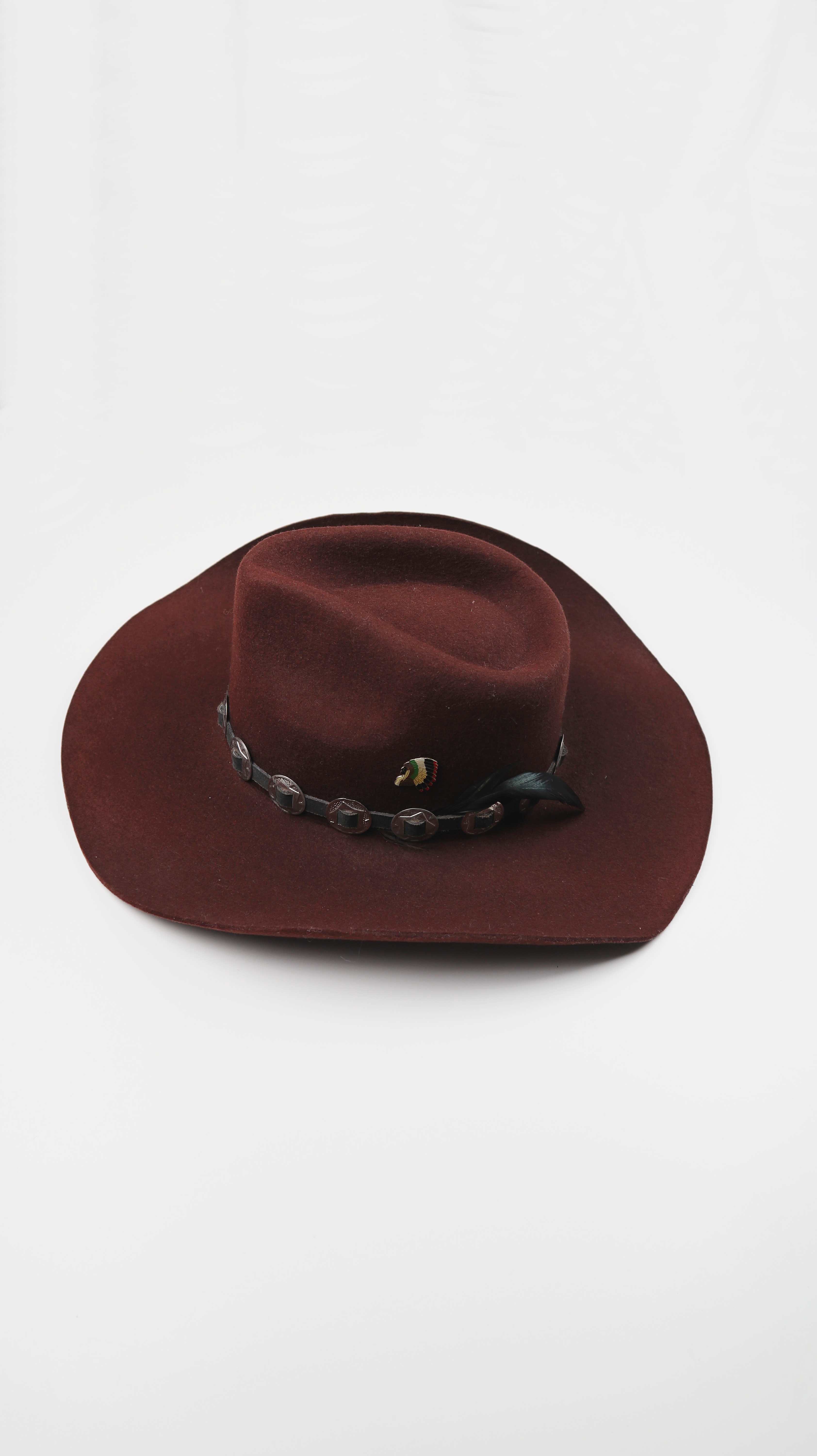 Dunkelbrauner Hut aus Wolle im Western Stil. Er ist in Größe 56, Vintage und hat einen kleinen Indianerbutton. Plus Versand
